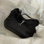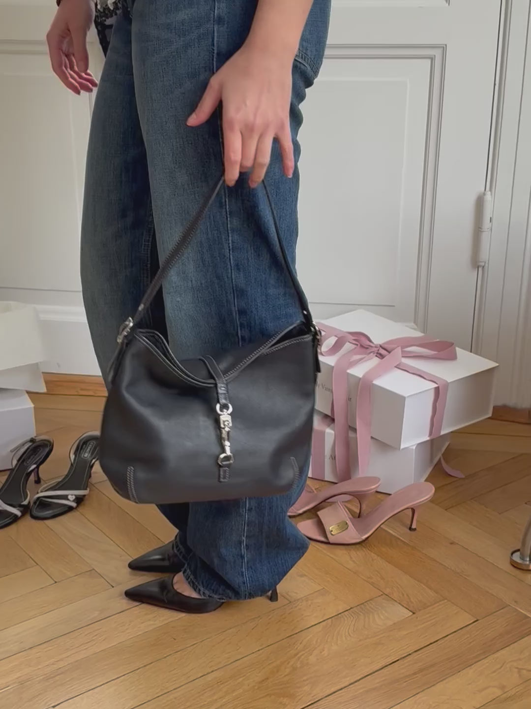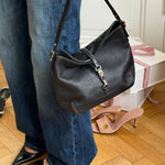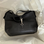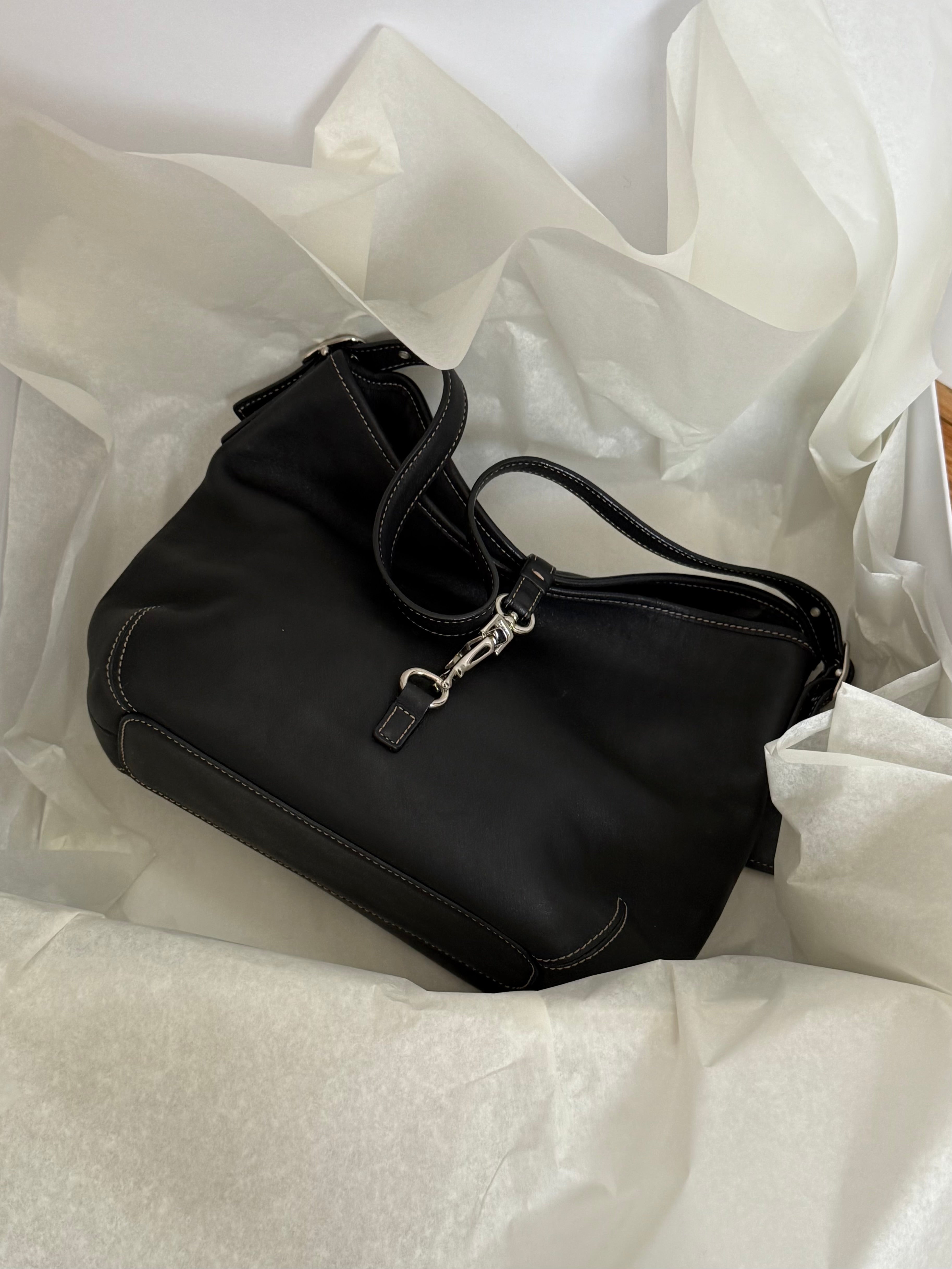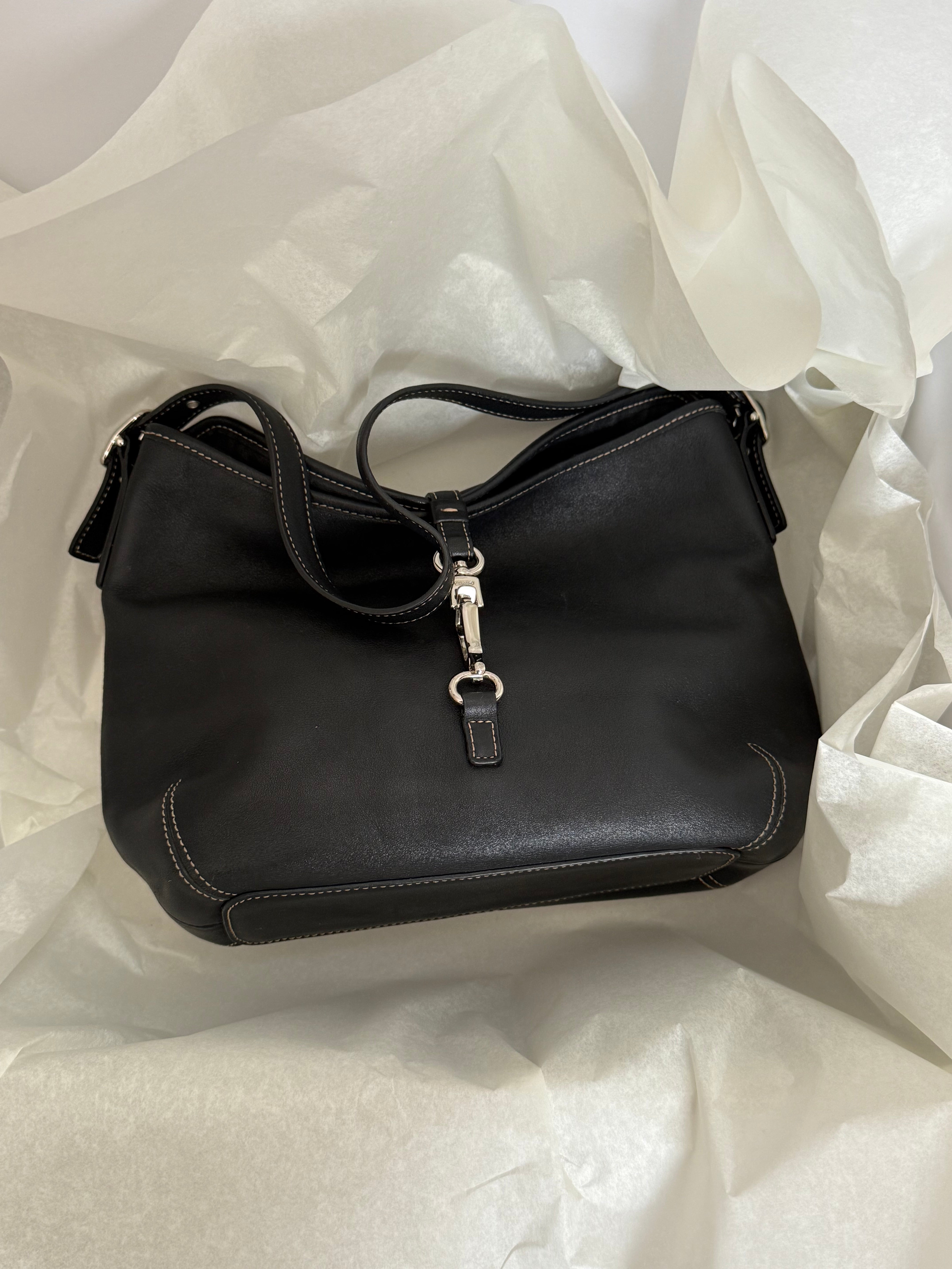Vintage shoulder bag from Coach in black leather. Featuring white stitching and silver-tone hardware.