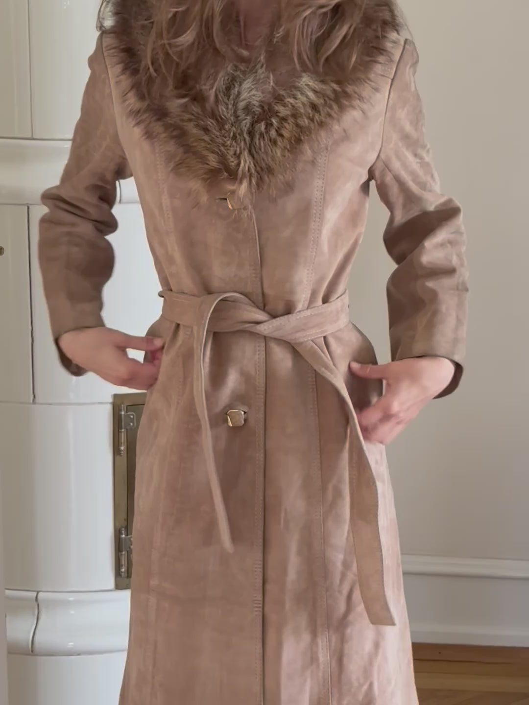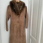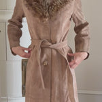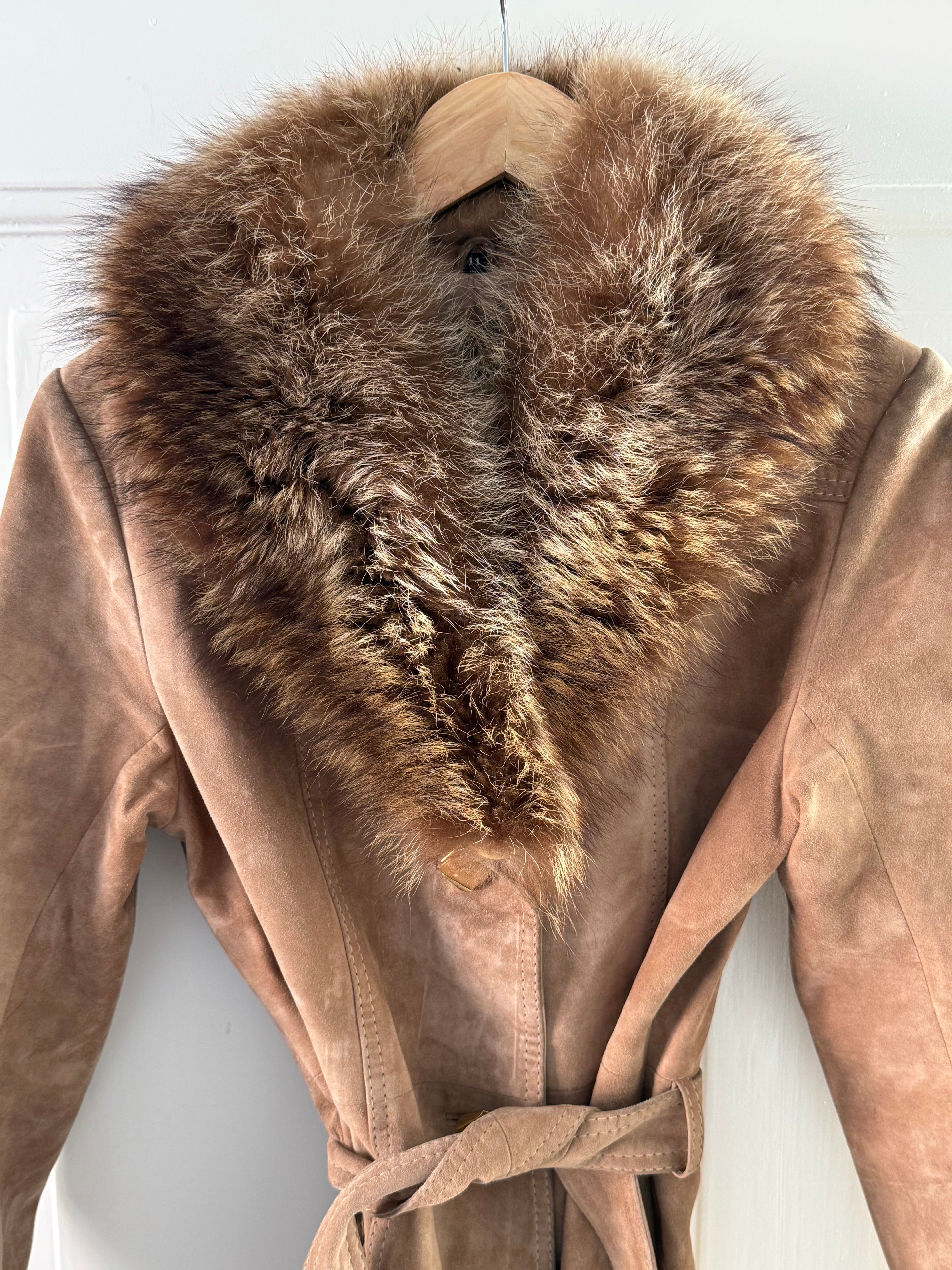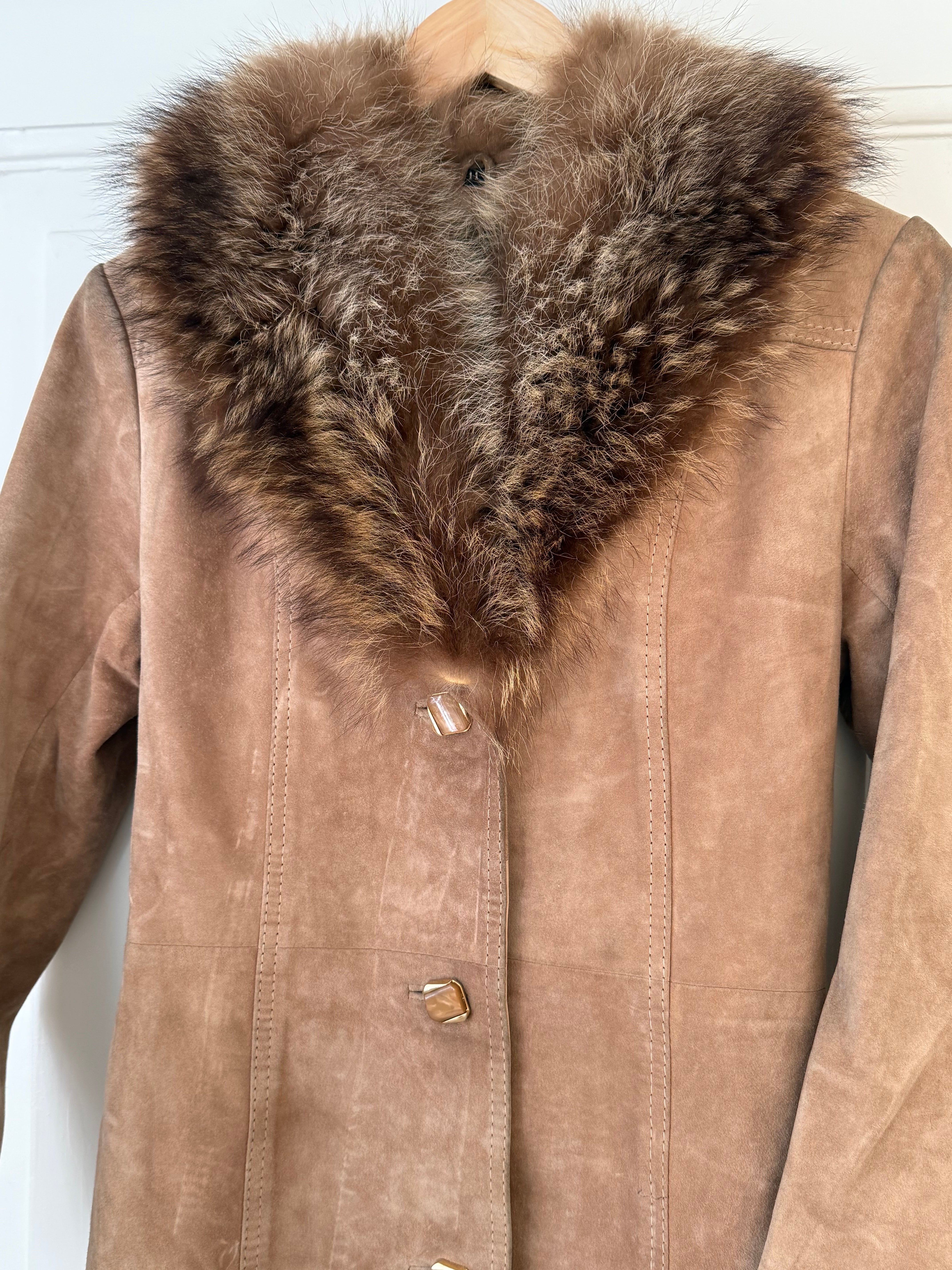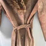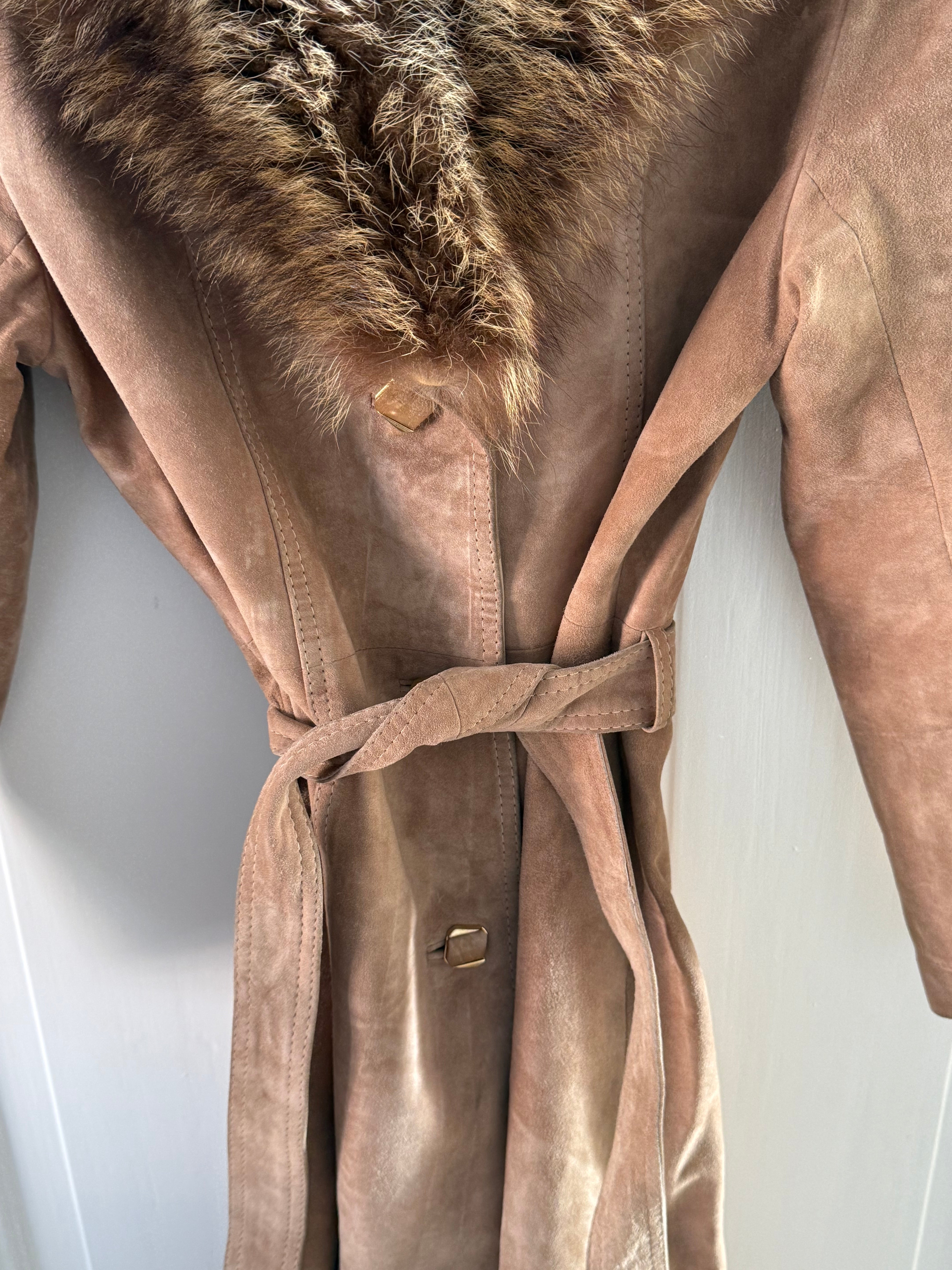Beautiful vintage Penny Lane Coat by La Nap & Co in suede and fur, in a beautiful light brown shade. Features a fur collar, a fitted waistband, and gold-detailed buttons down the front. In good vintage condition.
