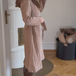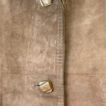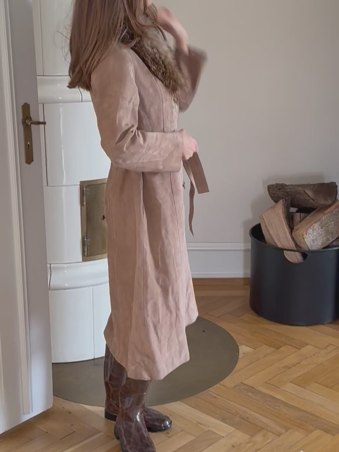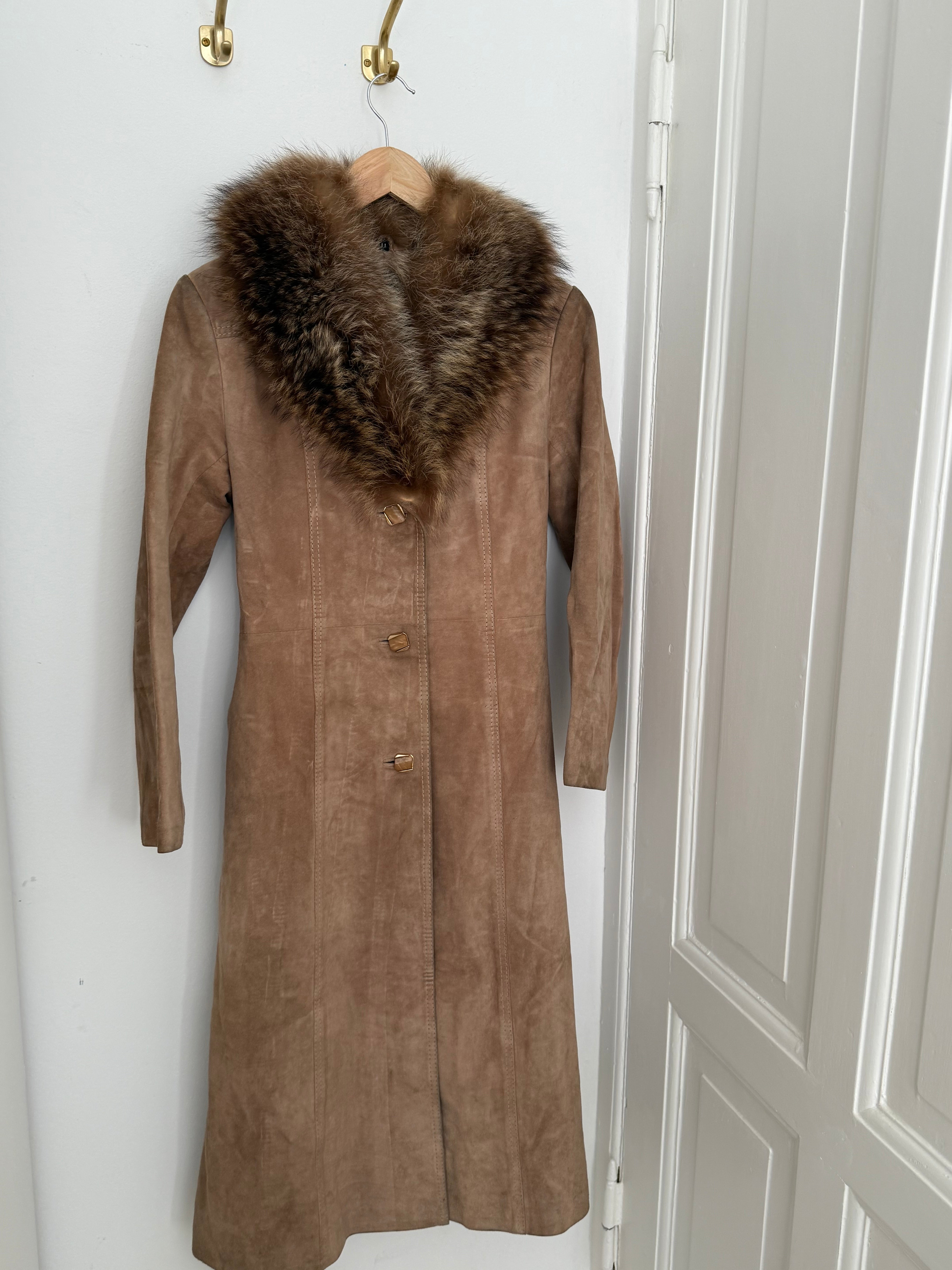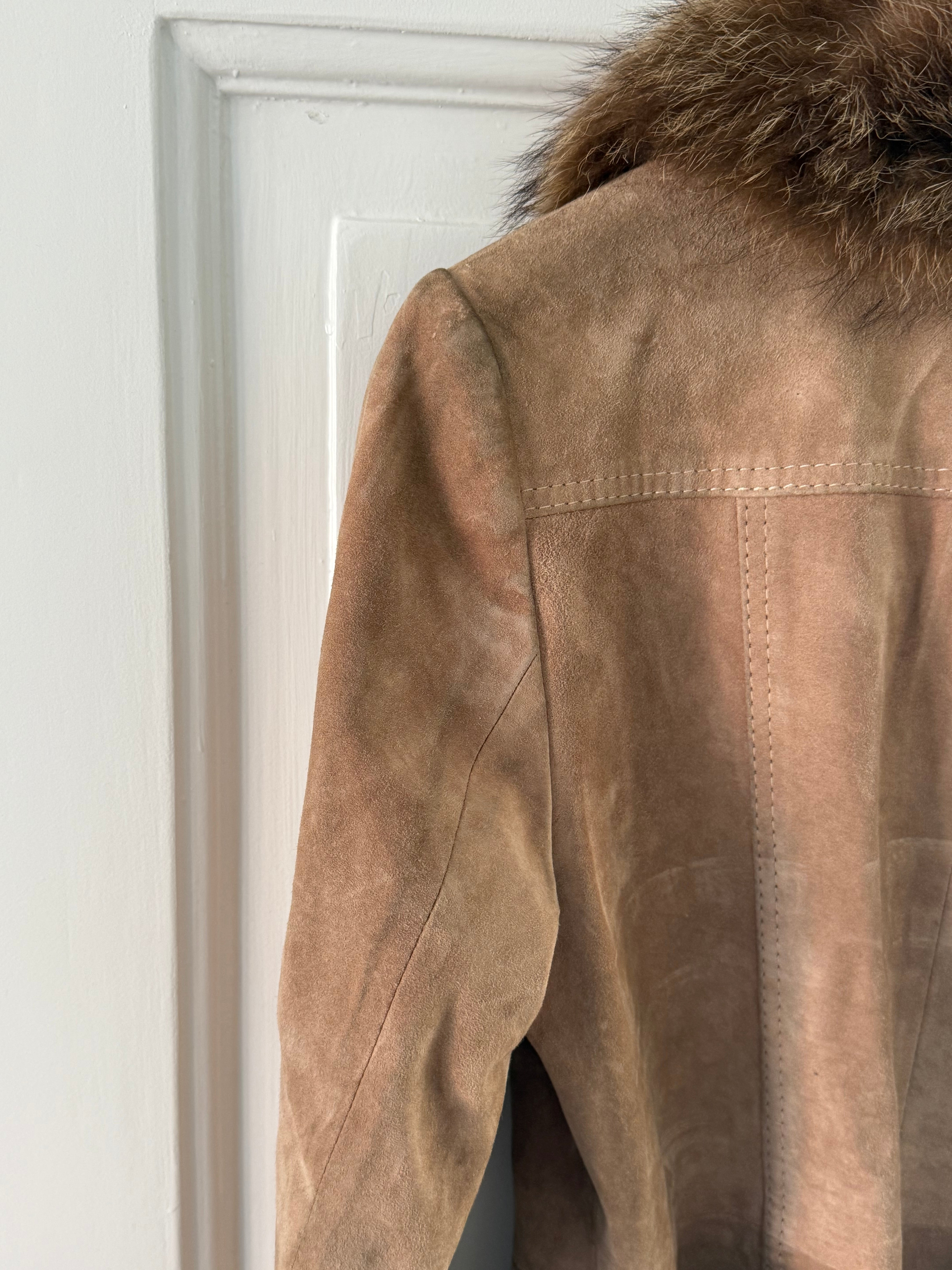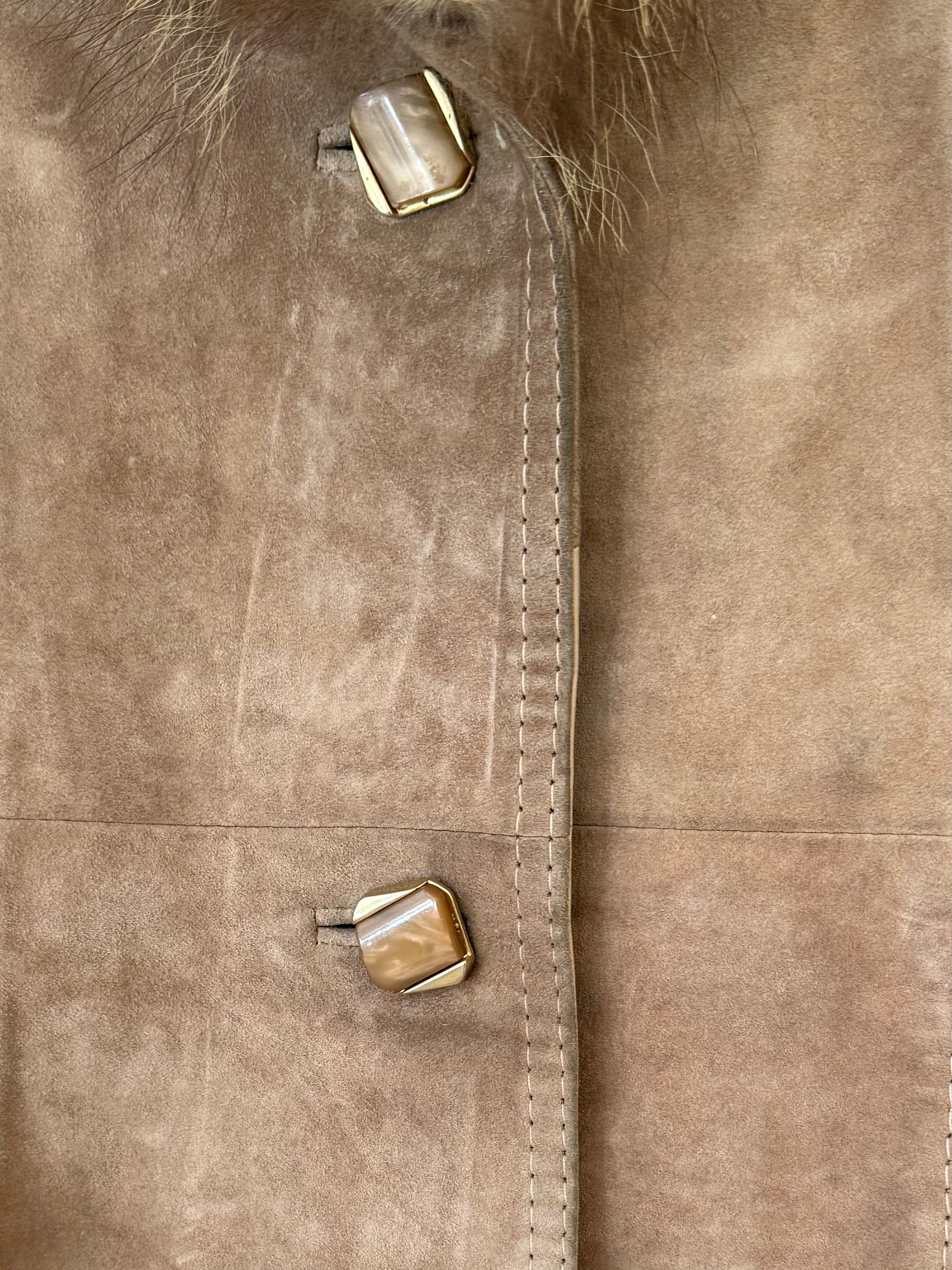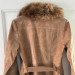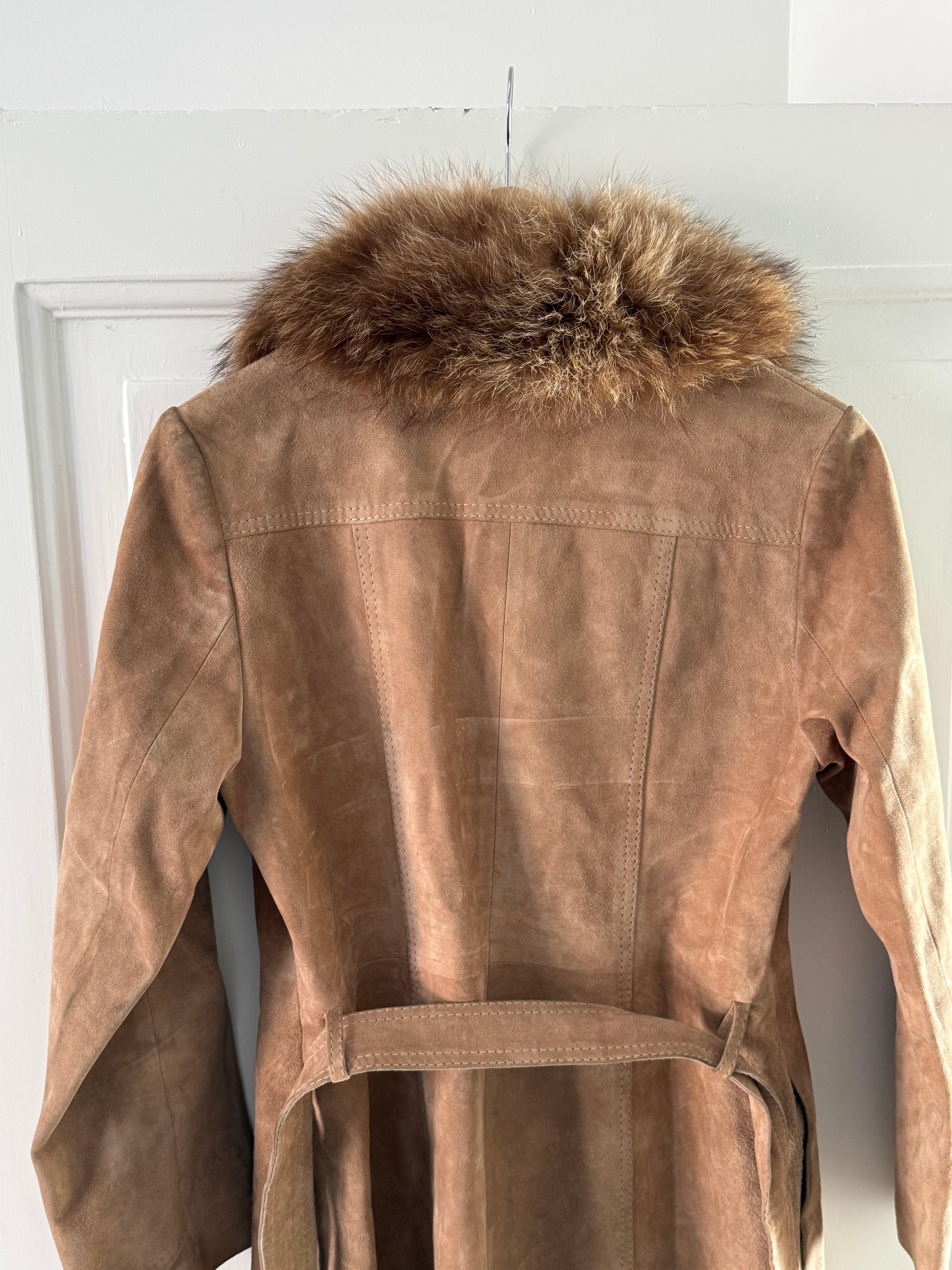 Beautiful vintage Penny Lane Coat by La Nap & Co in suede and fur, in a beautiful light brown shade. Features a fur collar, a fitted waistband, and gold-detailed buttons down the front. In good vintage condition.