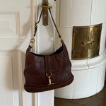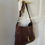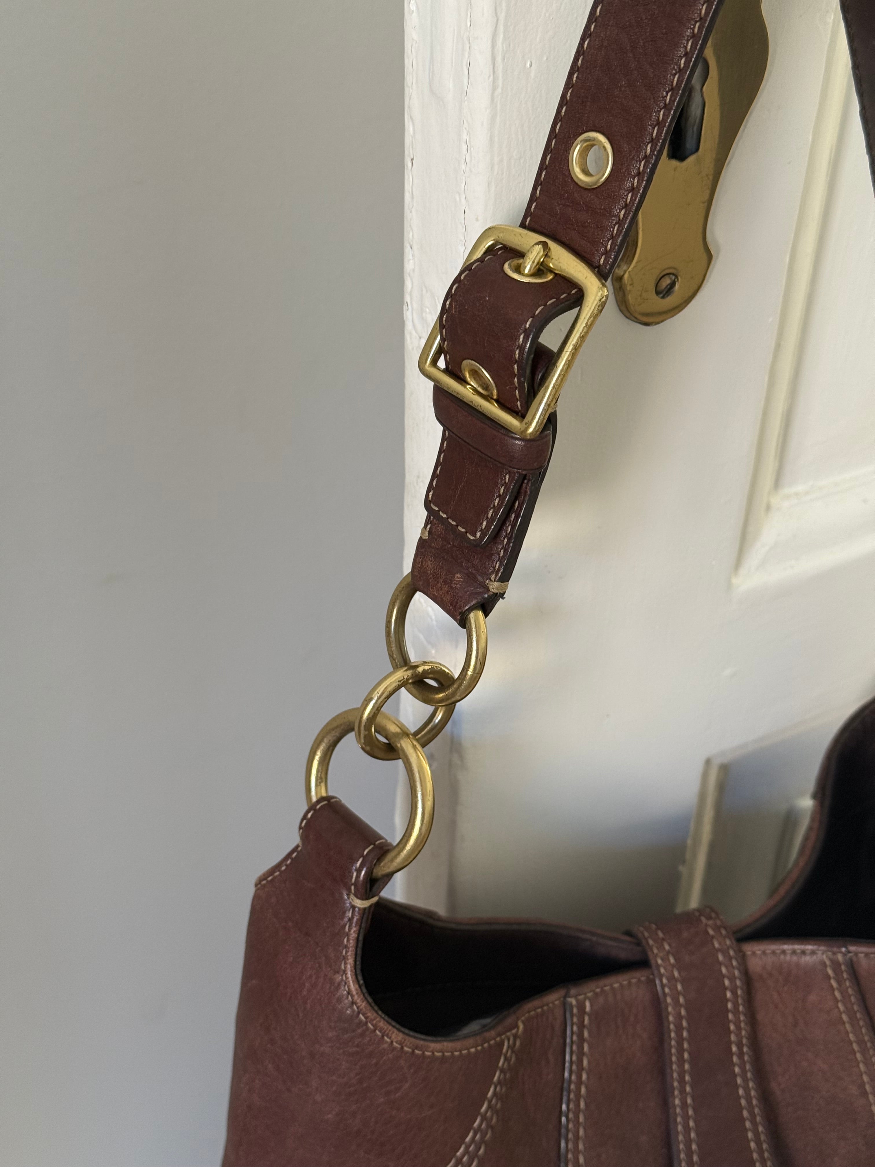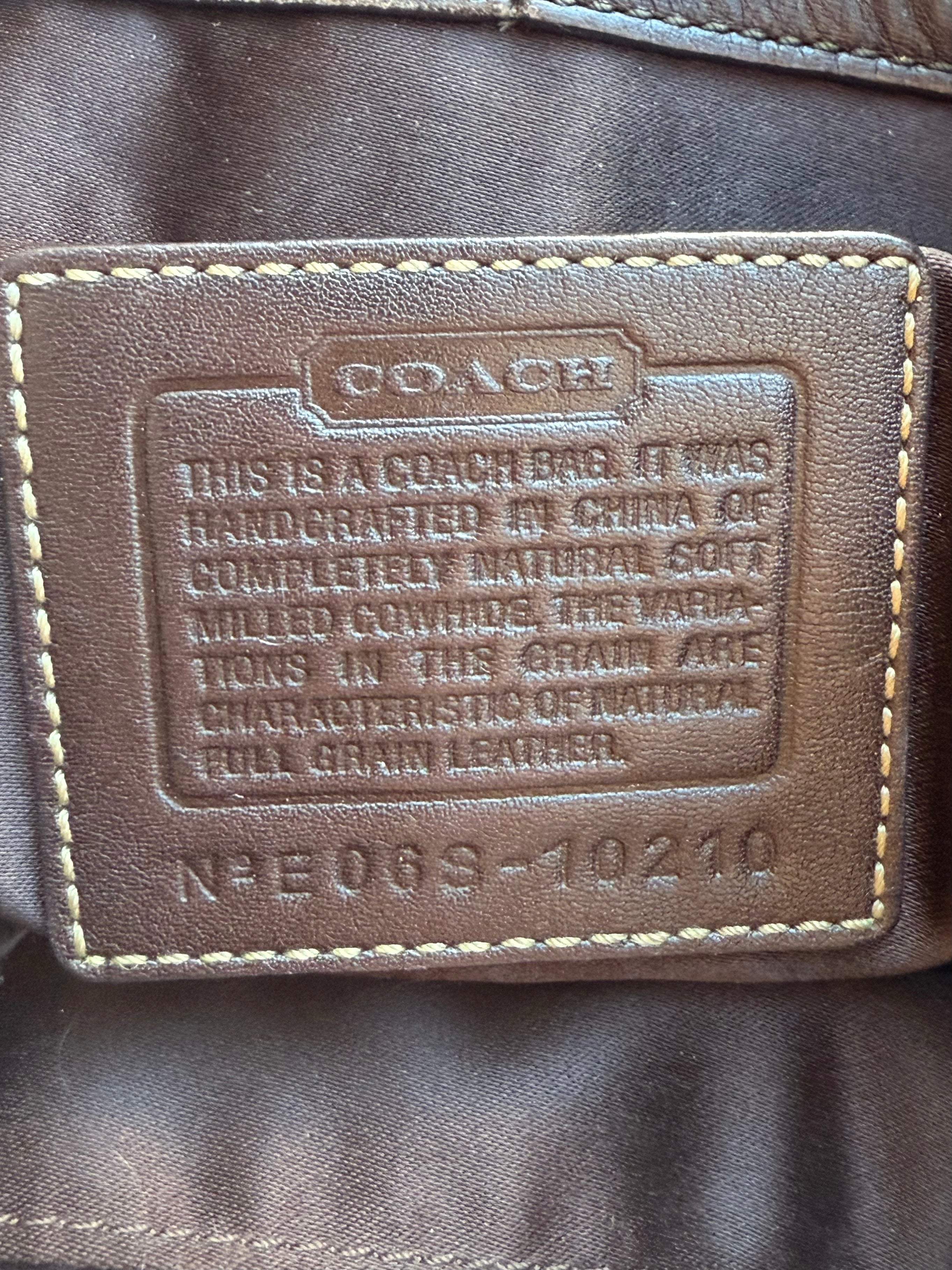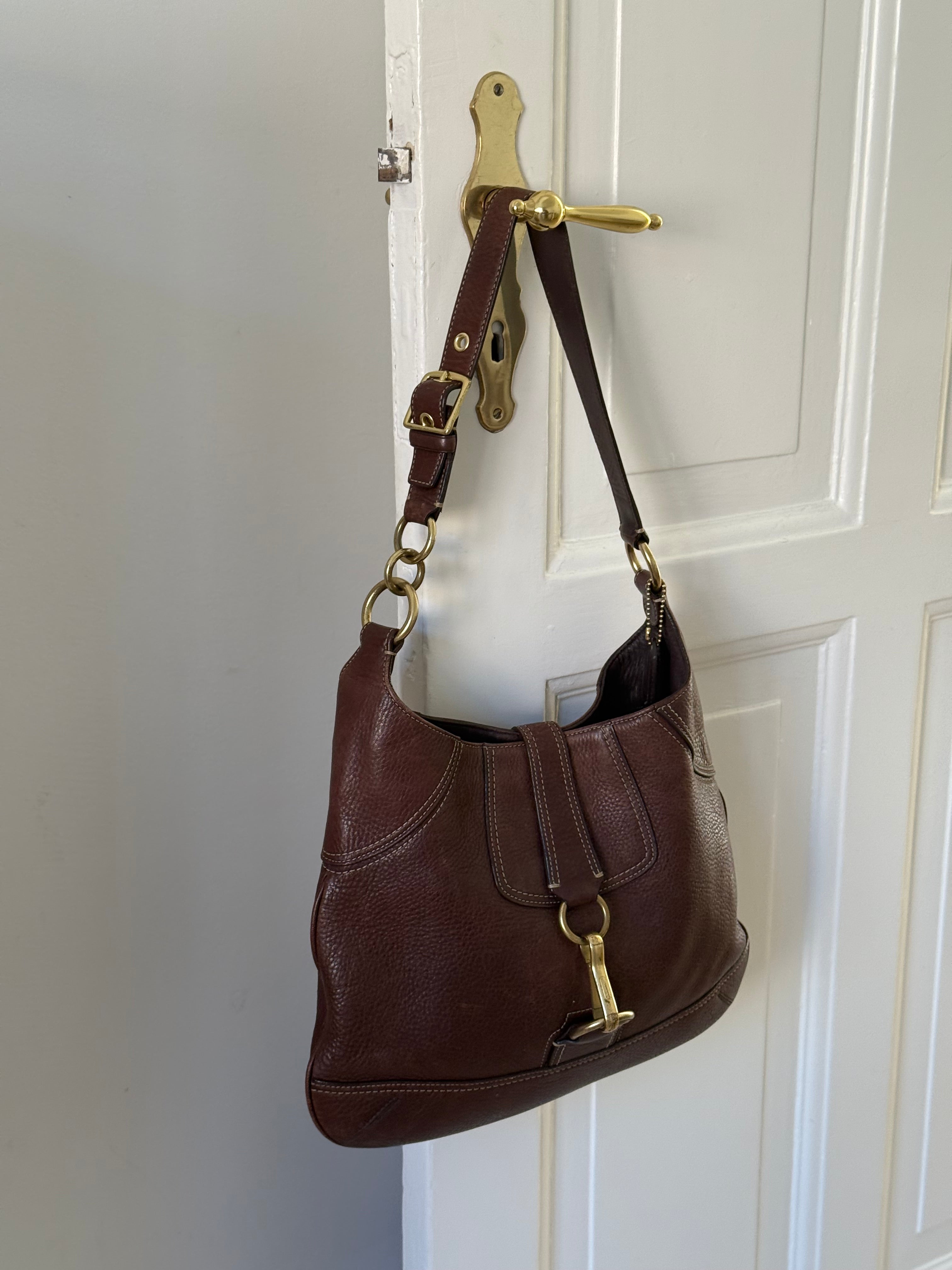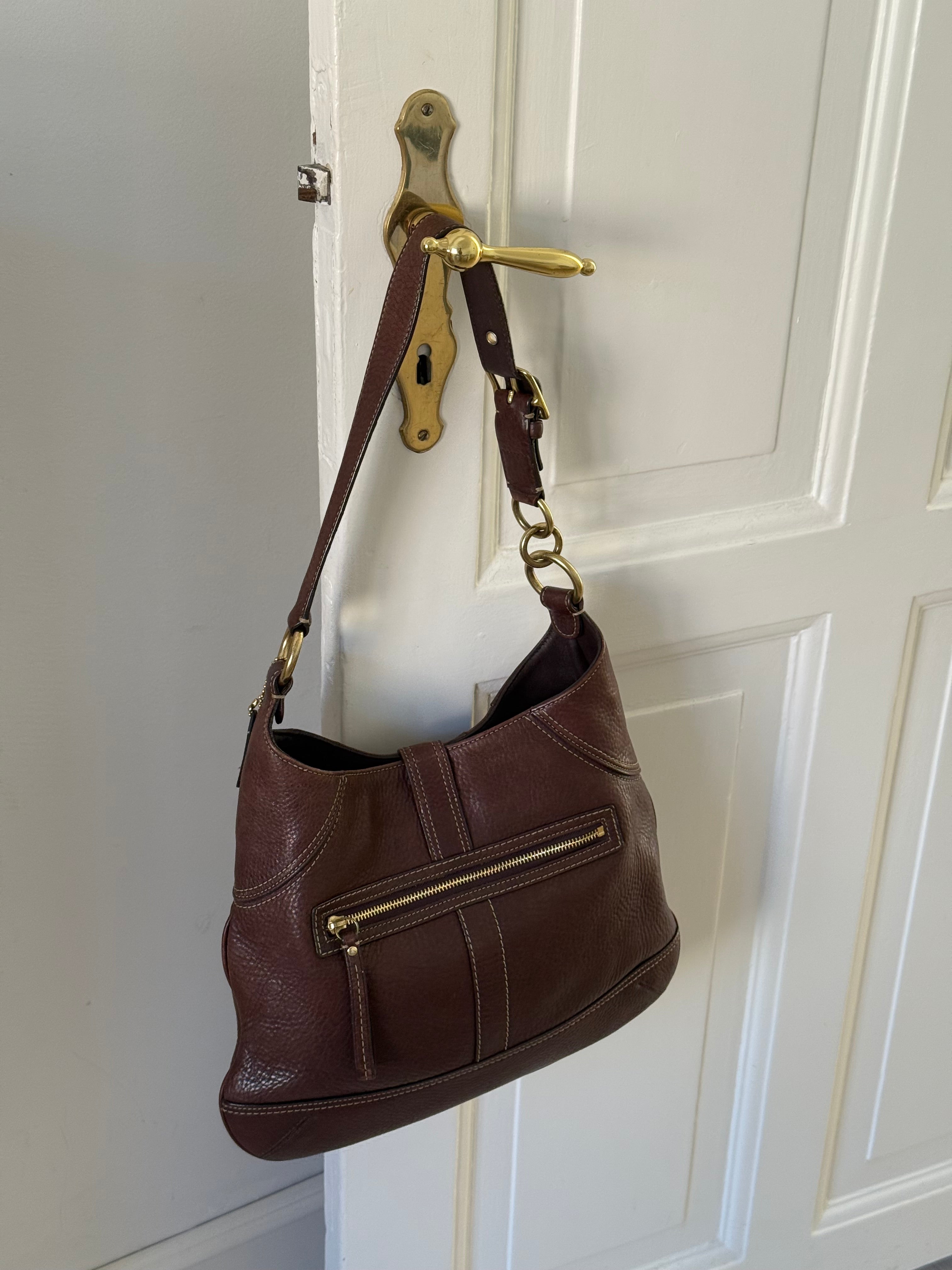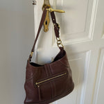 Vintage shoulder hobo bag from Coach, crafted from rich brown leather with gold-tone hardware. The bag features an interior zippered pocket.
