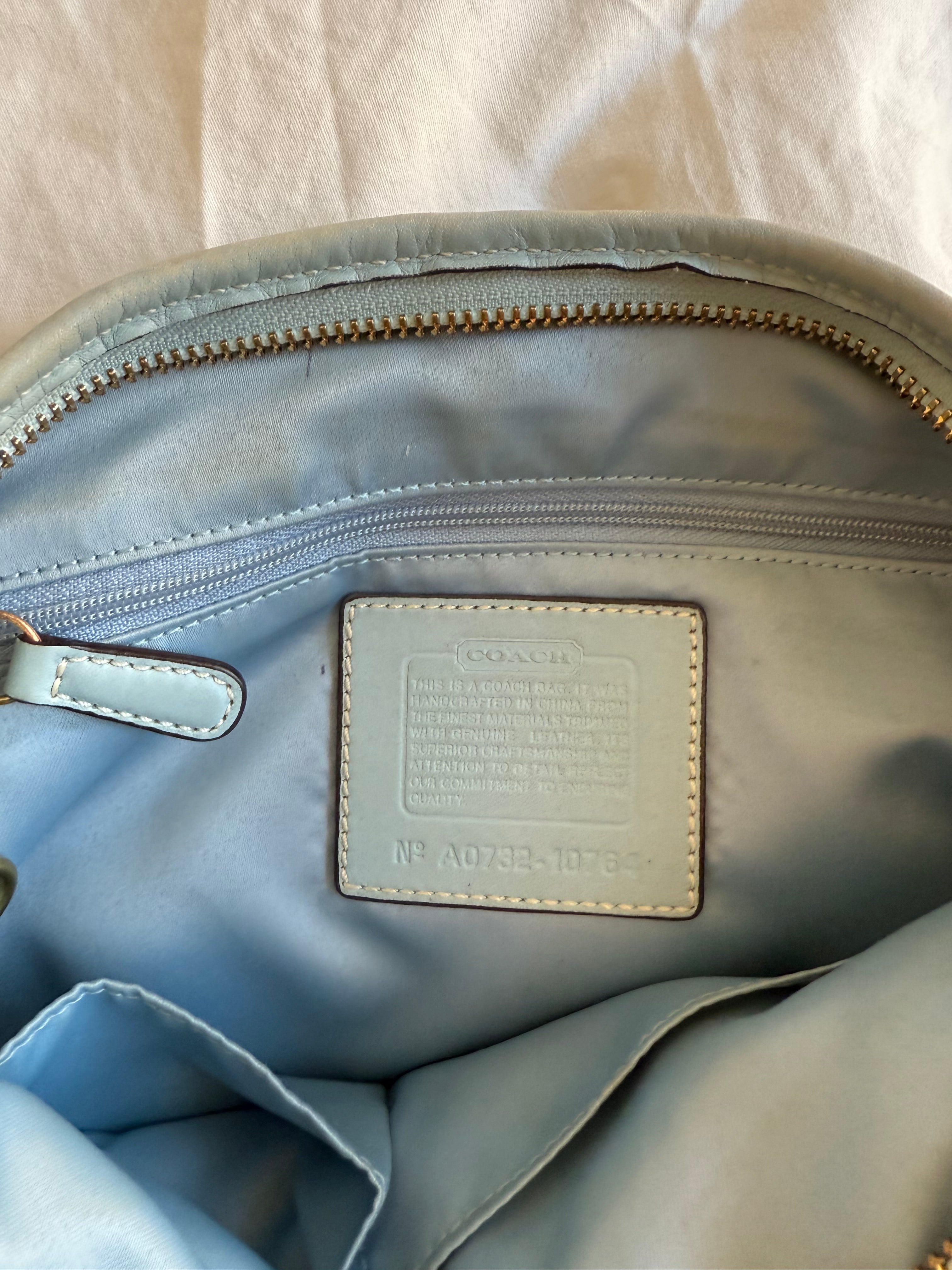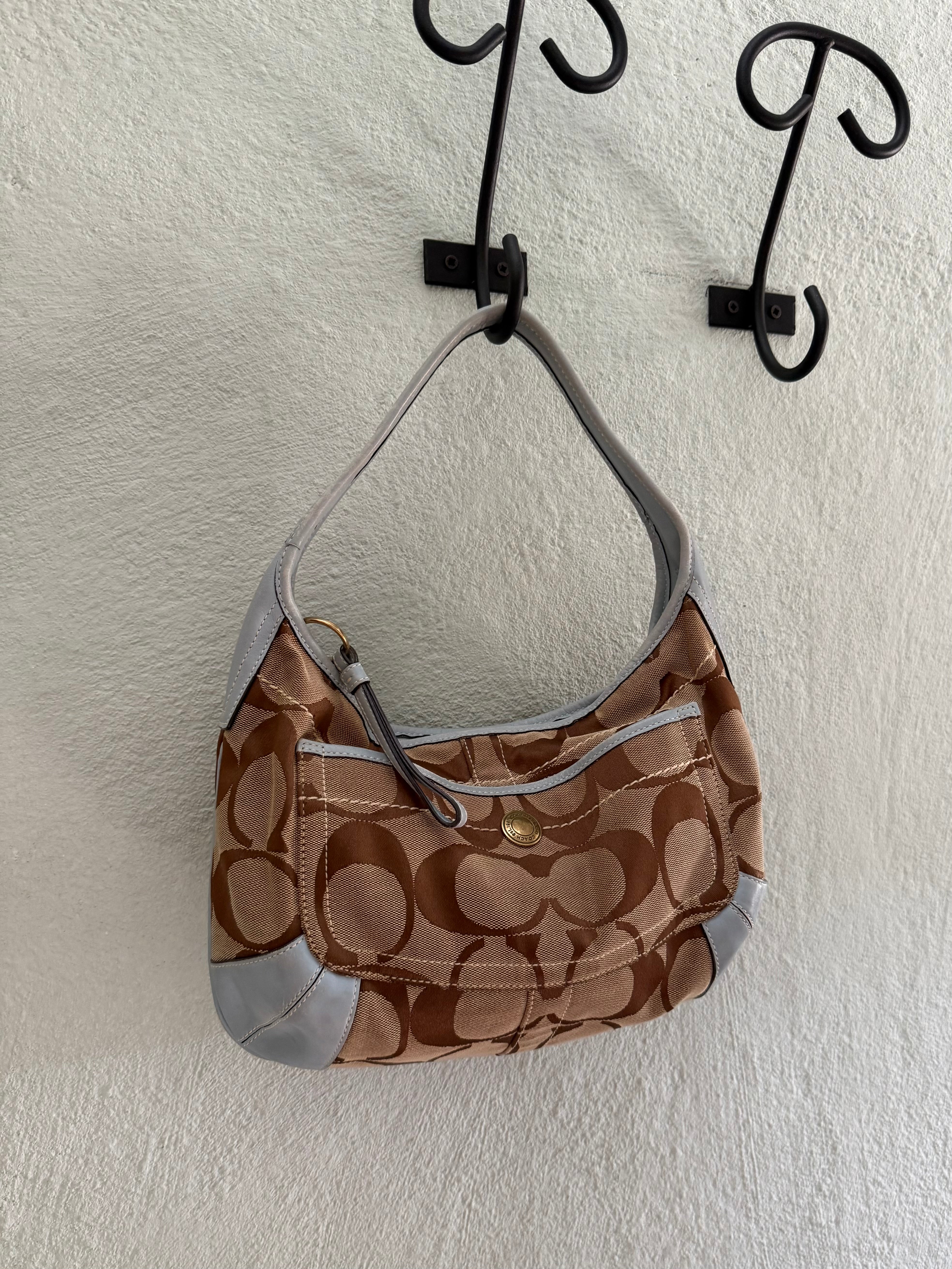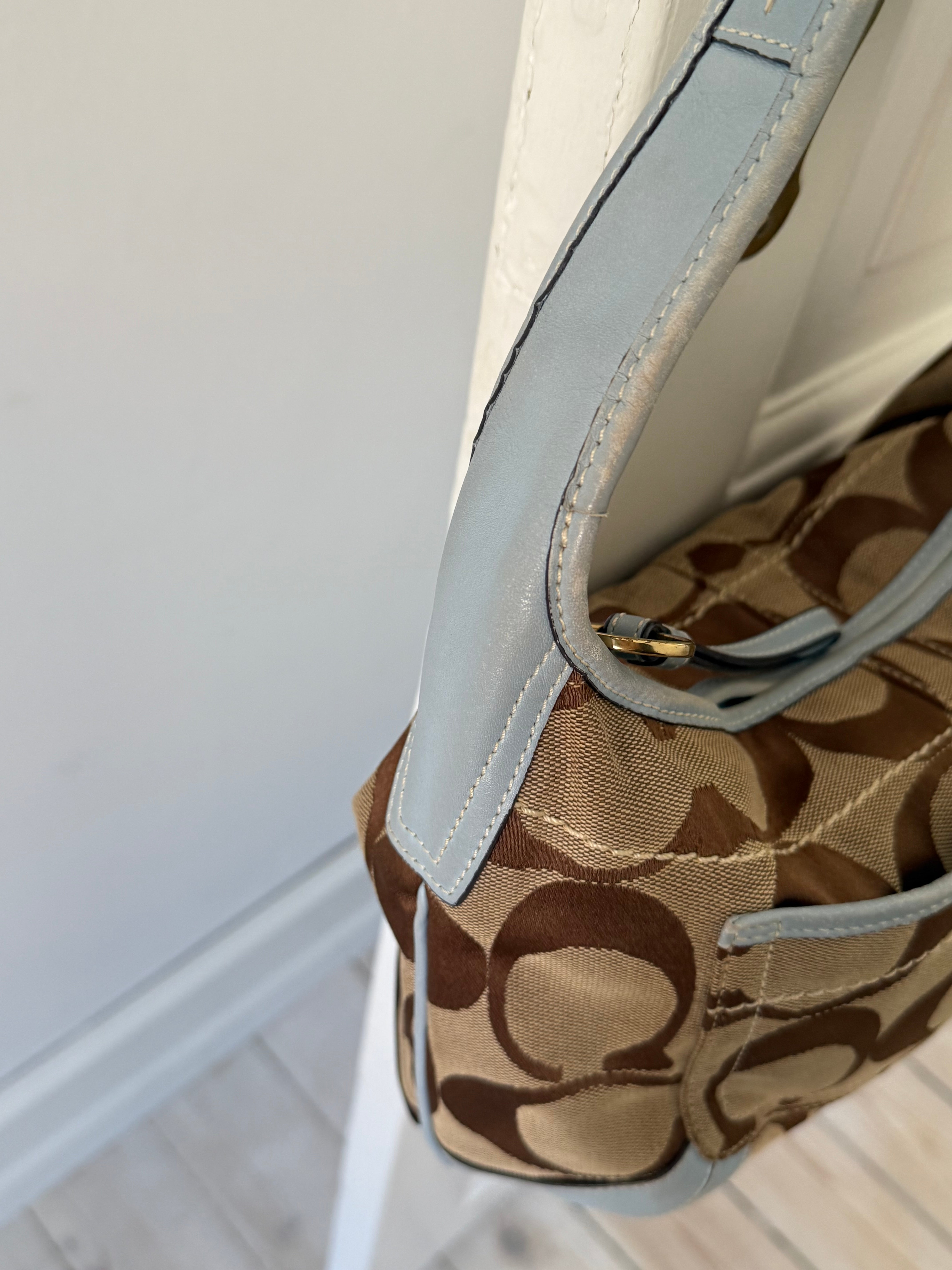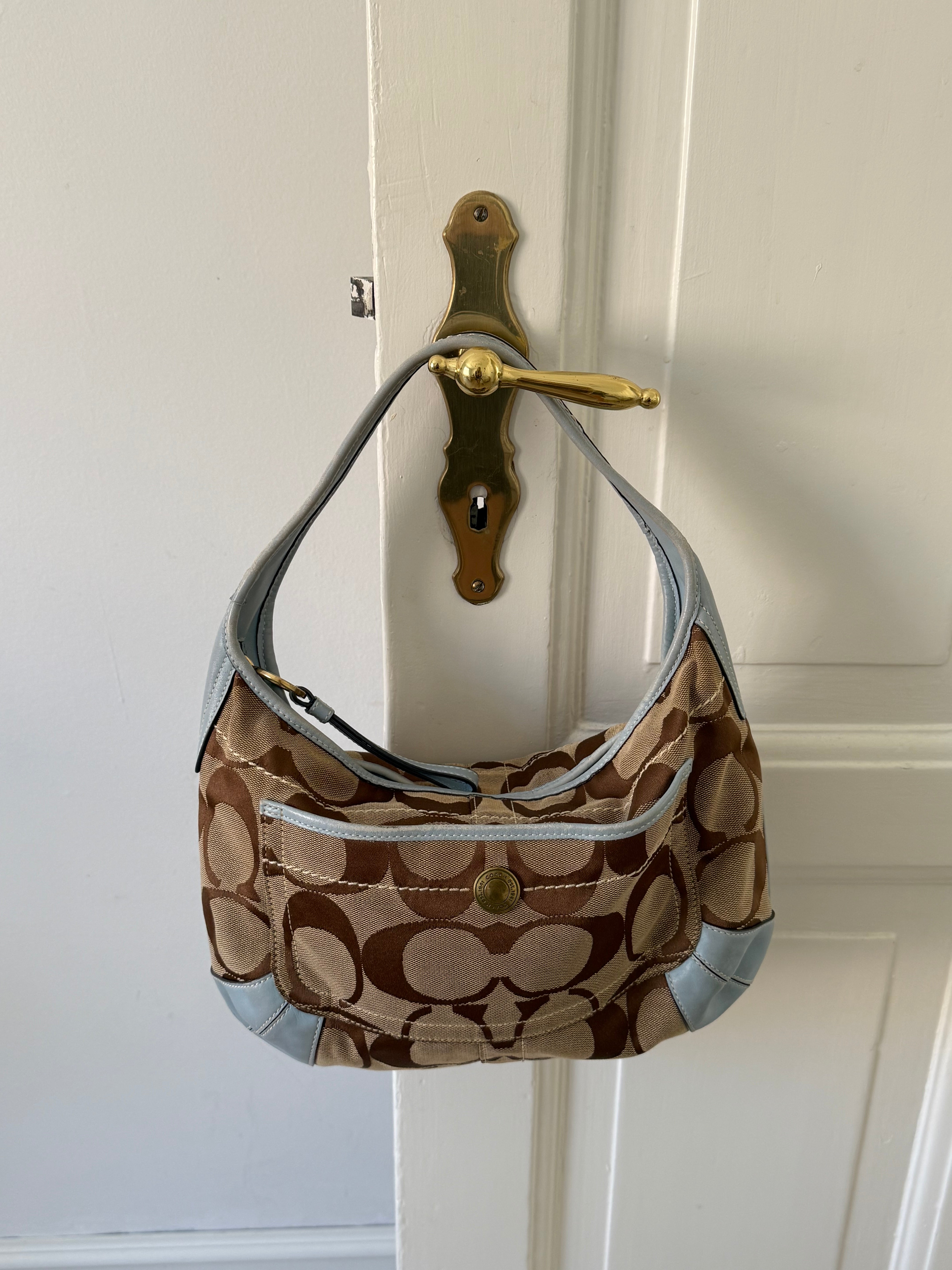 Cute vintage Coach bag in signature canvas and light blue leather.