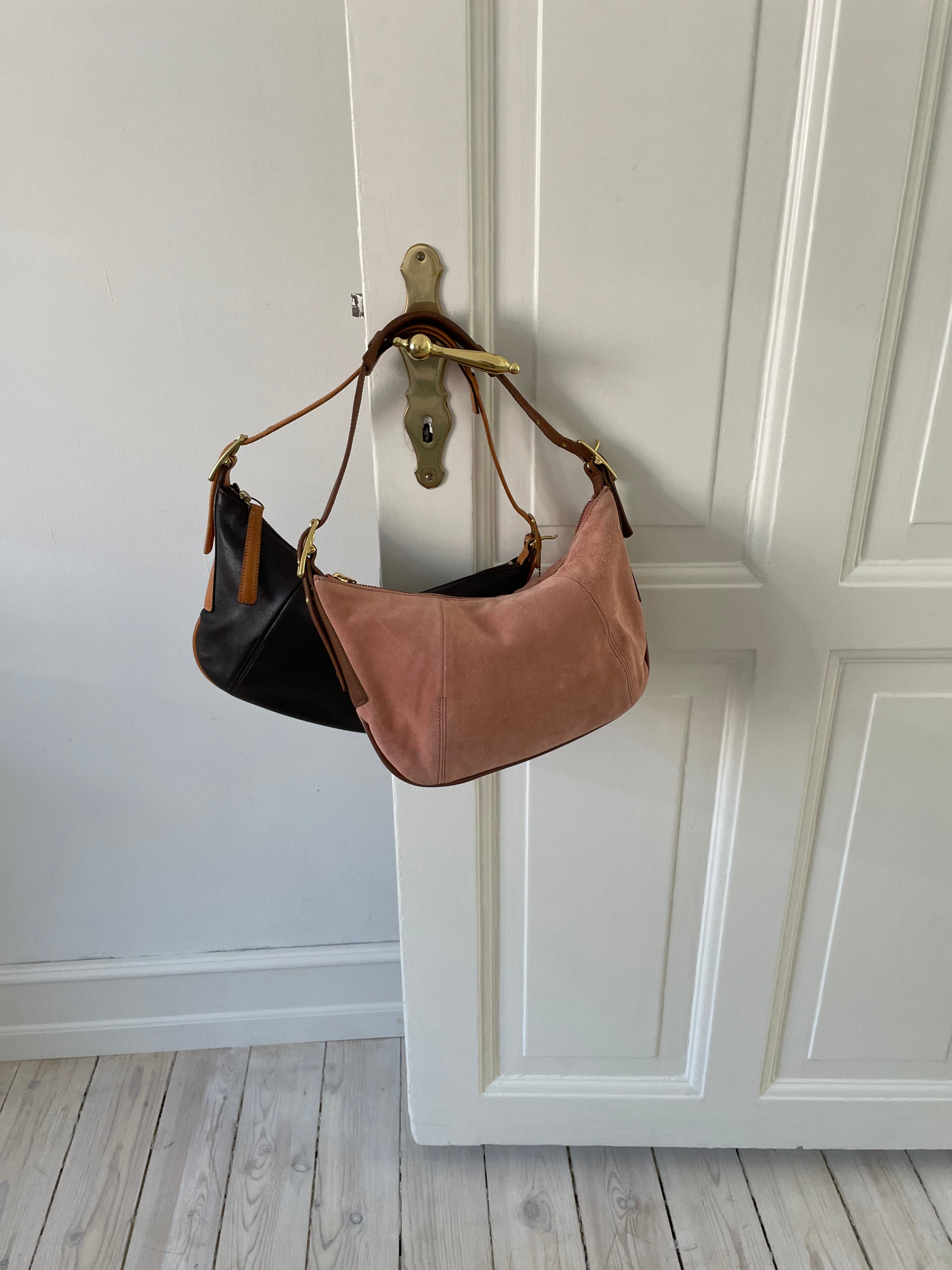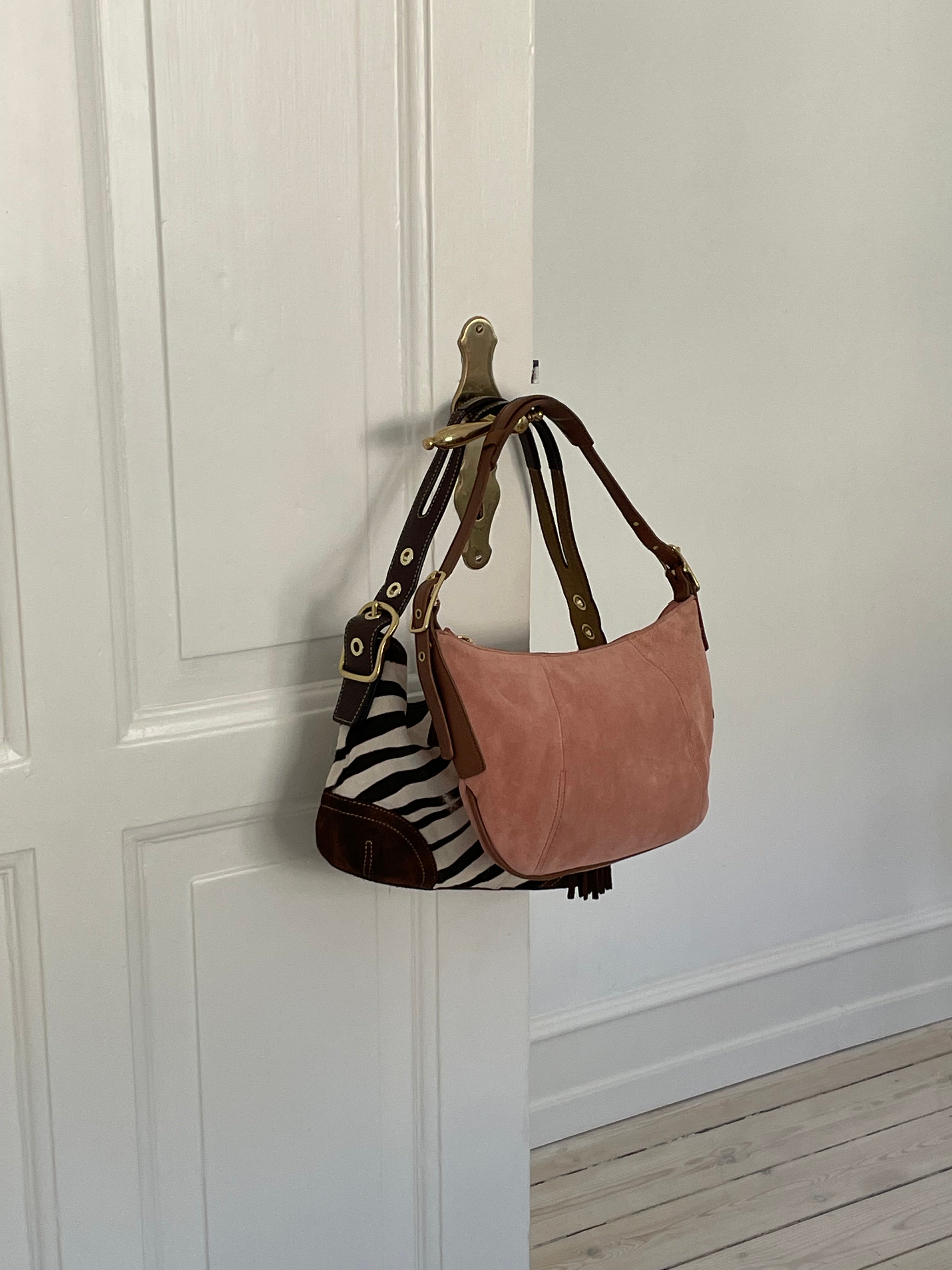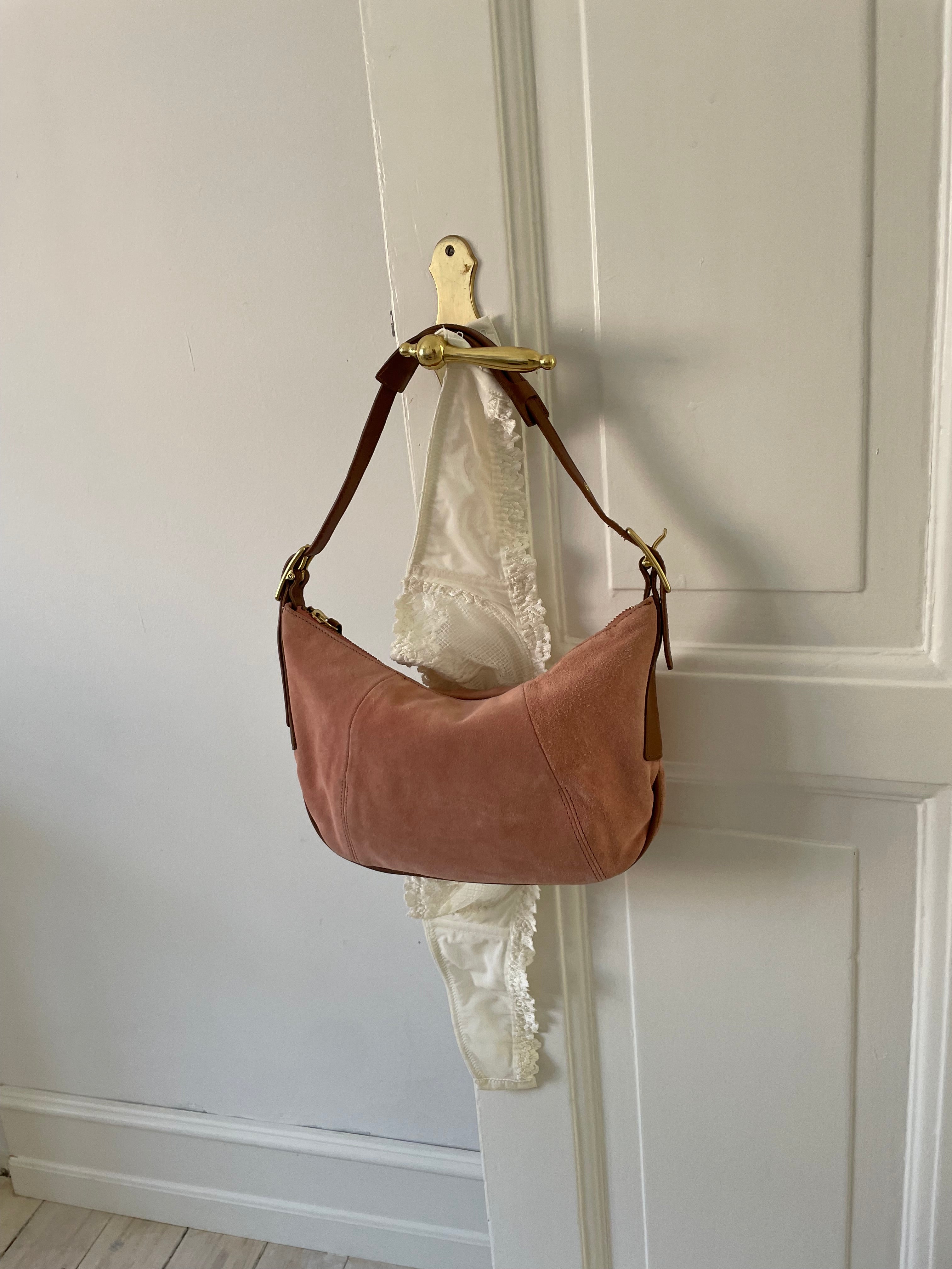 Vintage Coach bag in a rose/pink suede, gold-colored hardware and brown leather.