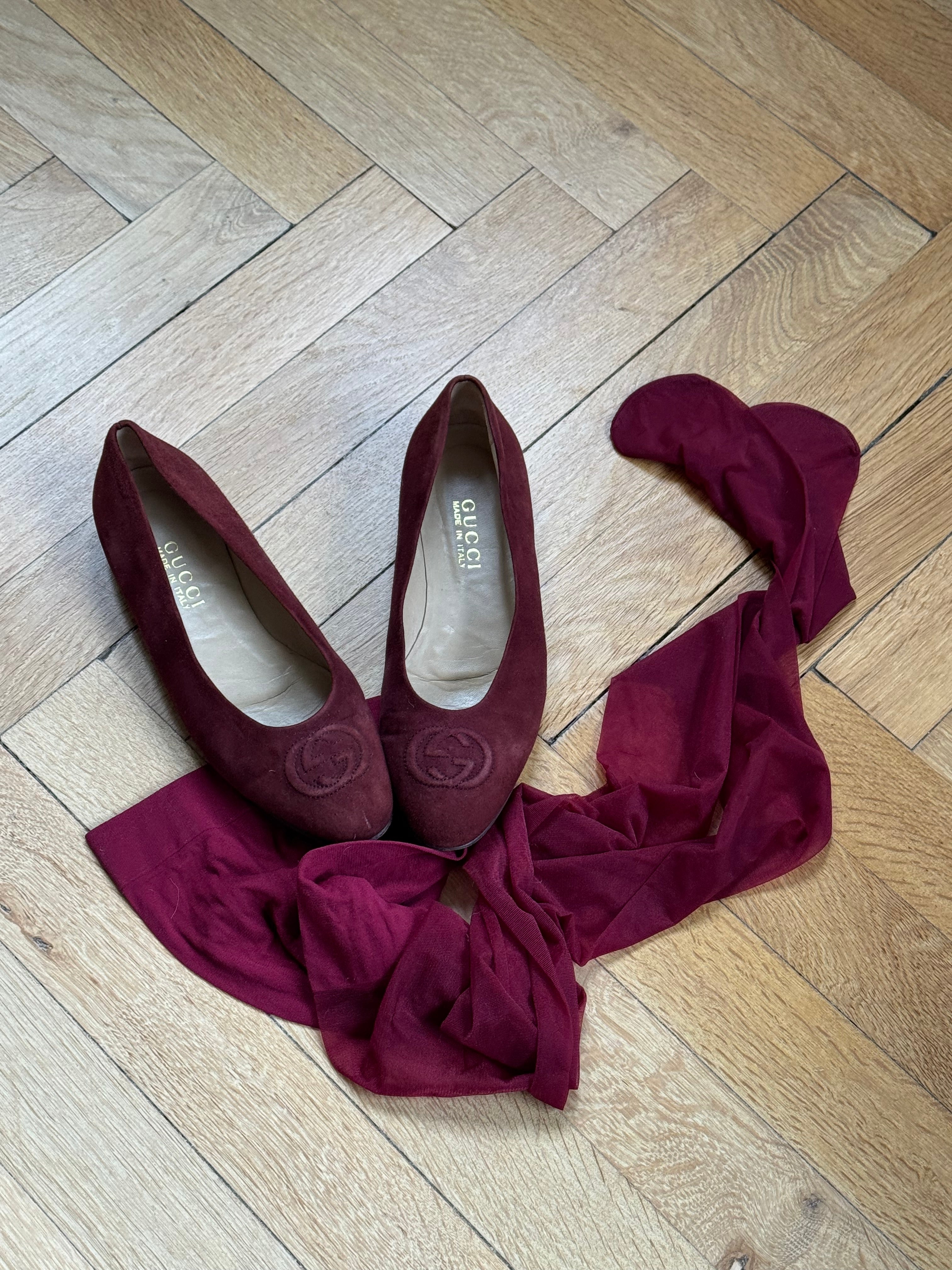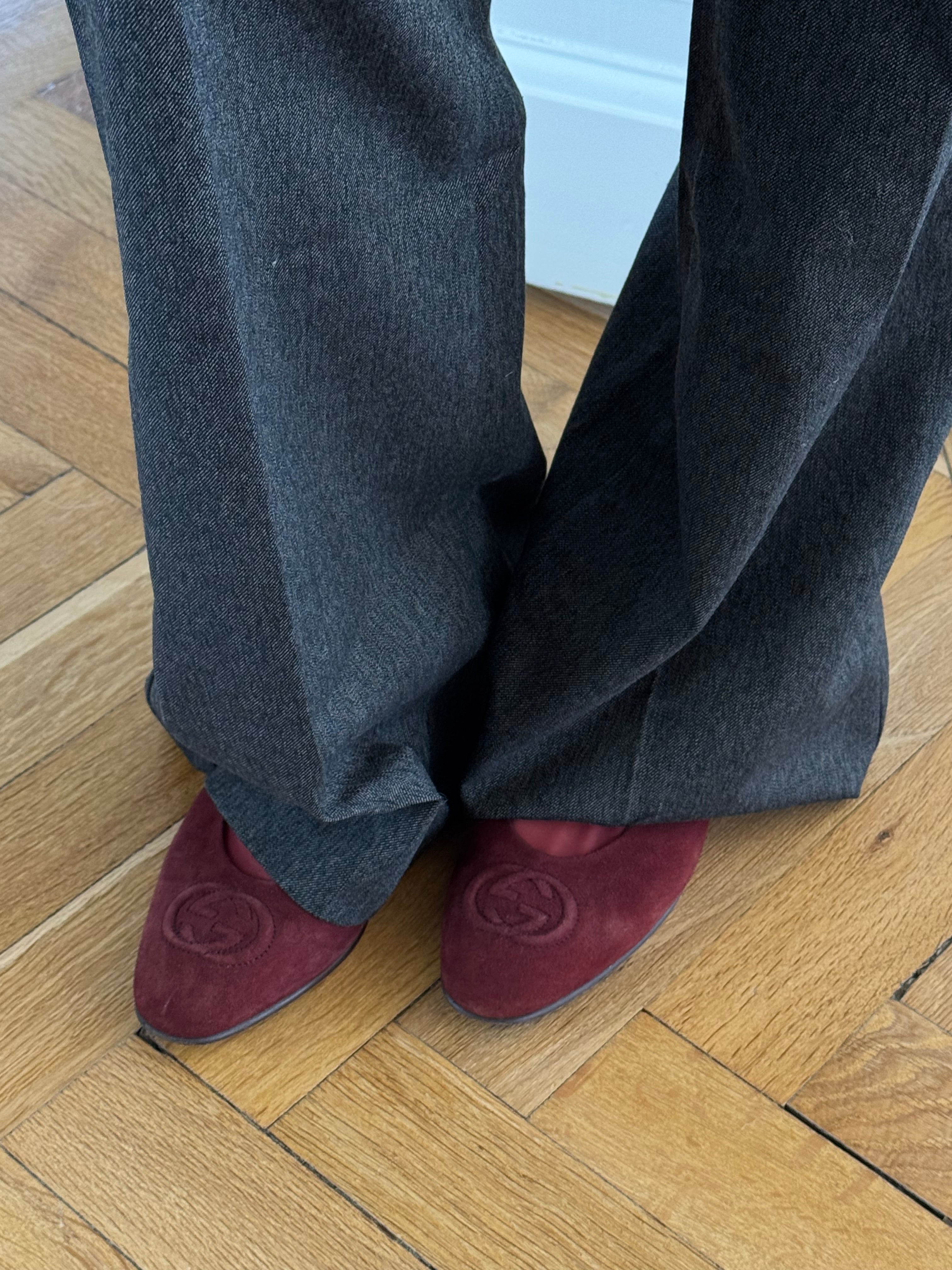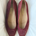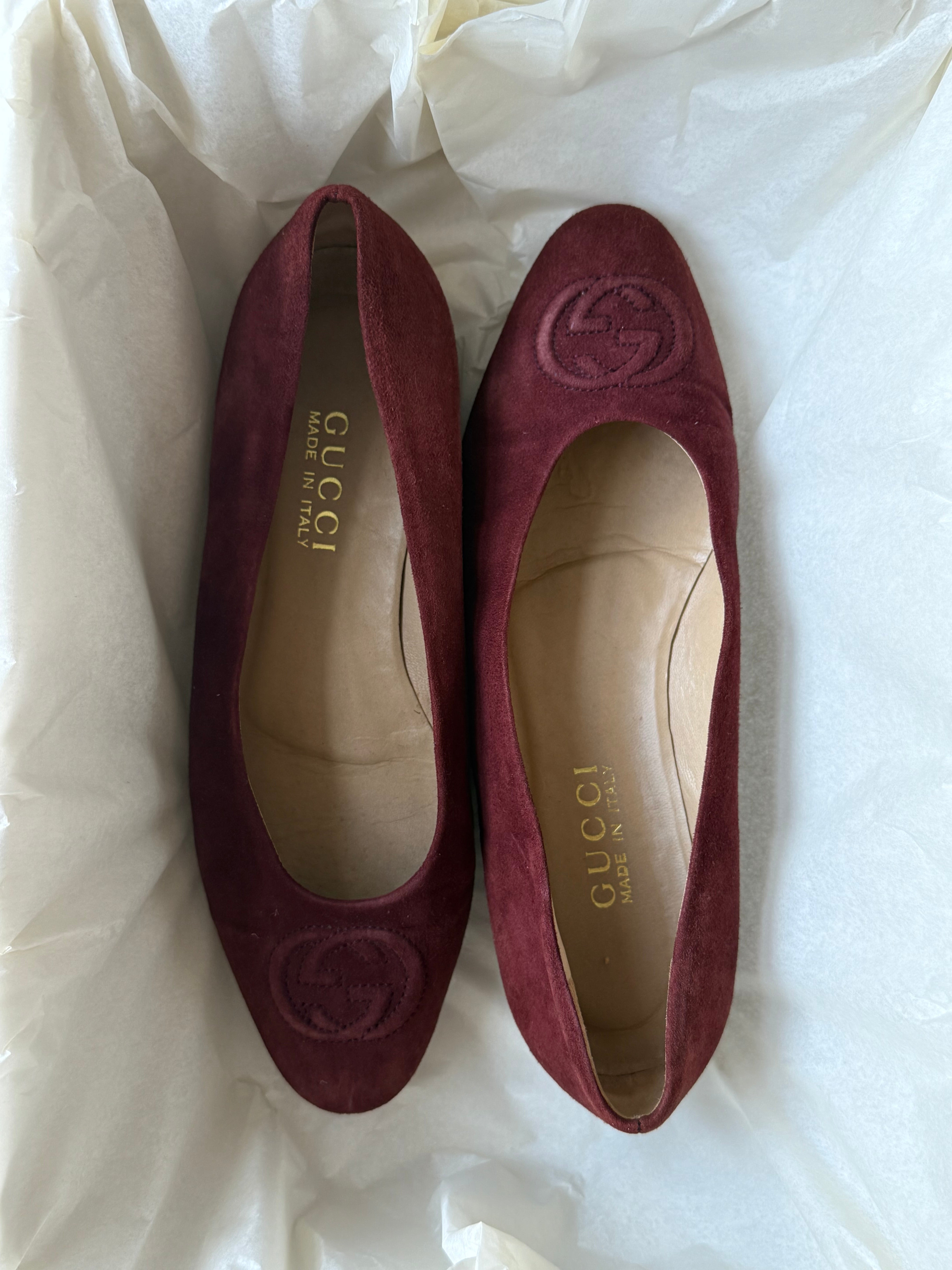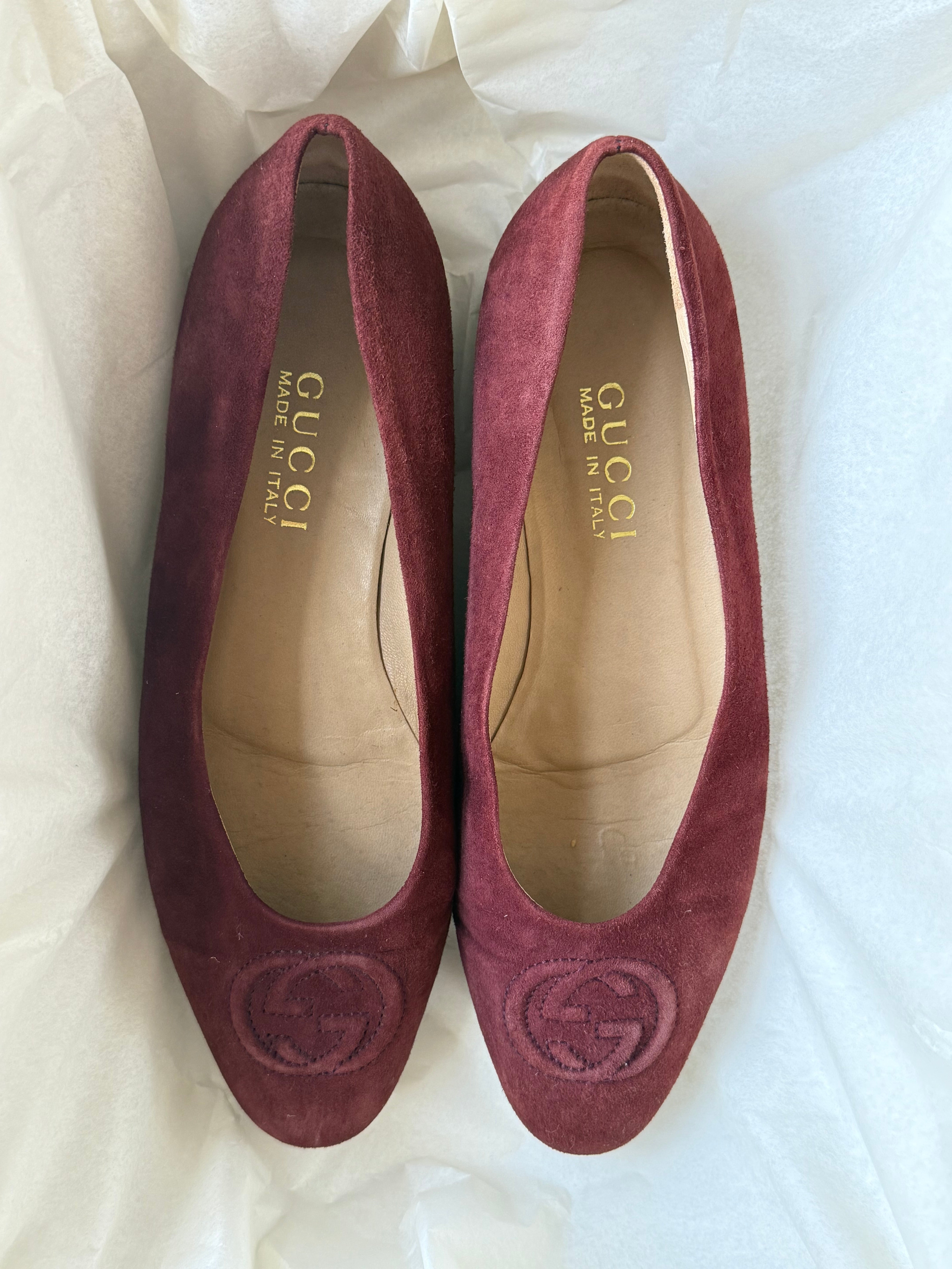 Vintage Gucci ballet flats in bordeaux suede with iconic GG logo.