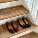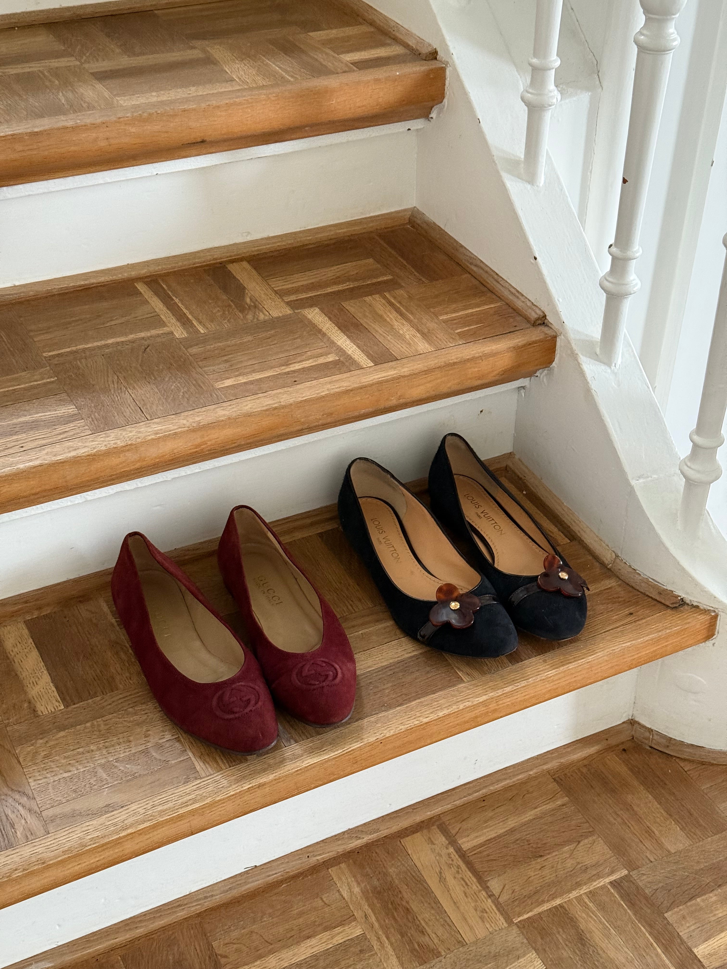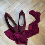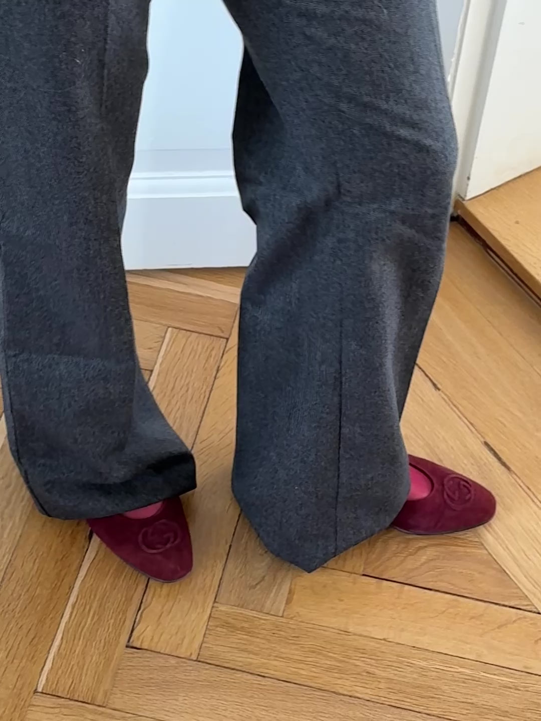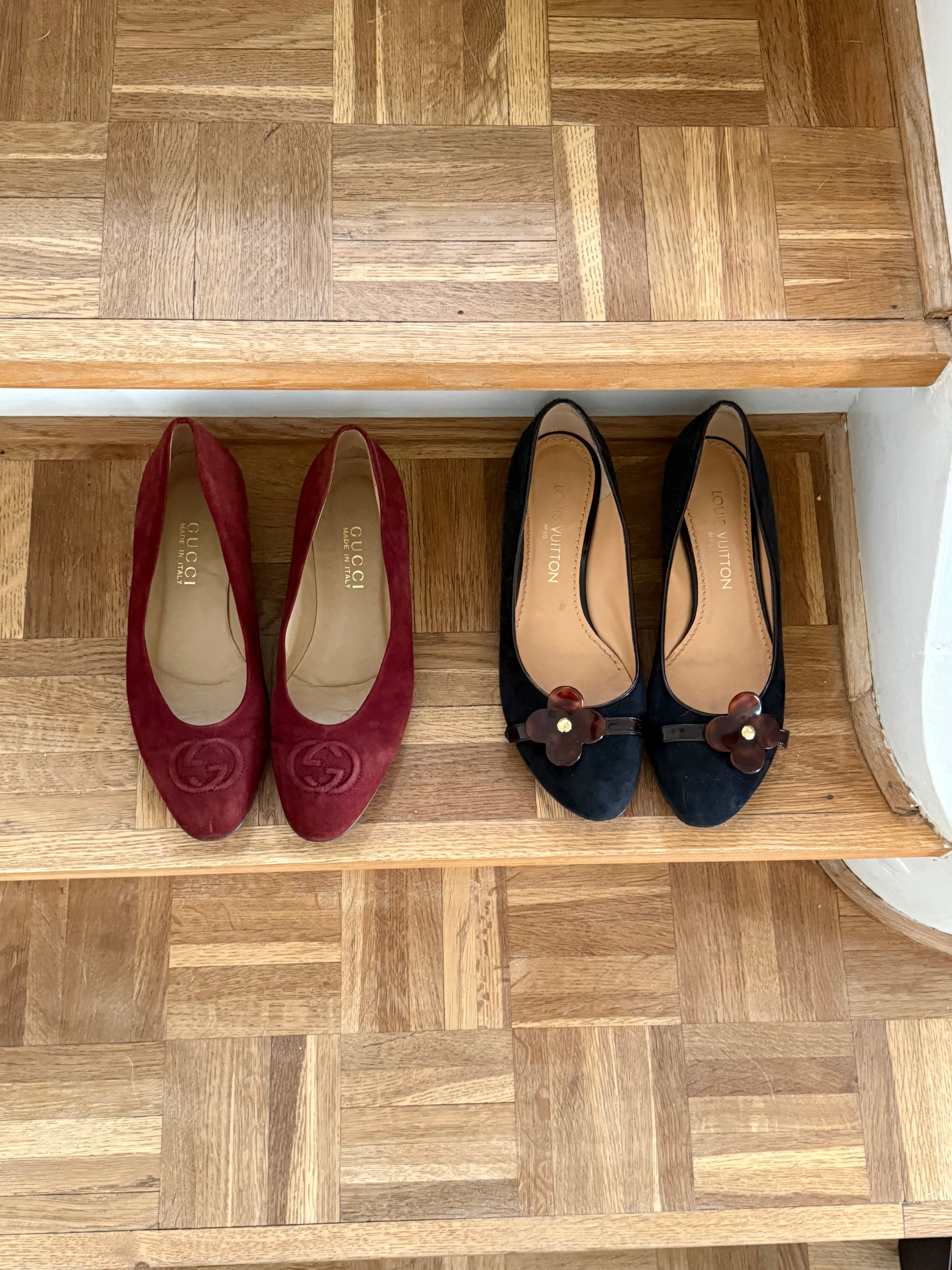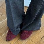 Vintage Gucci ballet flats in bordeaux suede with iconic GG logo.