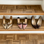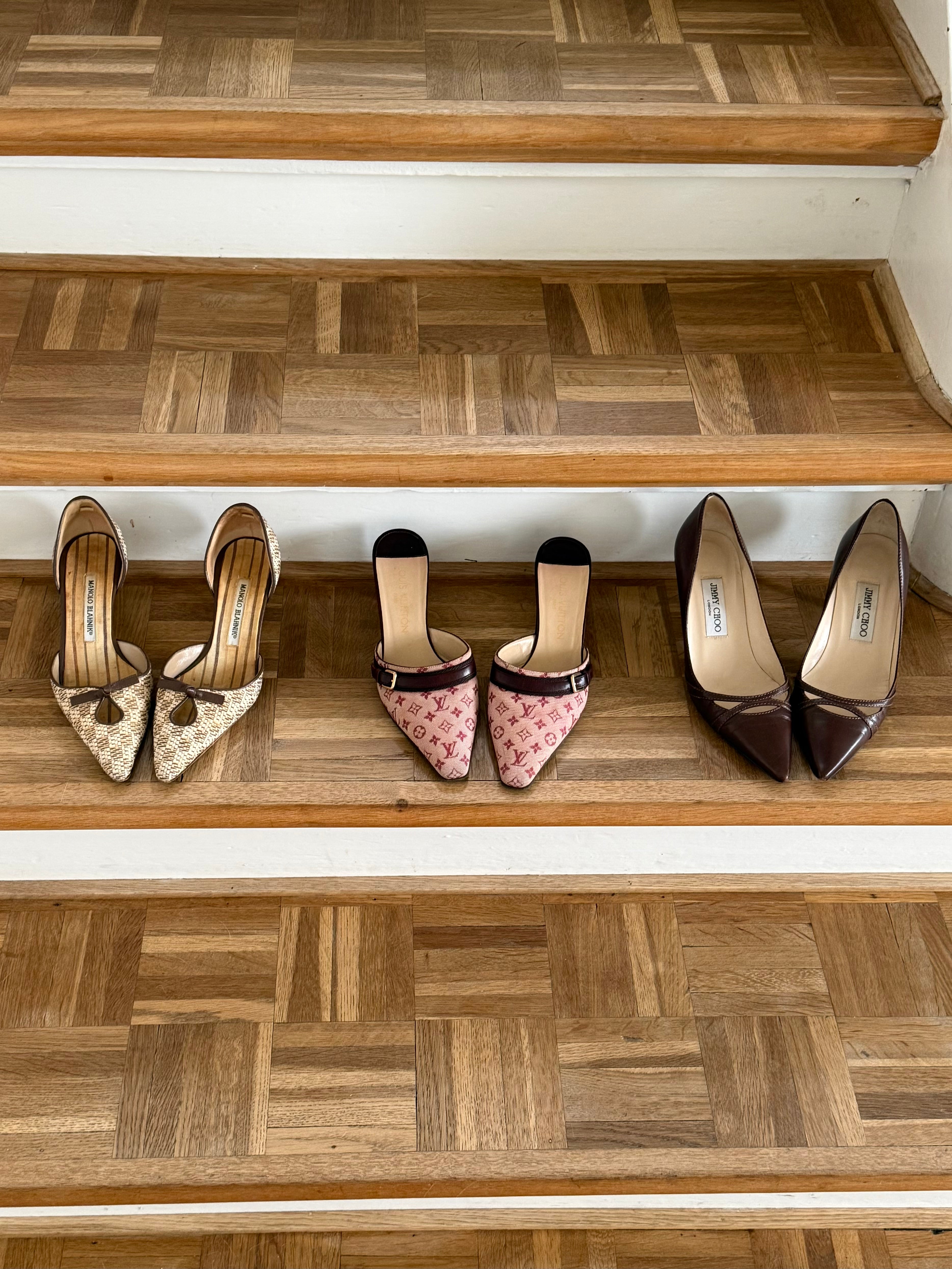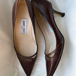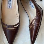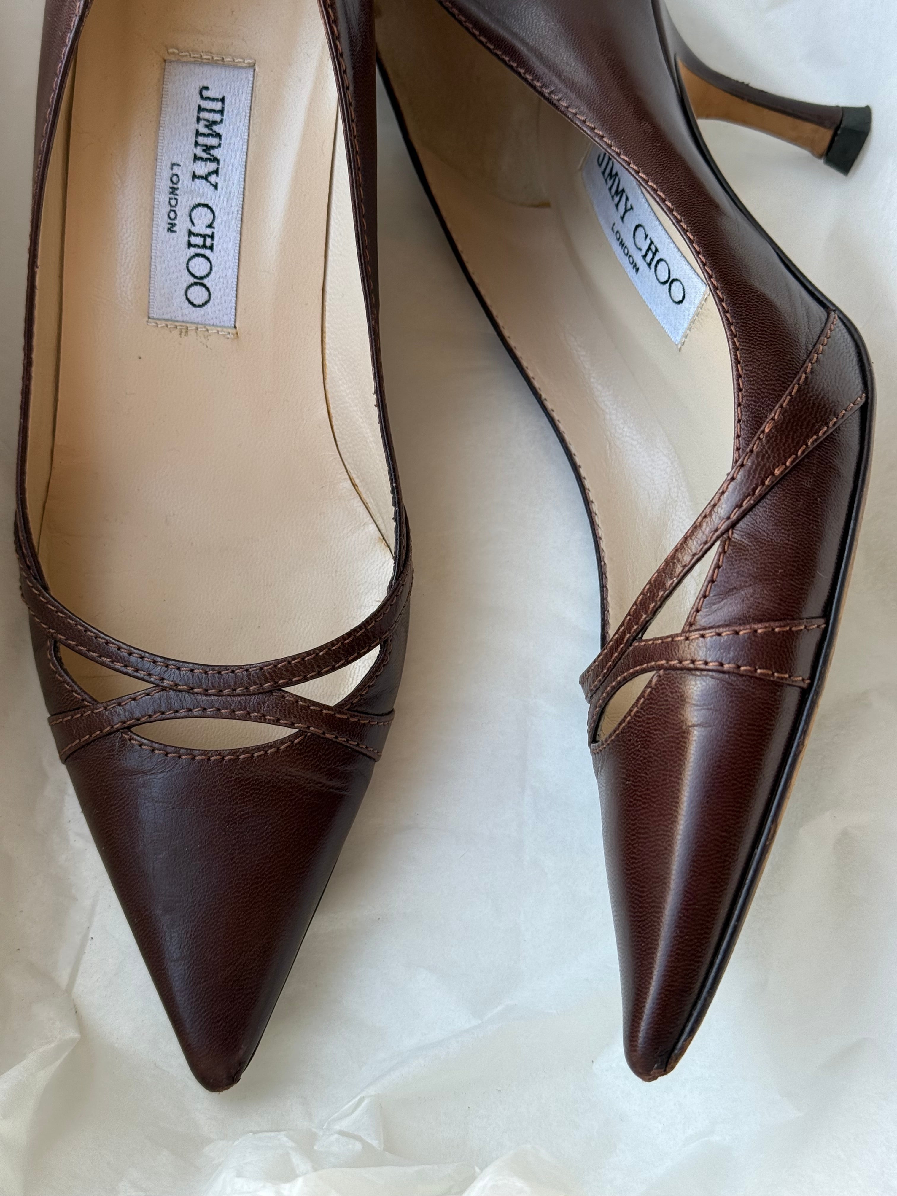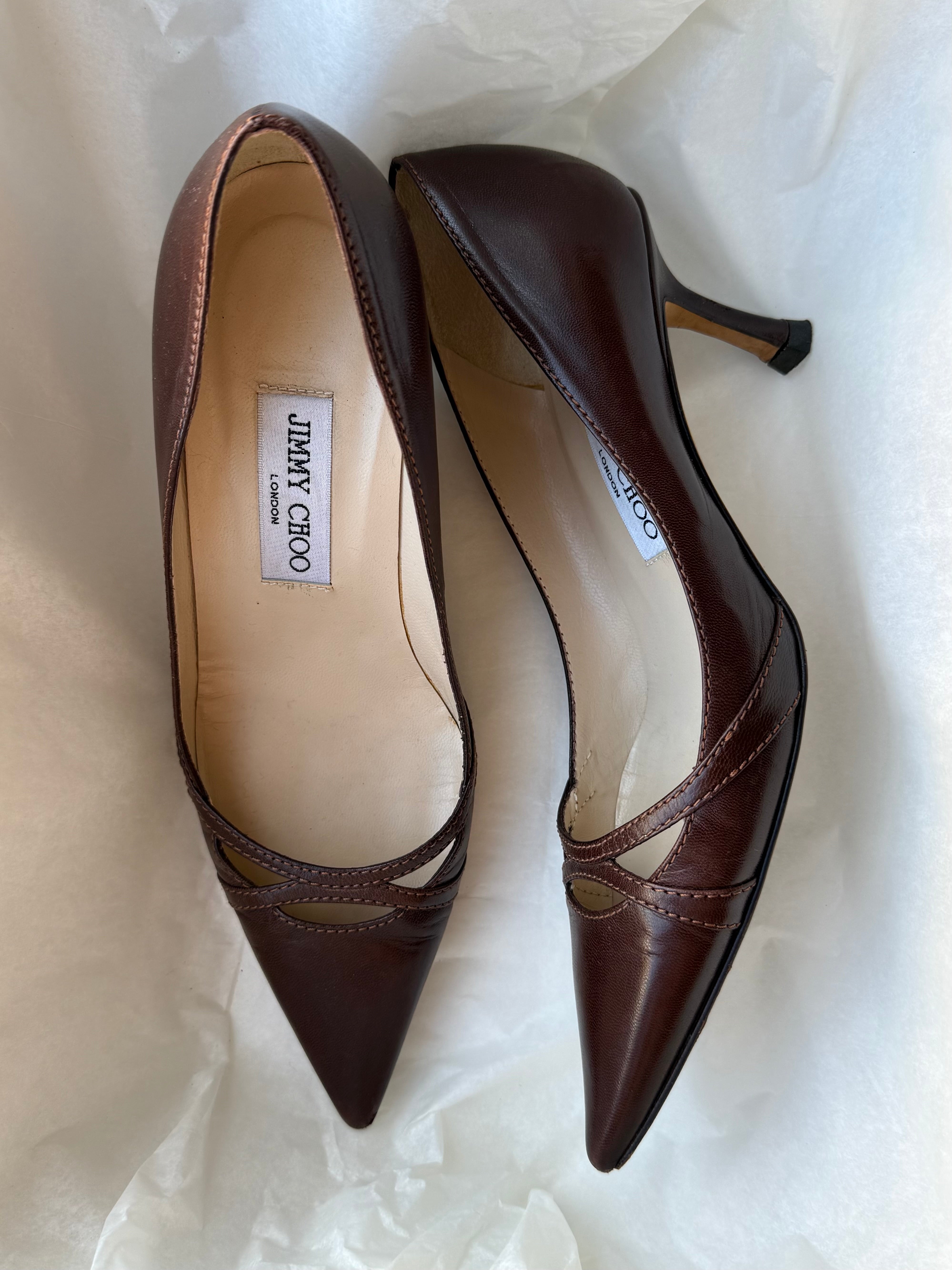 Vintage Jimmy Choo pumps in brown leather with pointed toe and cut-out detail.