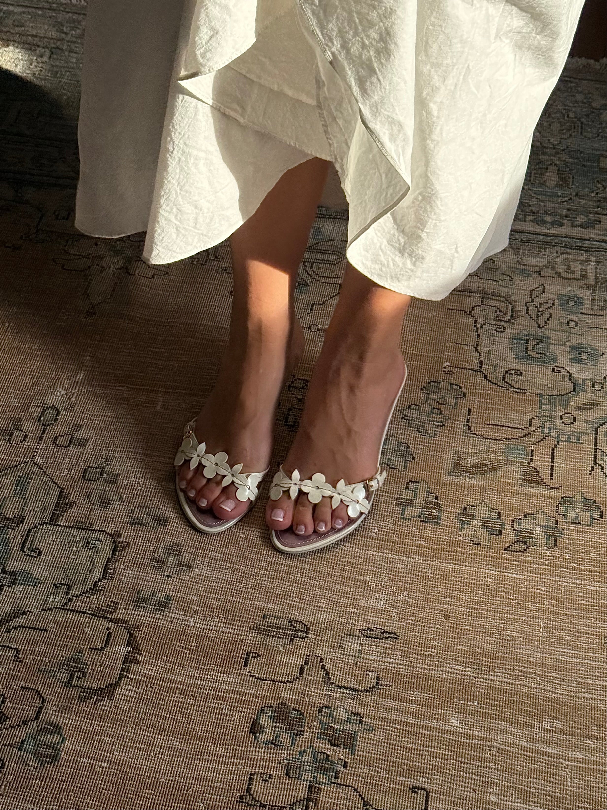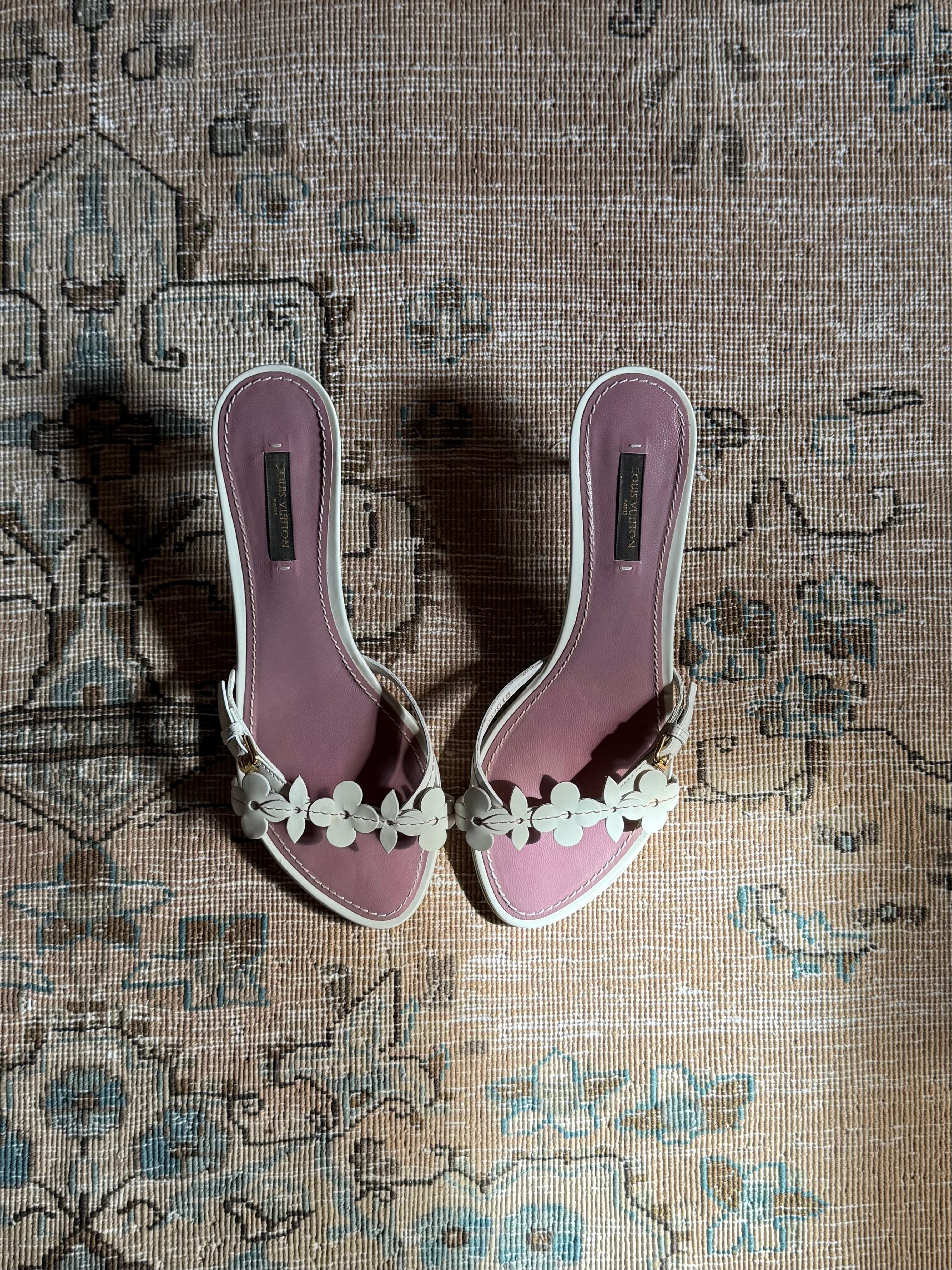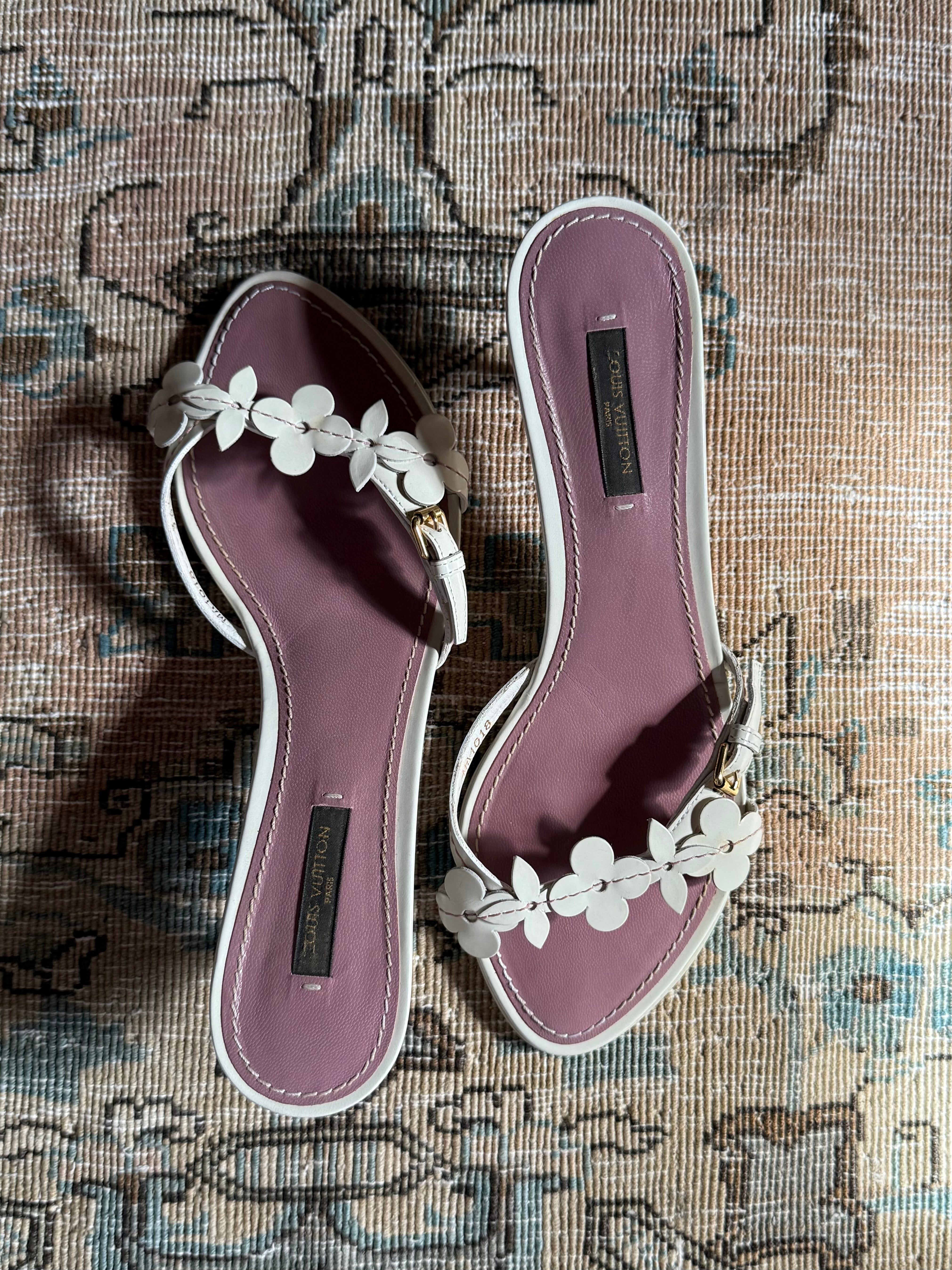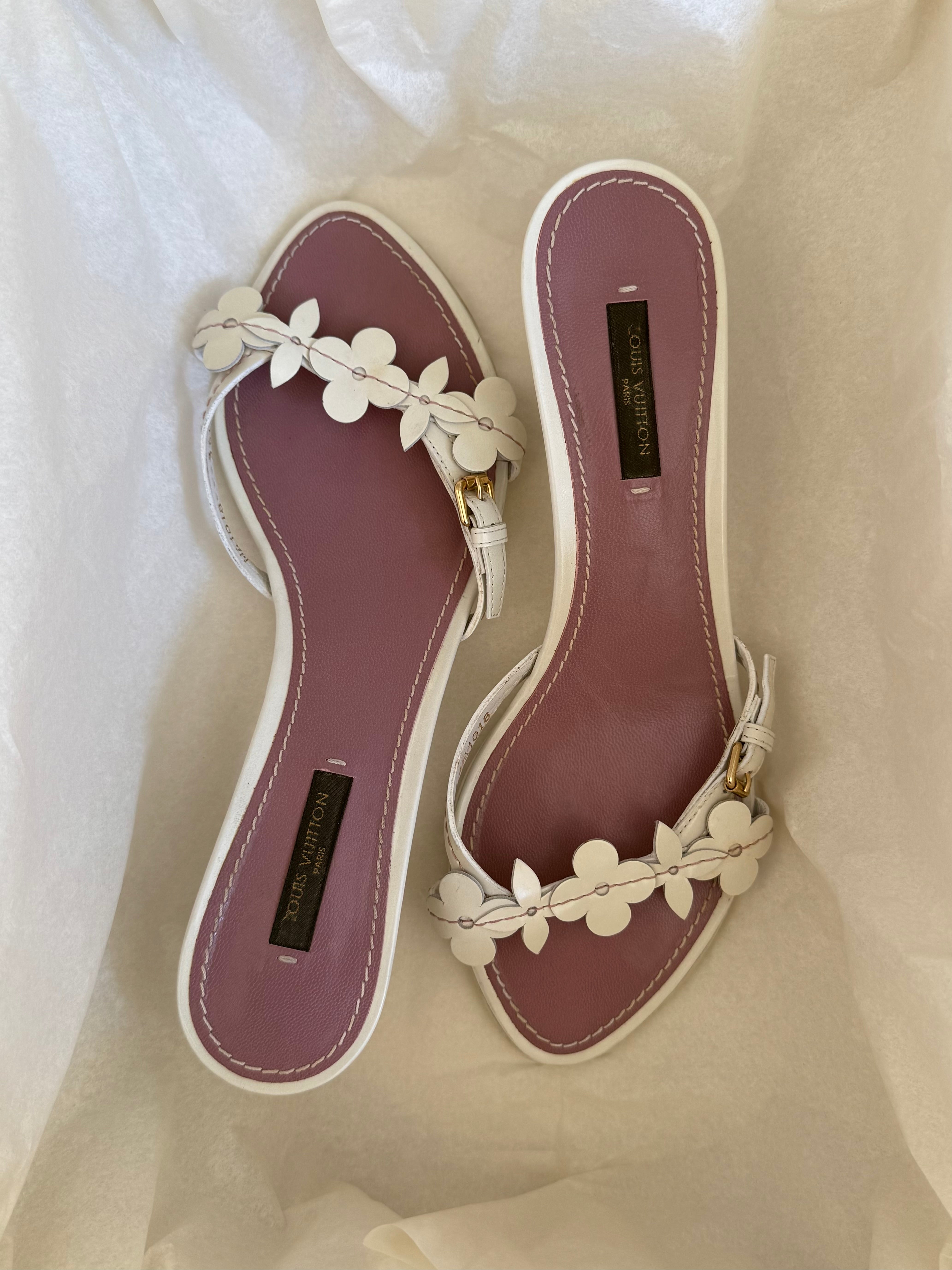 Vintage Louis Vuitton flower mules with gold buckle detail.