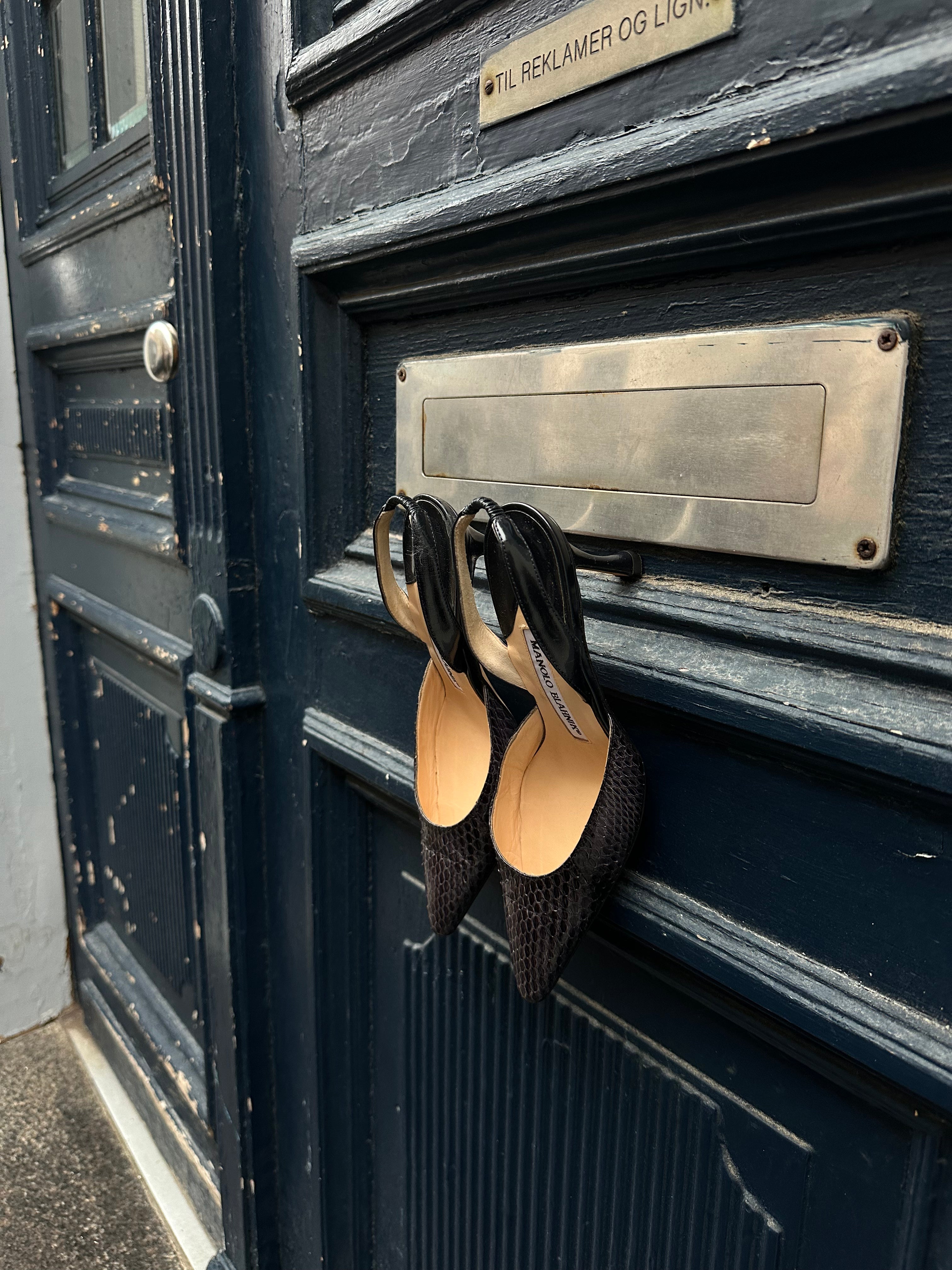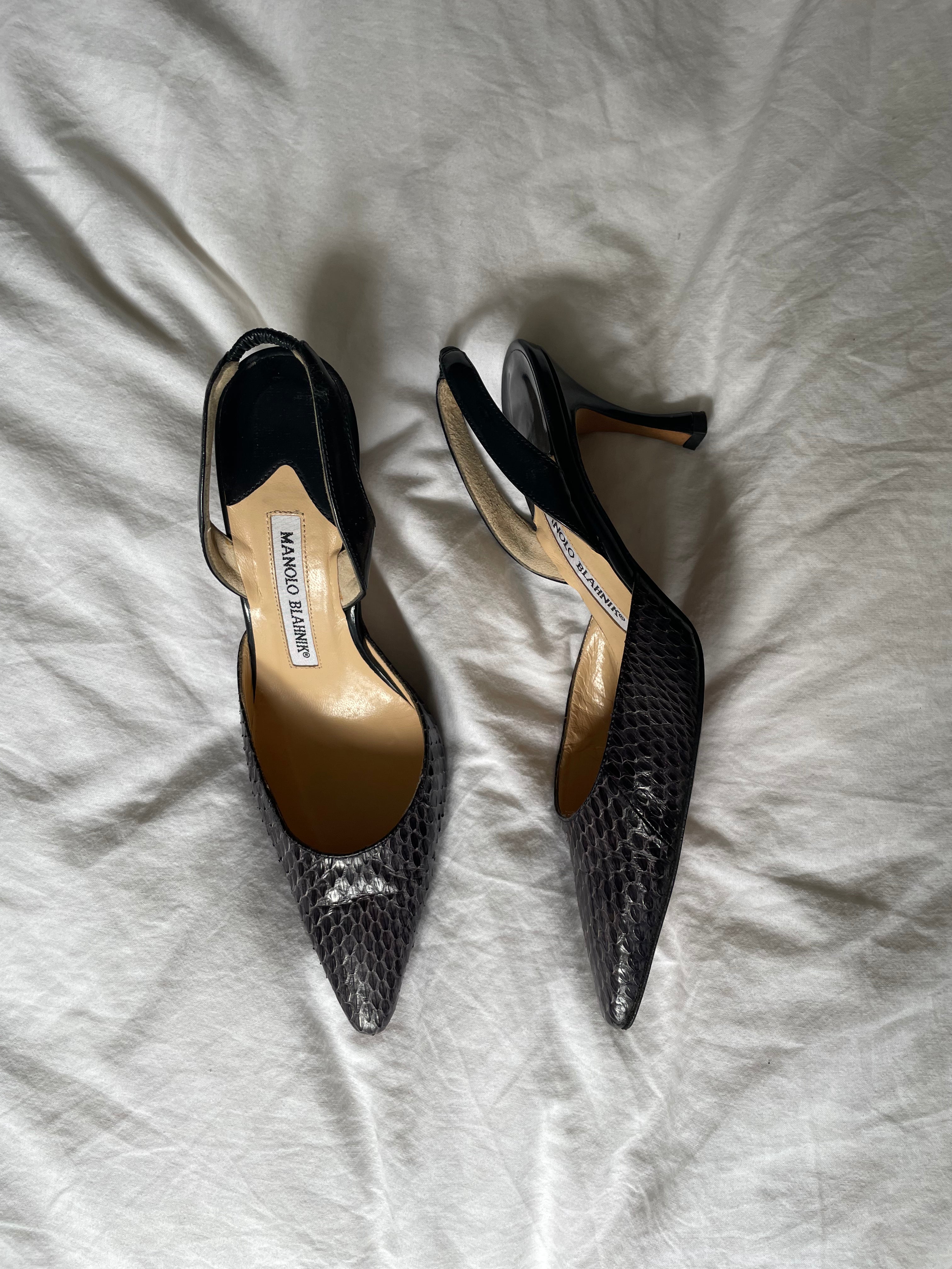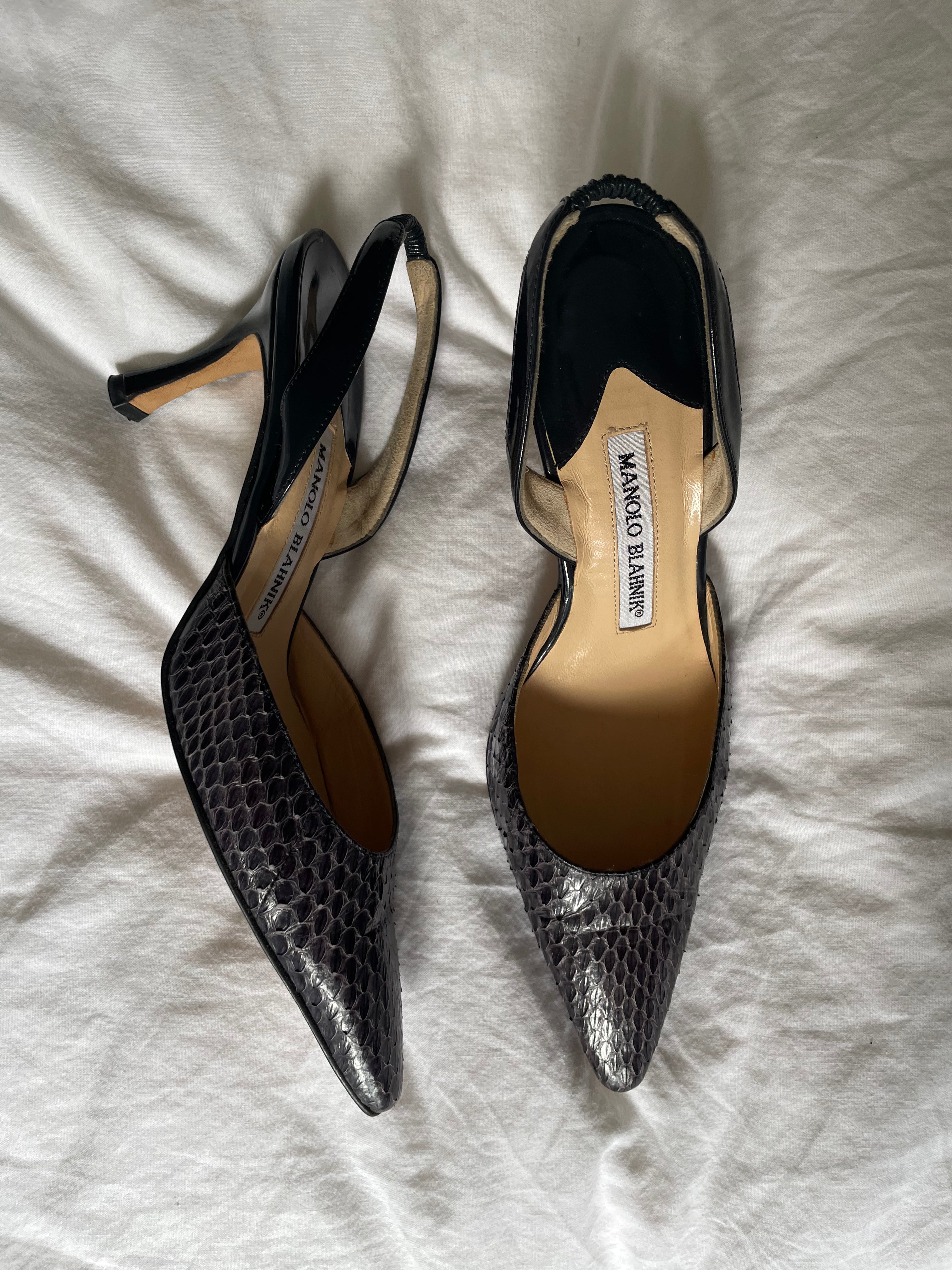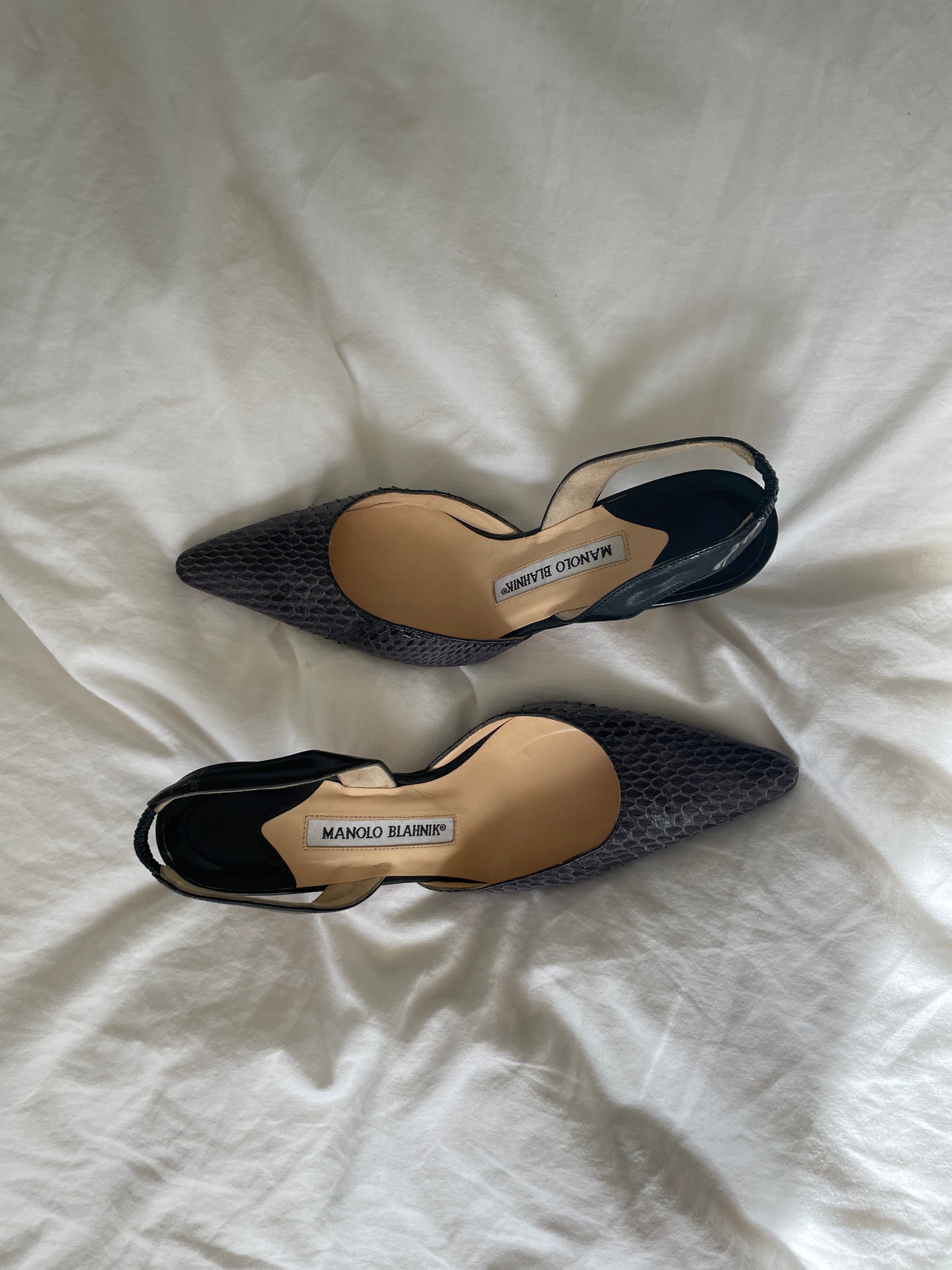 Vintage Manolo Blahnik navy snake slingbacks in the model Carolyne. The shoes are in genuine leather and made in Italy. They are in good vintage condition.