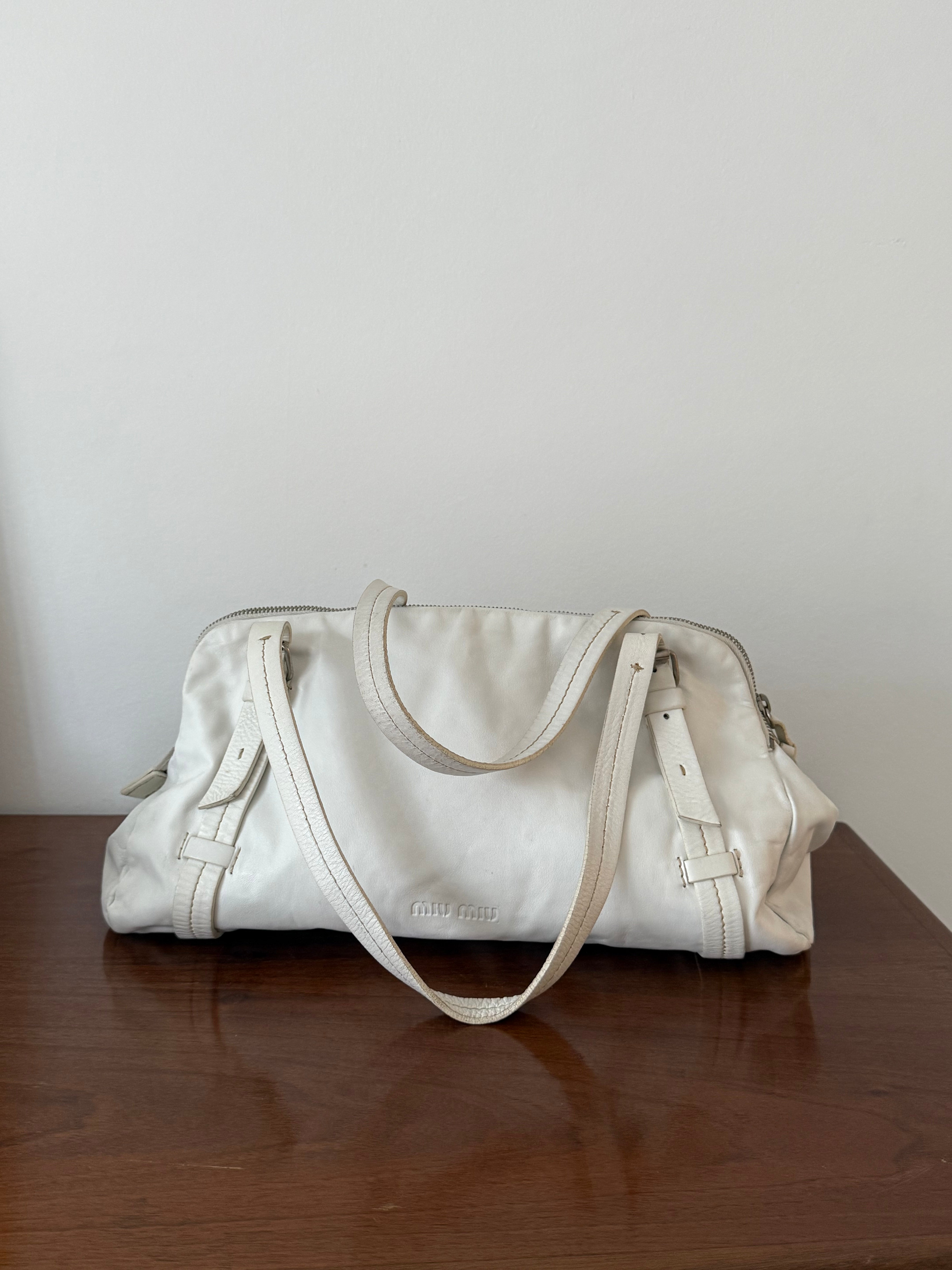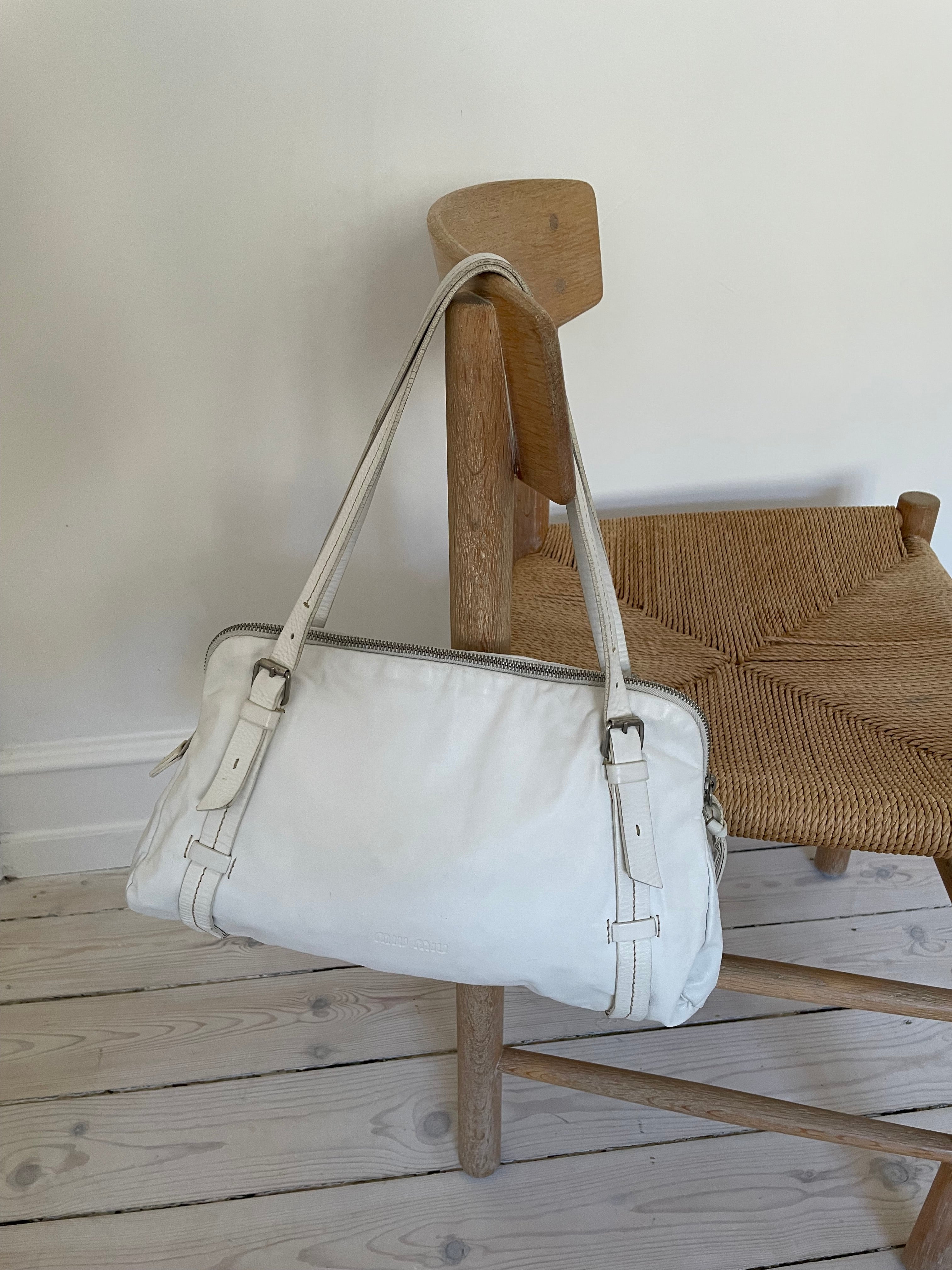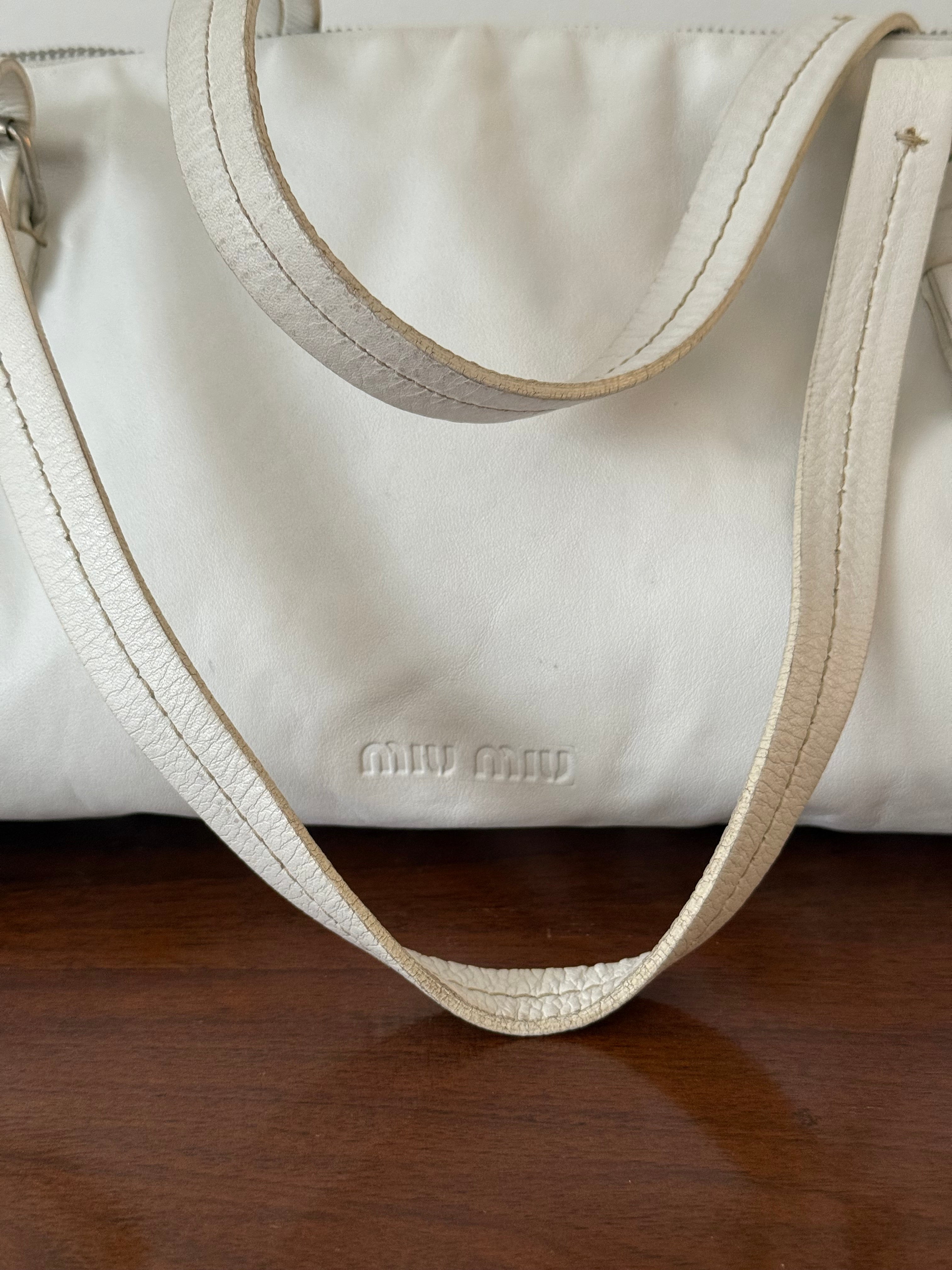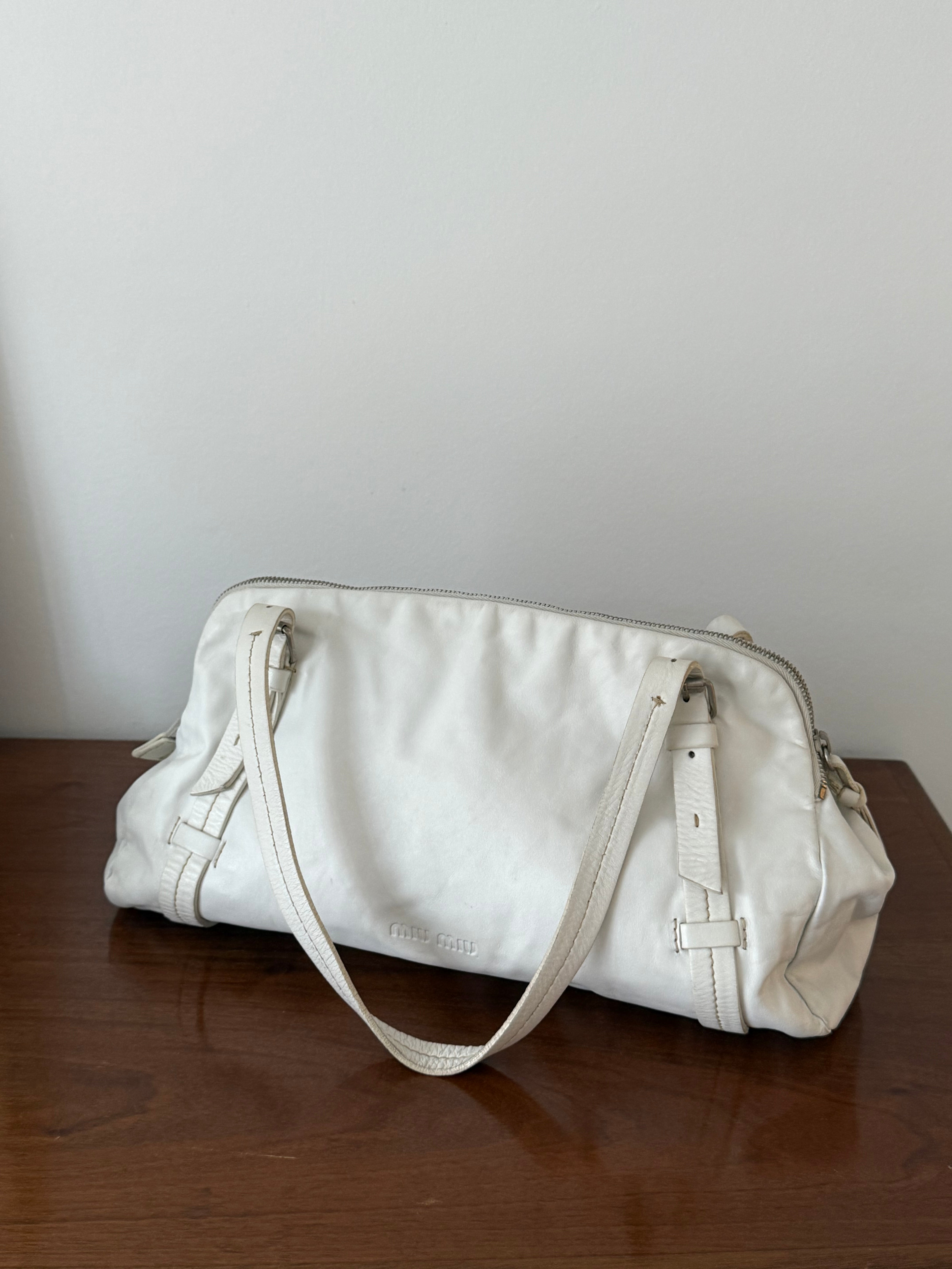 Vintage Miu Miu shoulder bag in soft white leather with buckle details and silver hardware. The beautiful Miu Miu logo is engraved on the side of the bag.