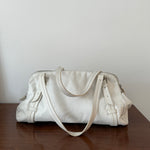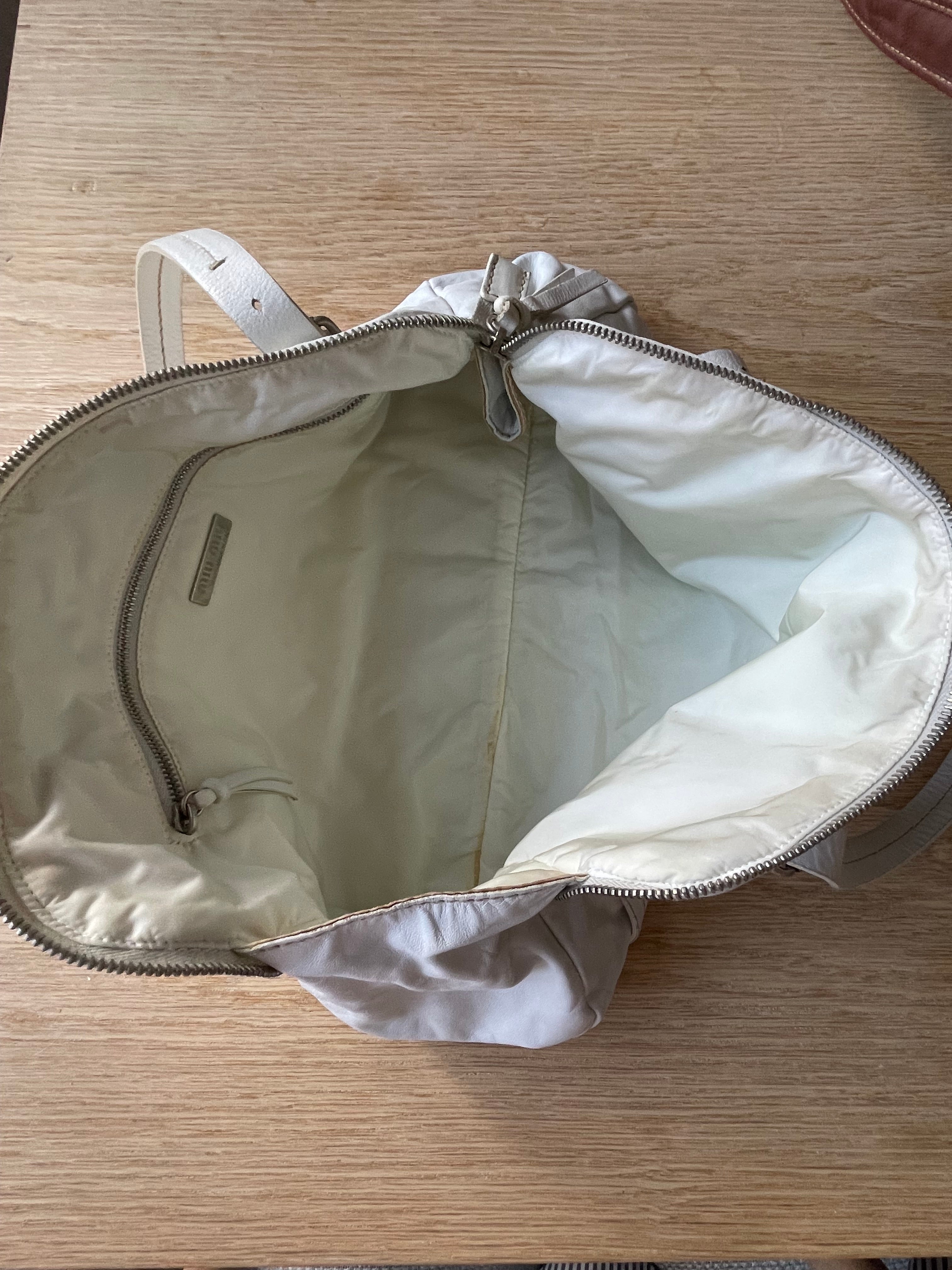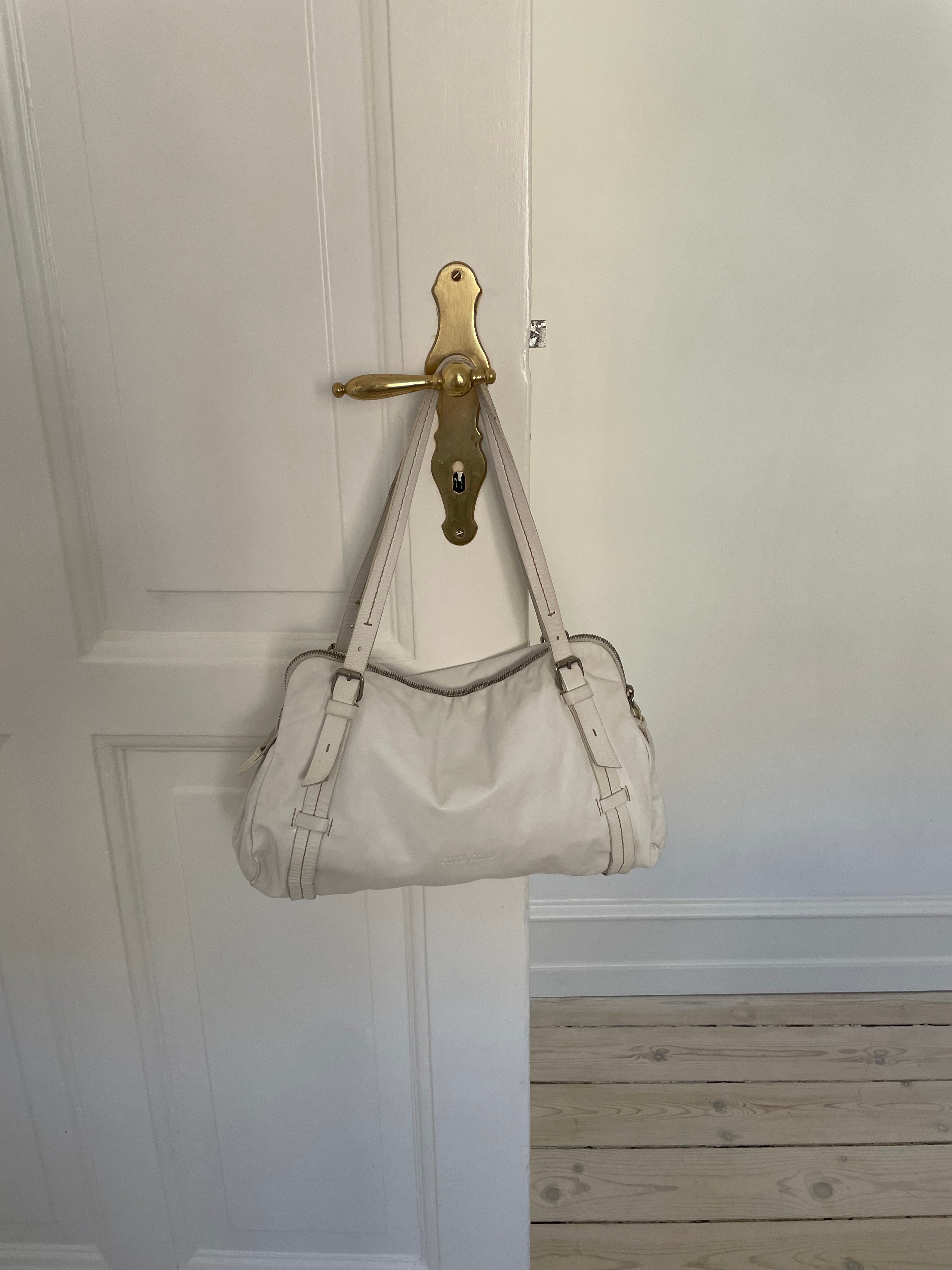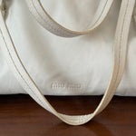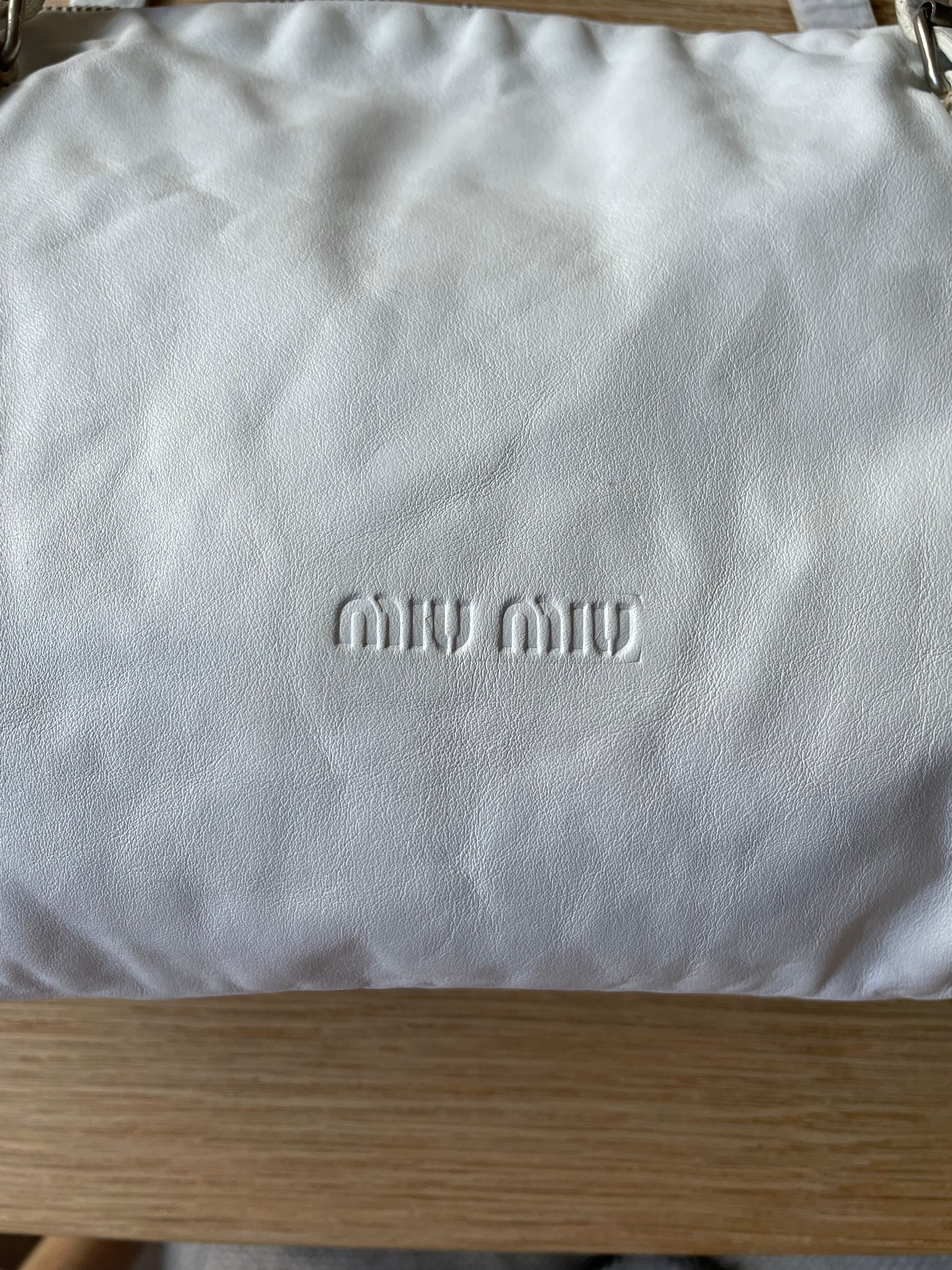 Vintage Miu Miu shoulder bag in soft white leather with buckle details and silver hardware. The beautiful Miu Miu logo is engraved on the side of the bag.