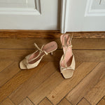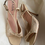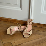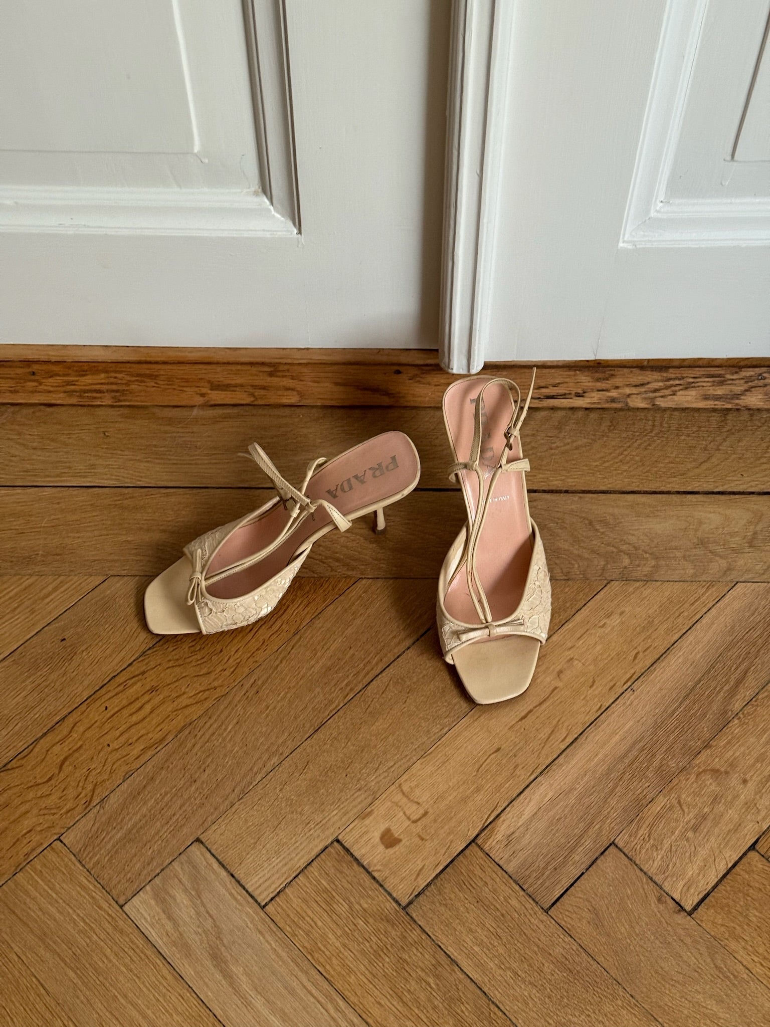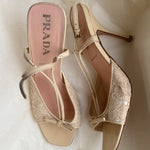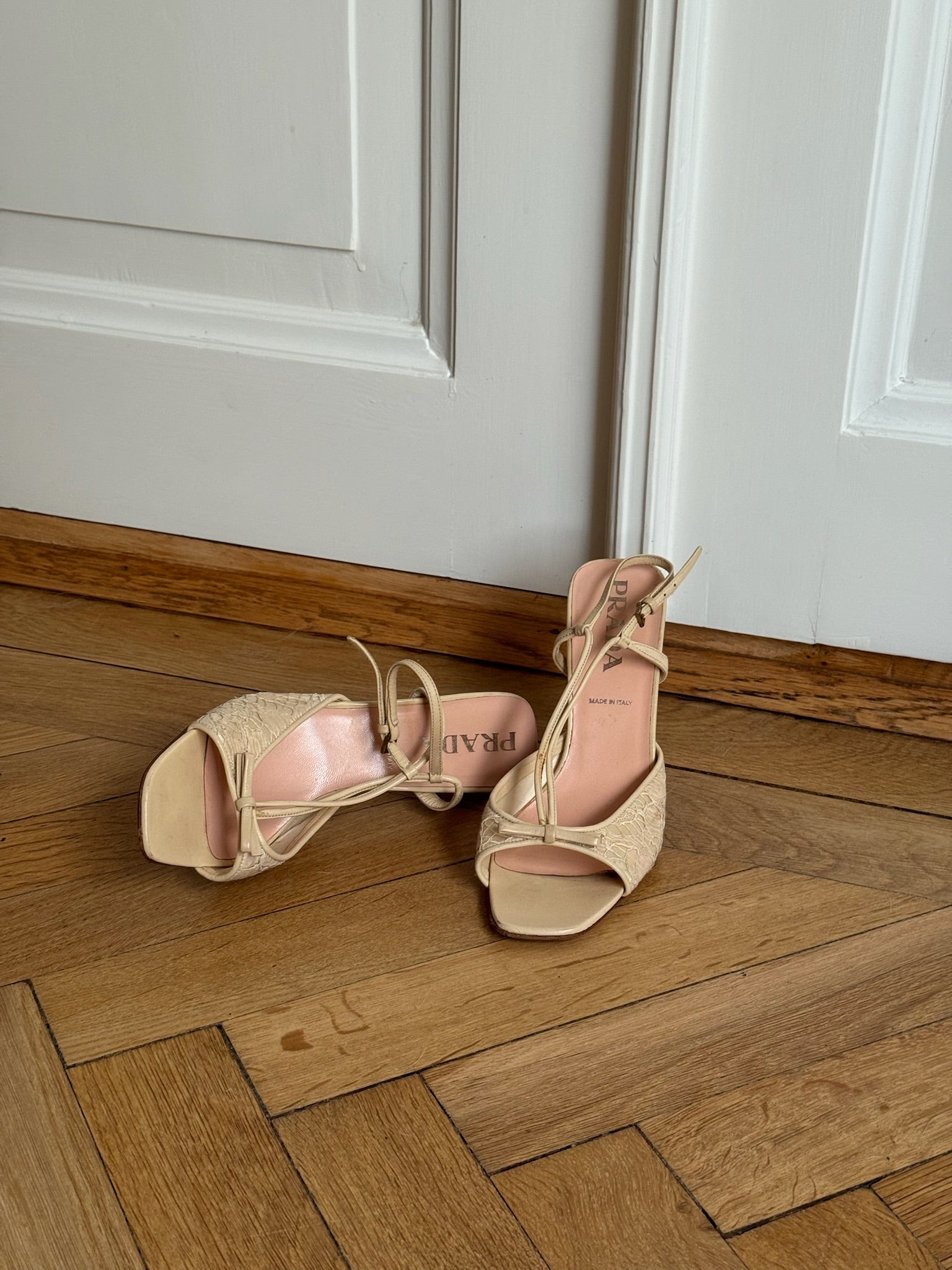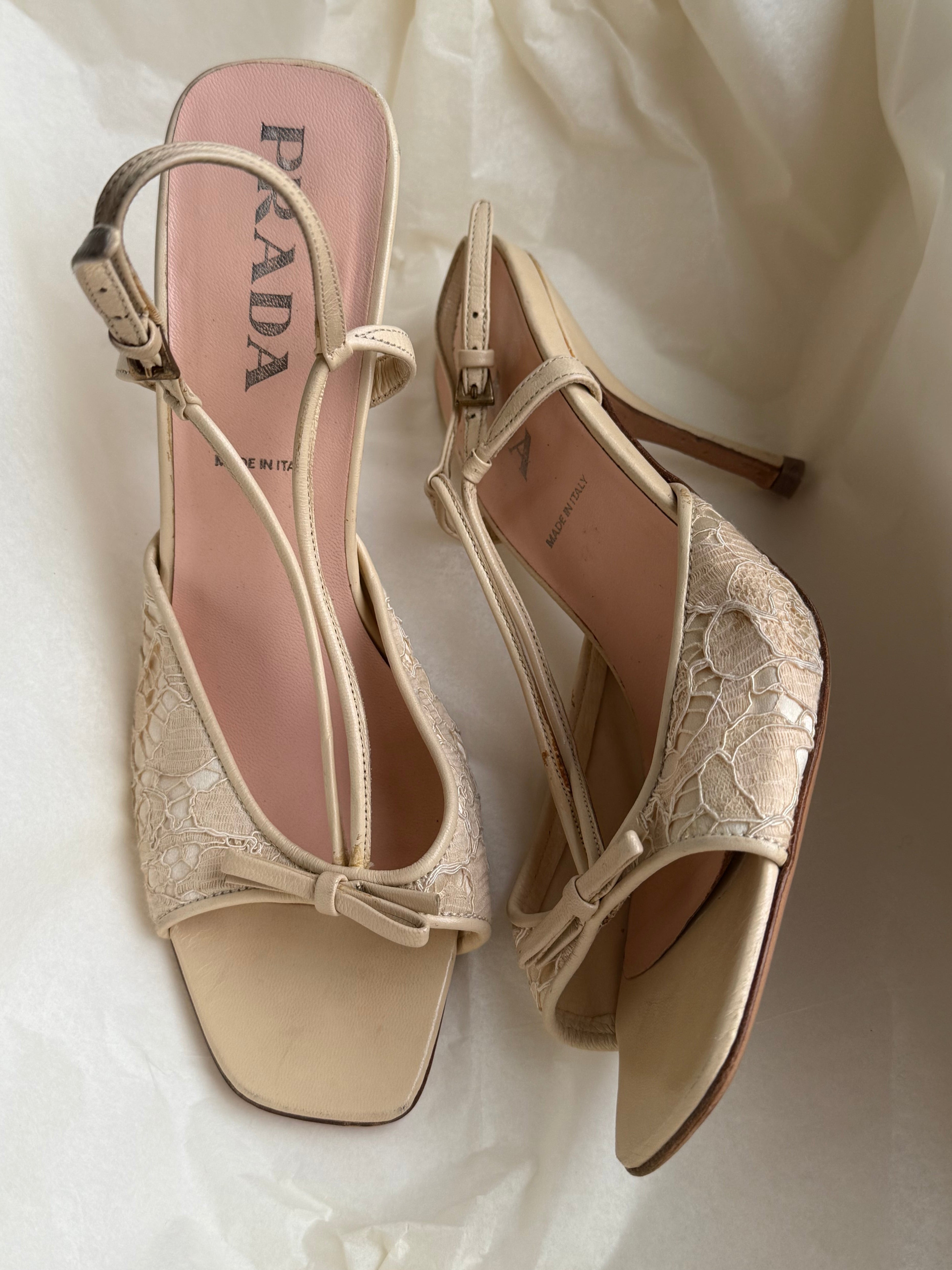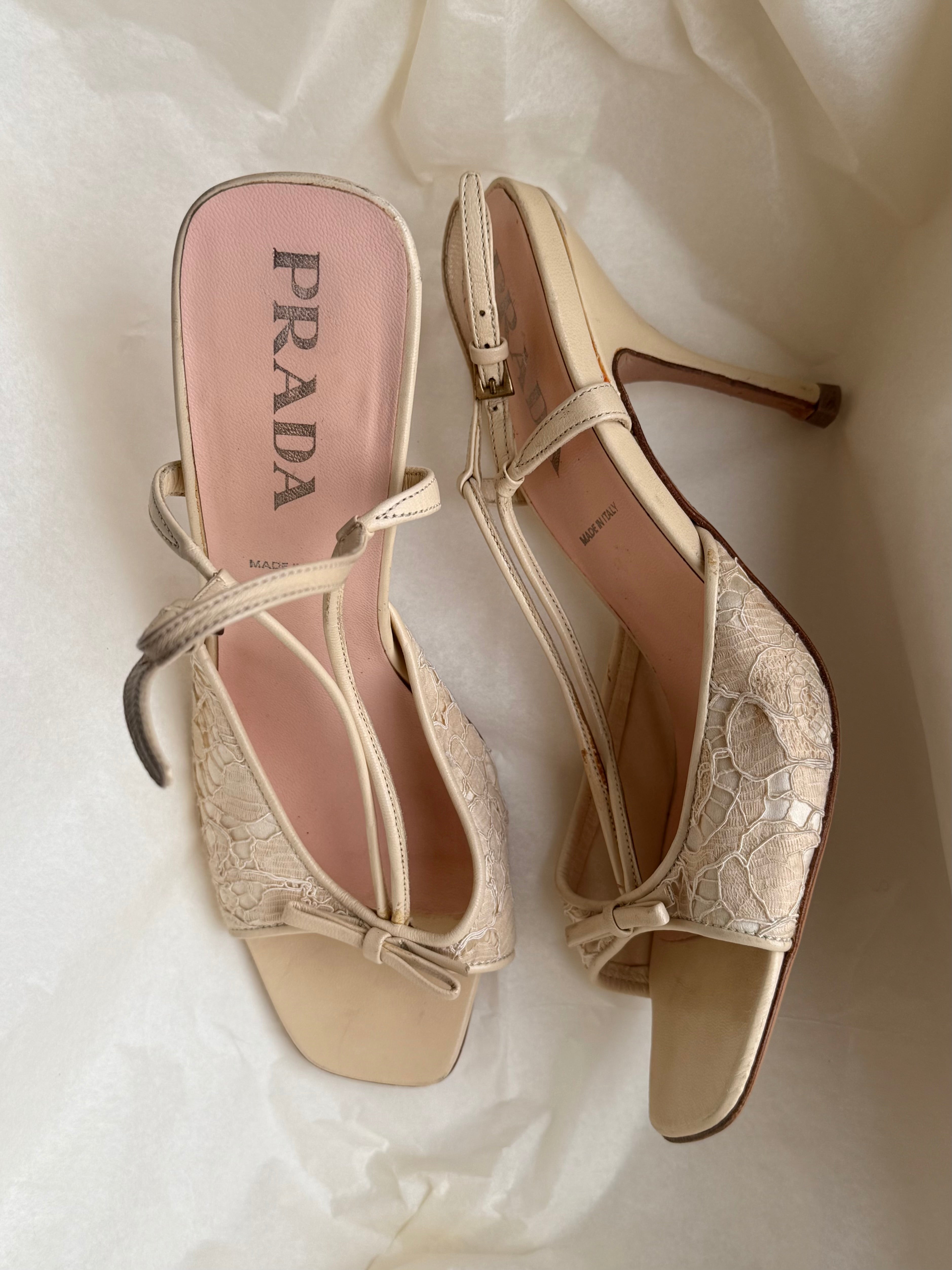 Beautiful vintage Prada cream lace strappy sandals with adjustable straps, a delicate bow front, light pink insoles and a slim stiletto heel.