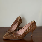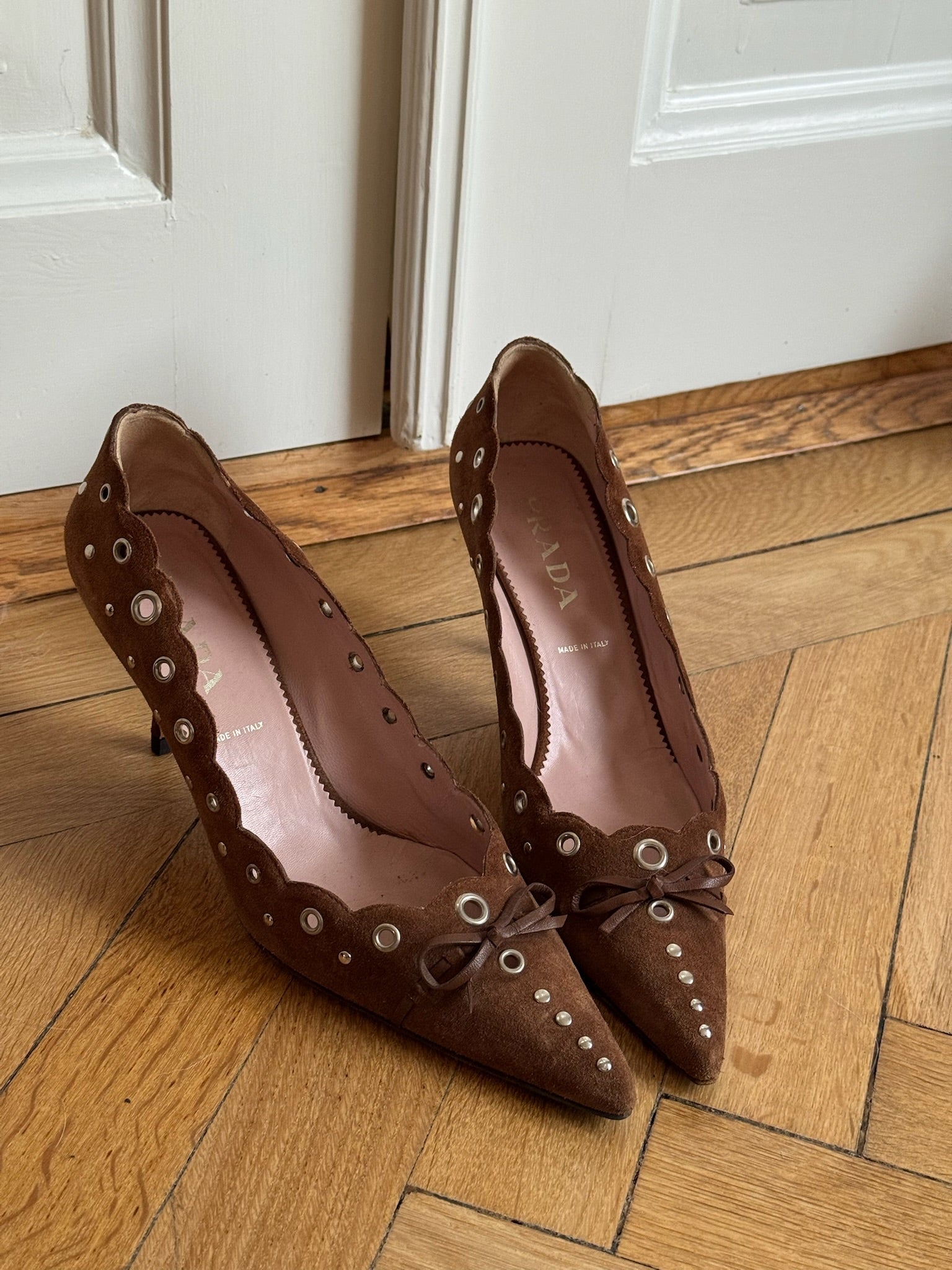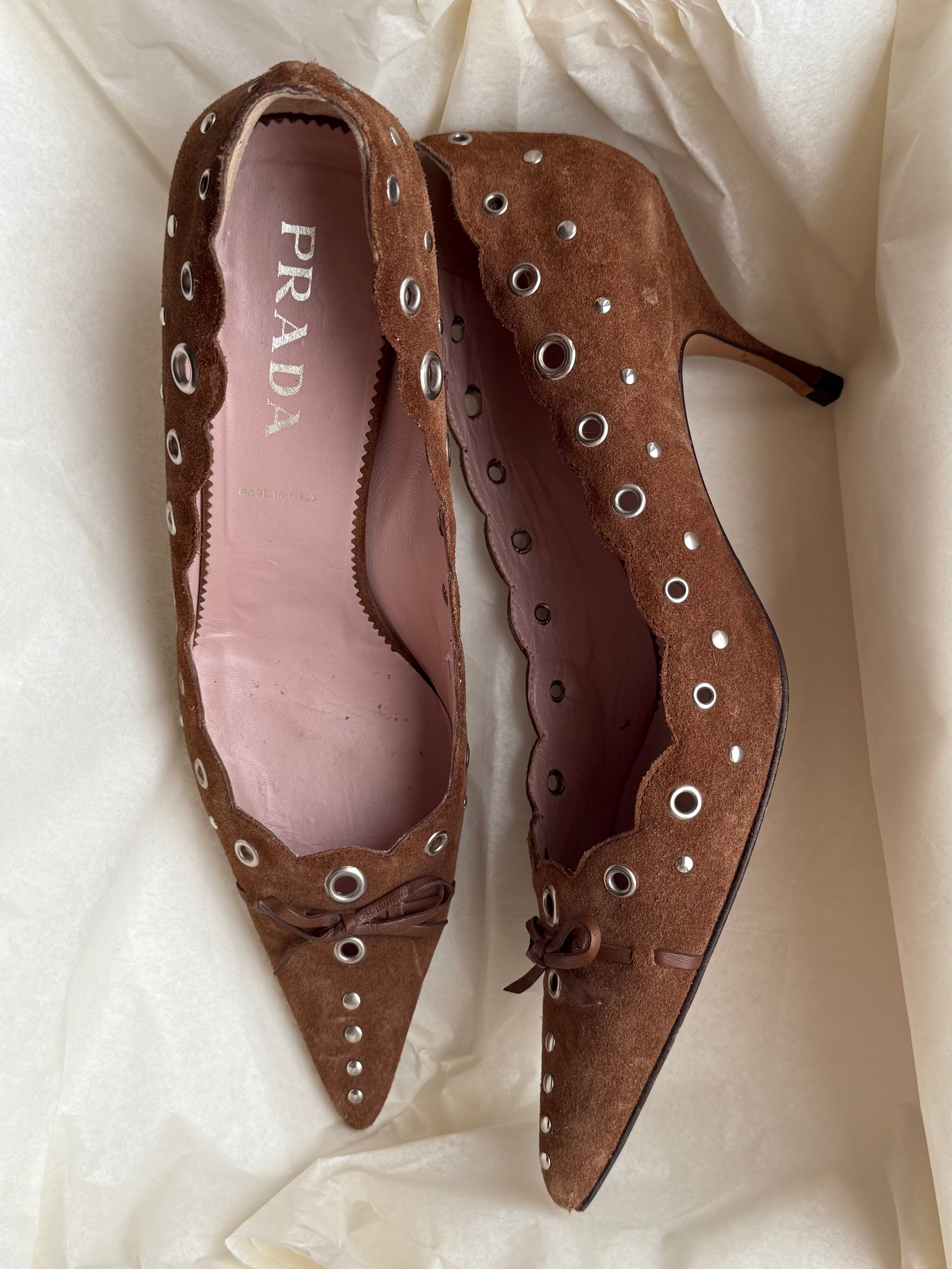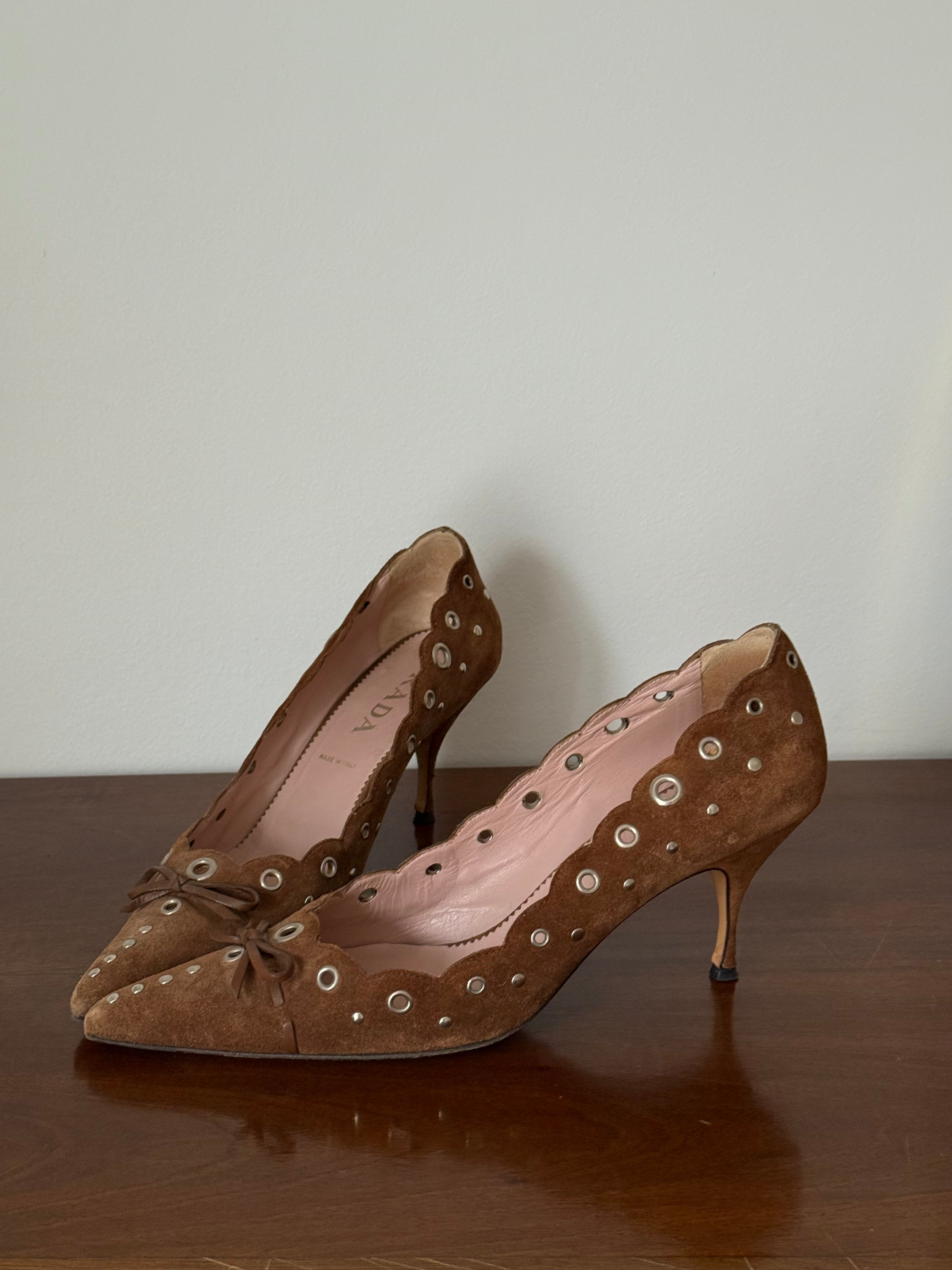Vintage 2000’s iconic Prada brown suede eyelet heels featuring scalloped edges, a pointed toe and a delicate front bow.