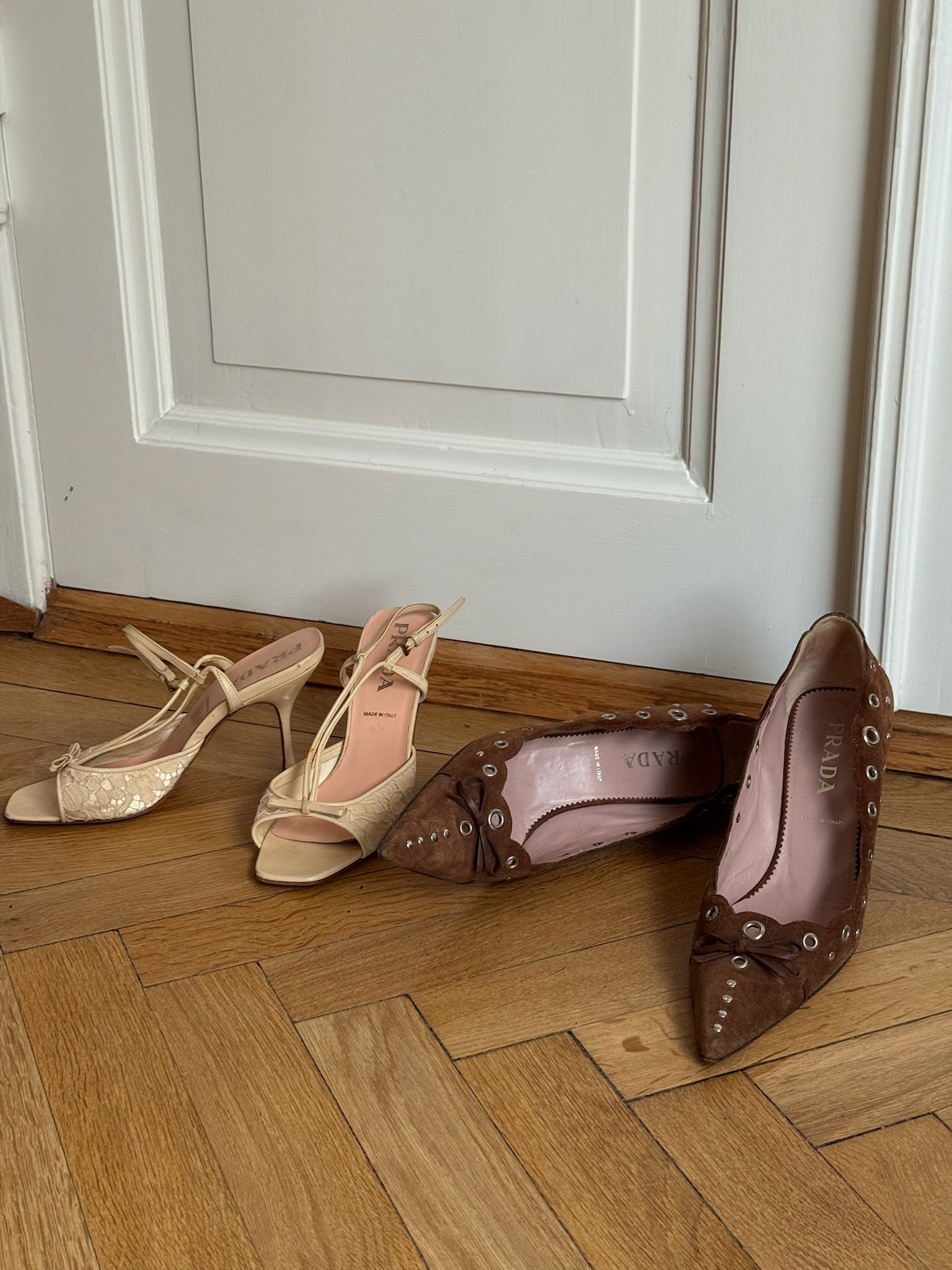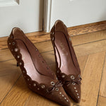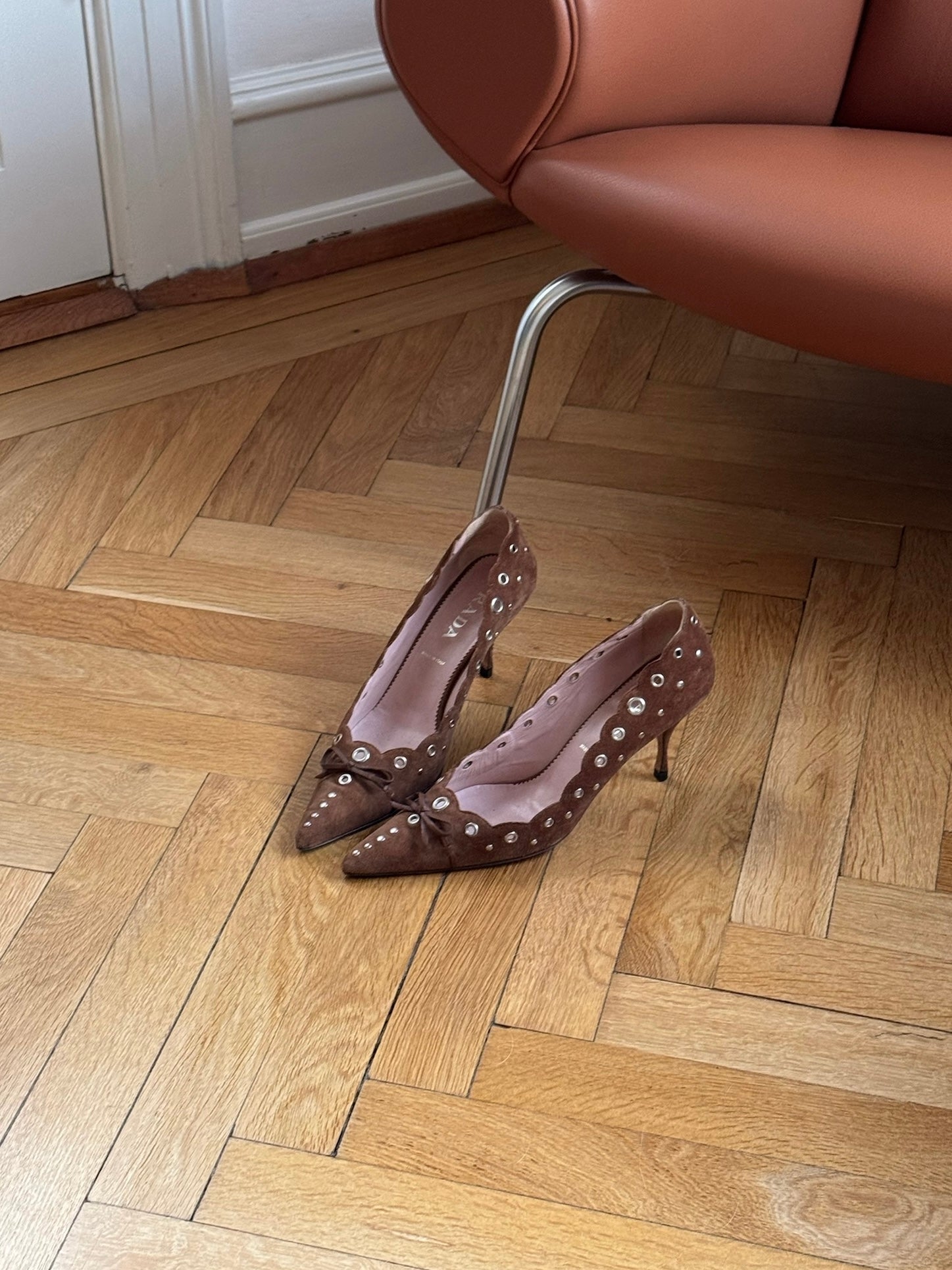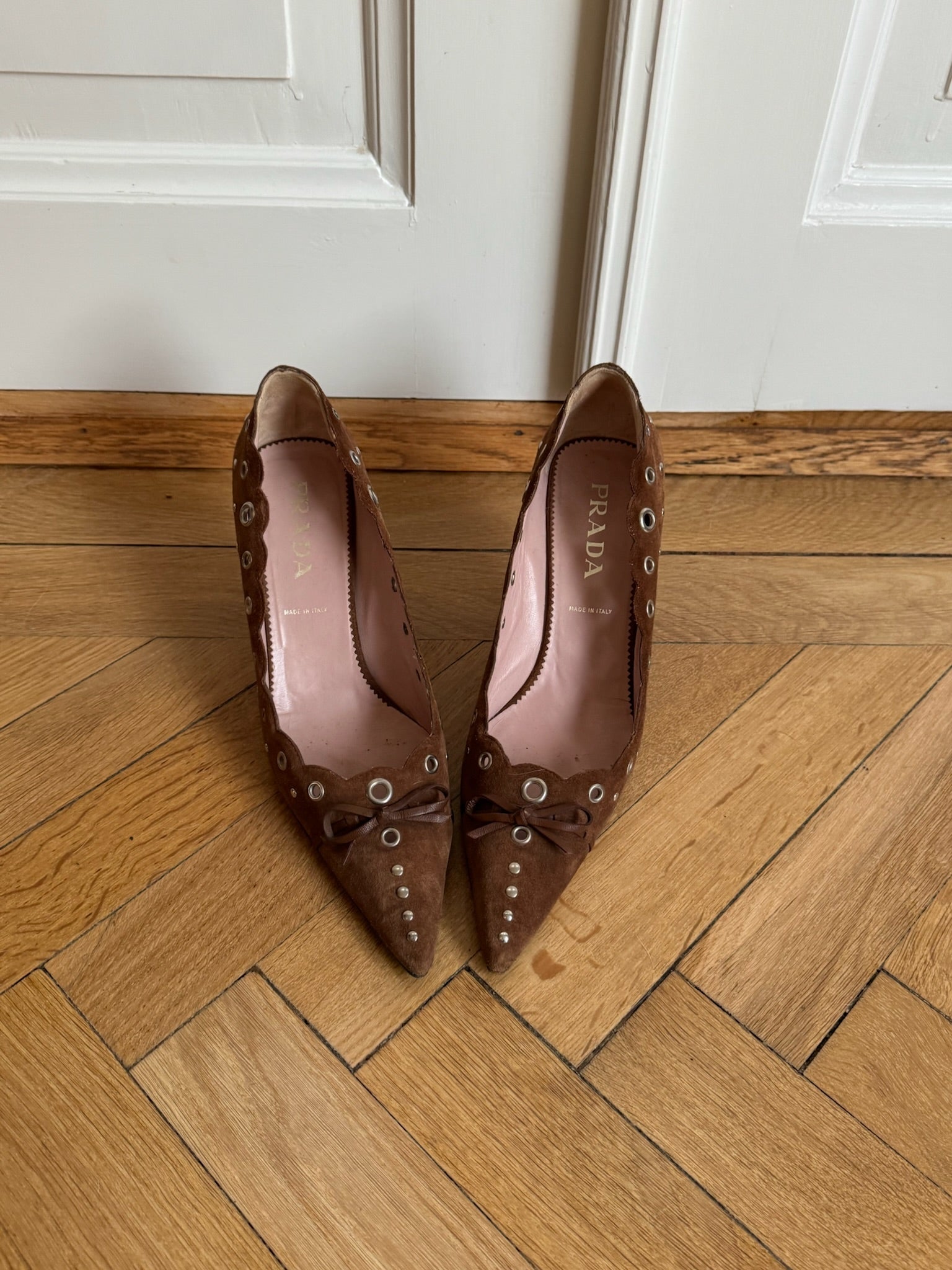 Vintage 2000’s iconic Prada brown suede eyelet heels featuring scalloped edges, a pointed toe and a delicate front bow.