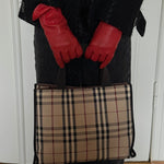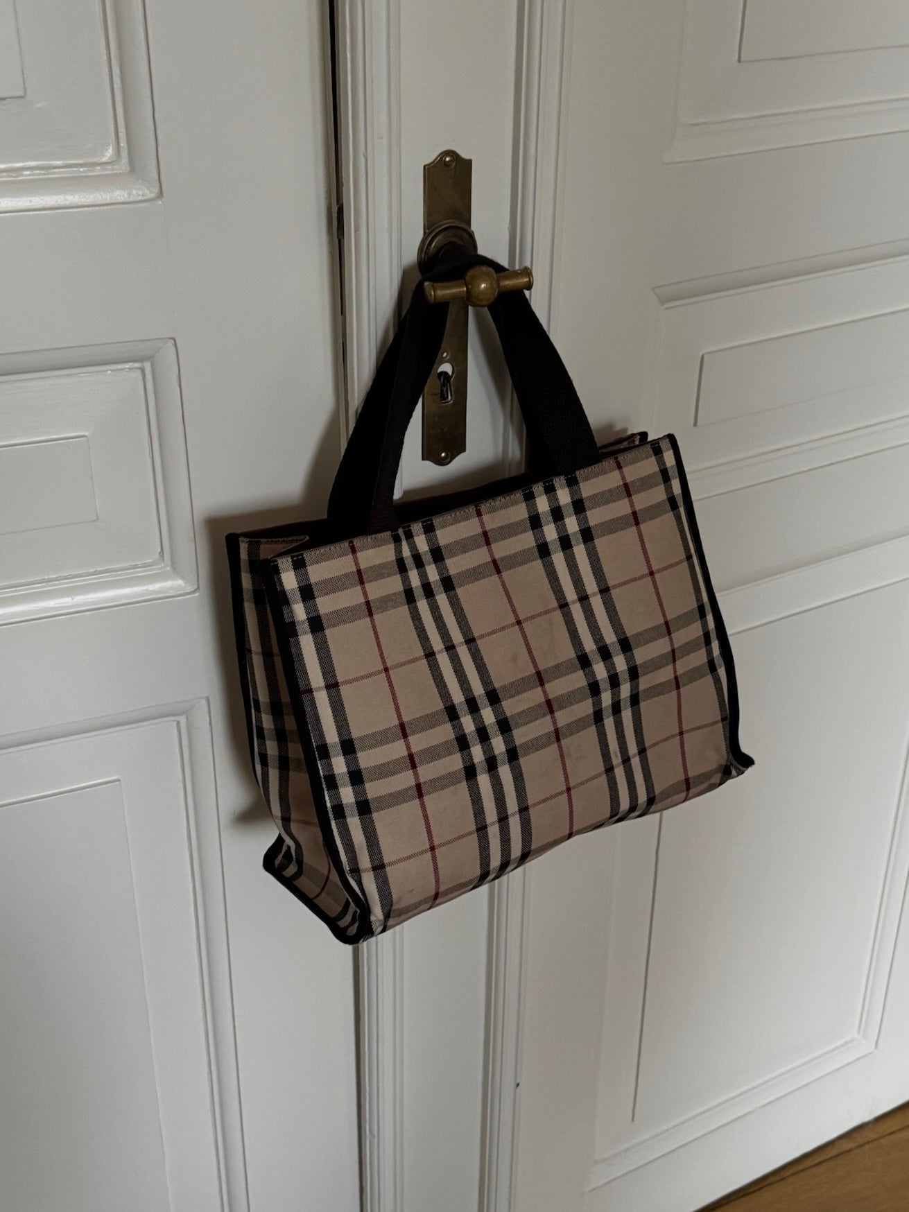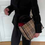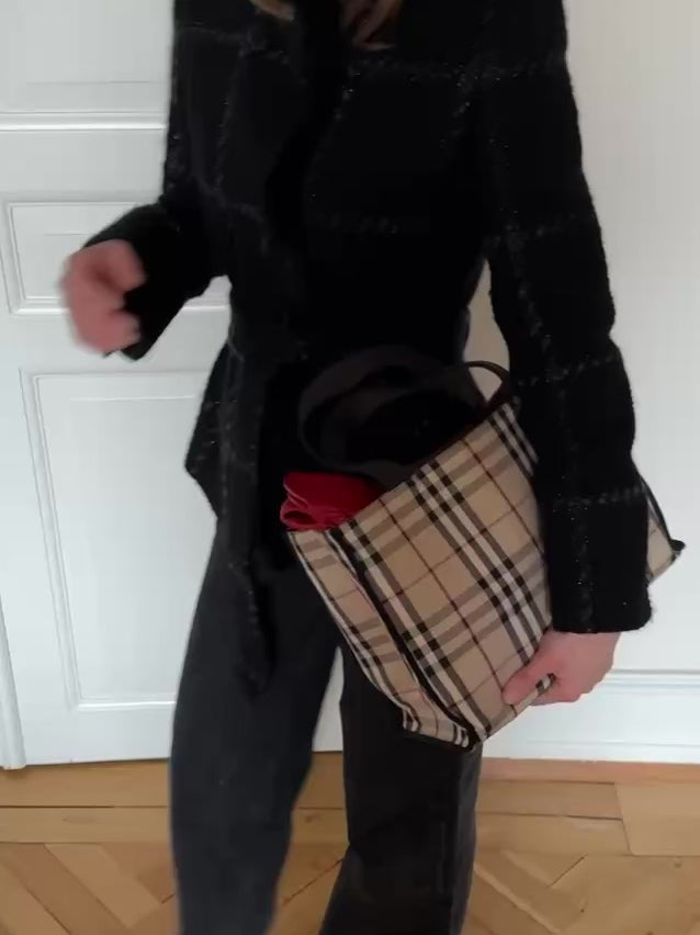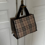 Vintage Burberry check tote in beige coated canvas, complemented by black handles.