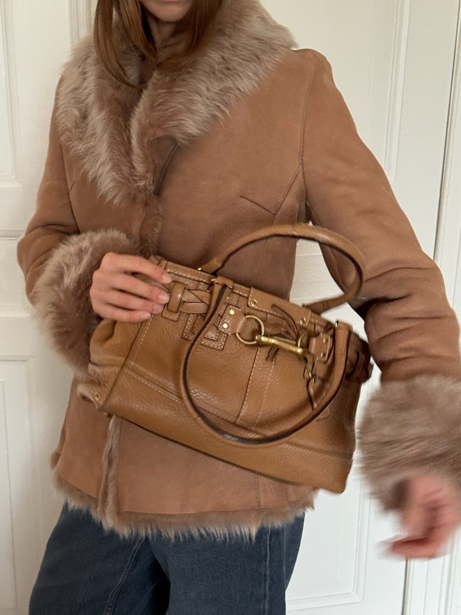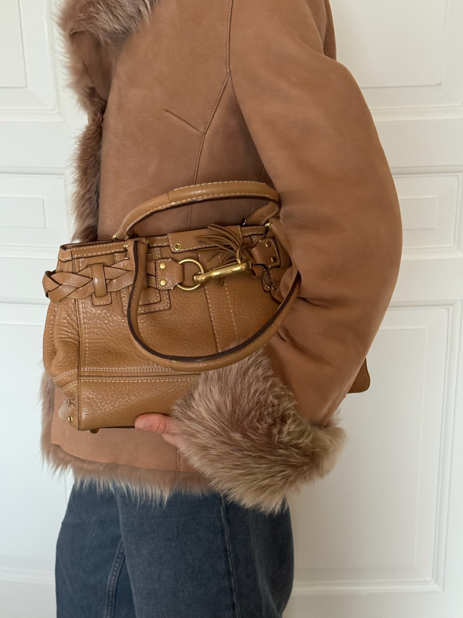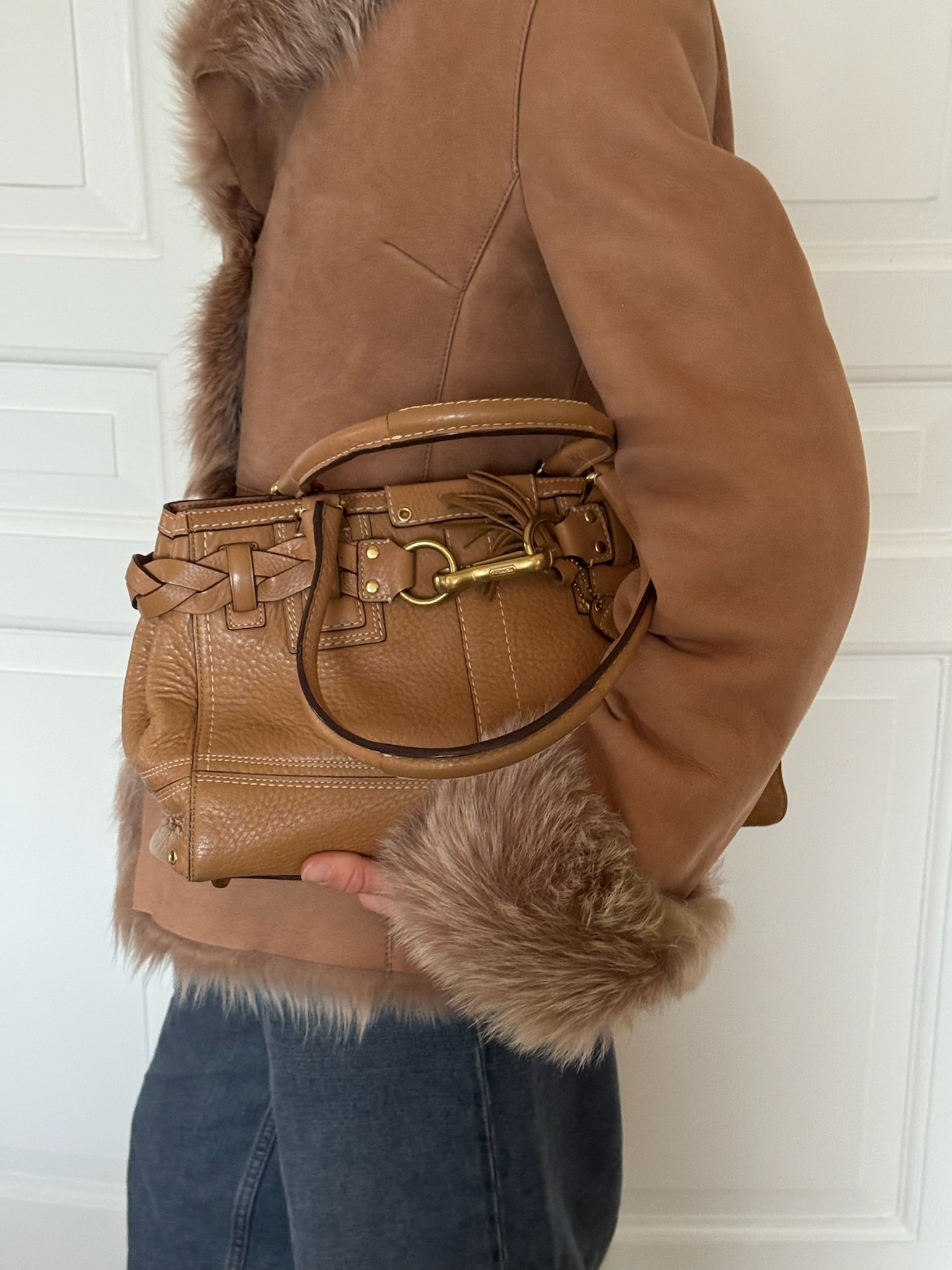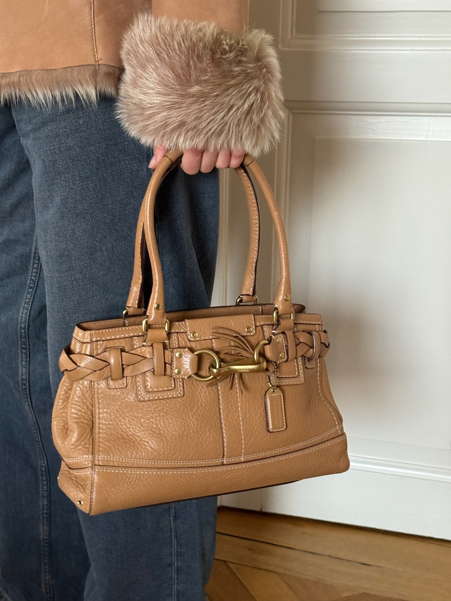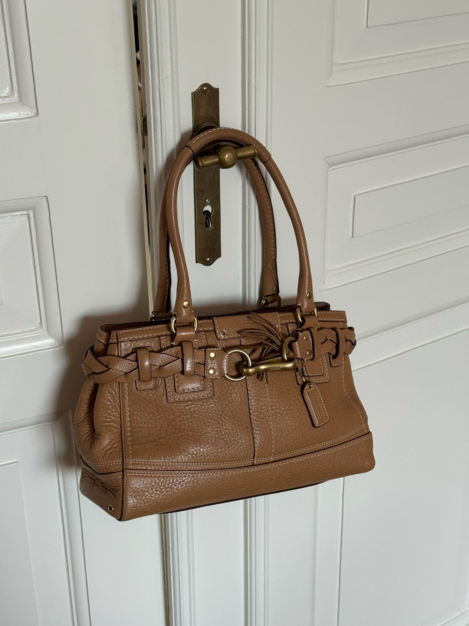 Vintage Coach Hamilton hobo bag crafted from soft brown pebbled leather with gold-tone hardware and signature horsebit detail. Features double handles and a spacious interior.