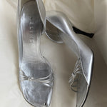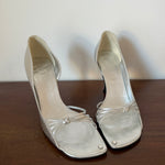 Vintage silver leather Celine heels with a leather bow accent and small stone detail at the toe. Designed by Michael Kors in the early 2000s and comes with the original box.