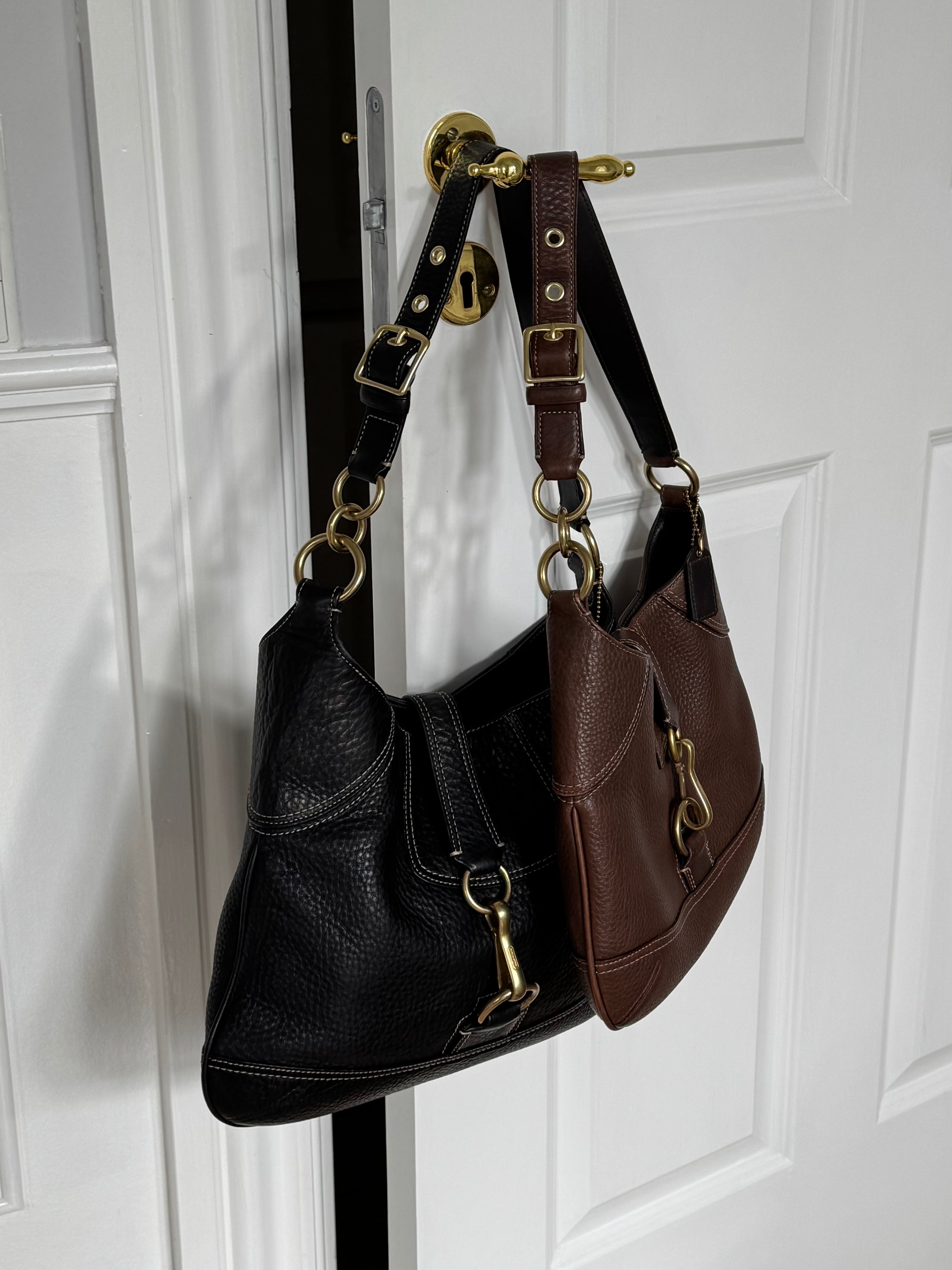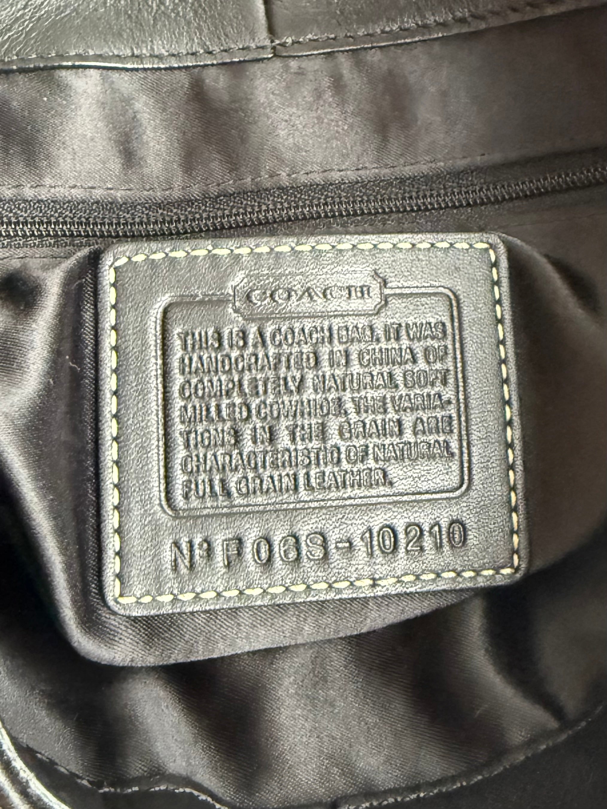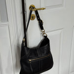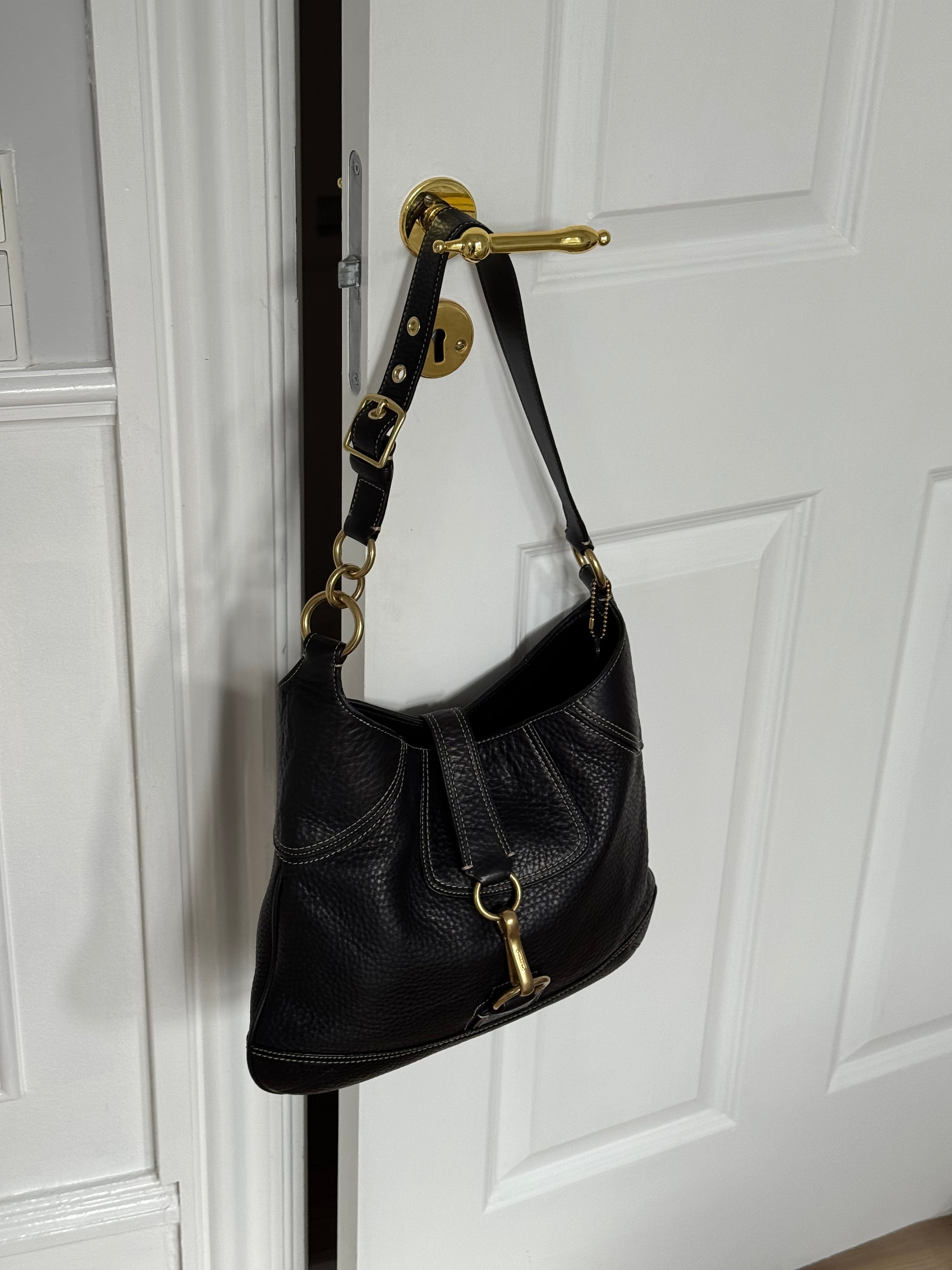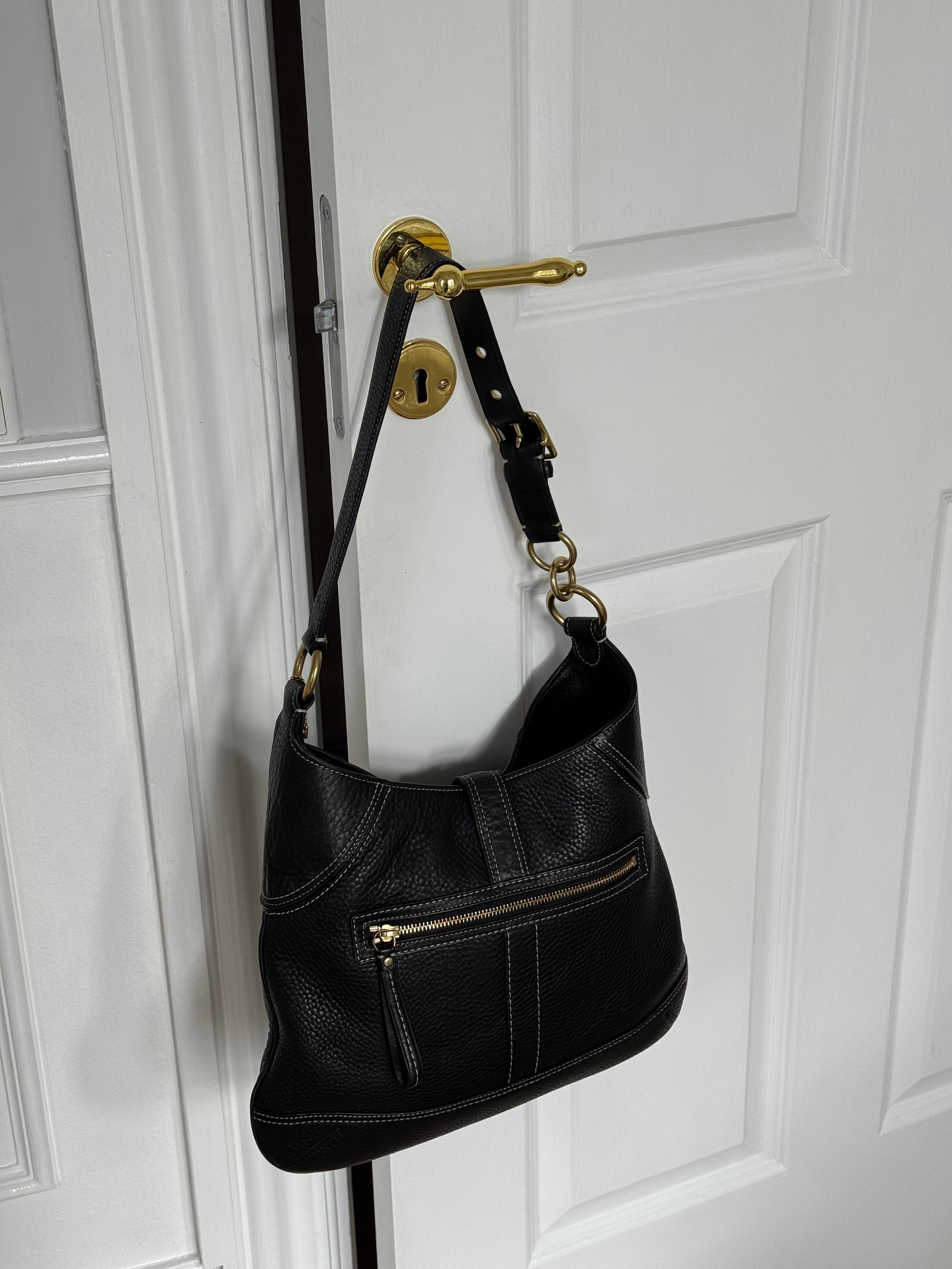 Vintage Coach leather Hampton hobo bag, crafted in pebbled leather with gold-tone hardware and contrast stitching. Features a front buckle detail, zip pocket at the back, and adjustable strap.