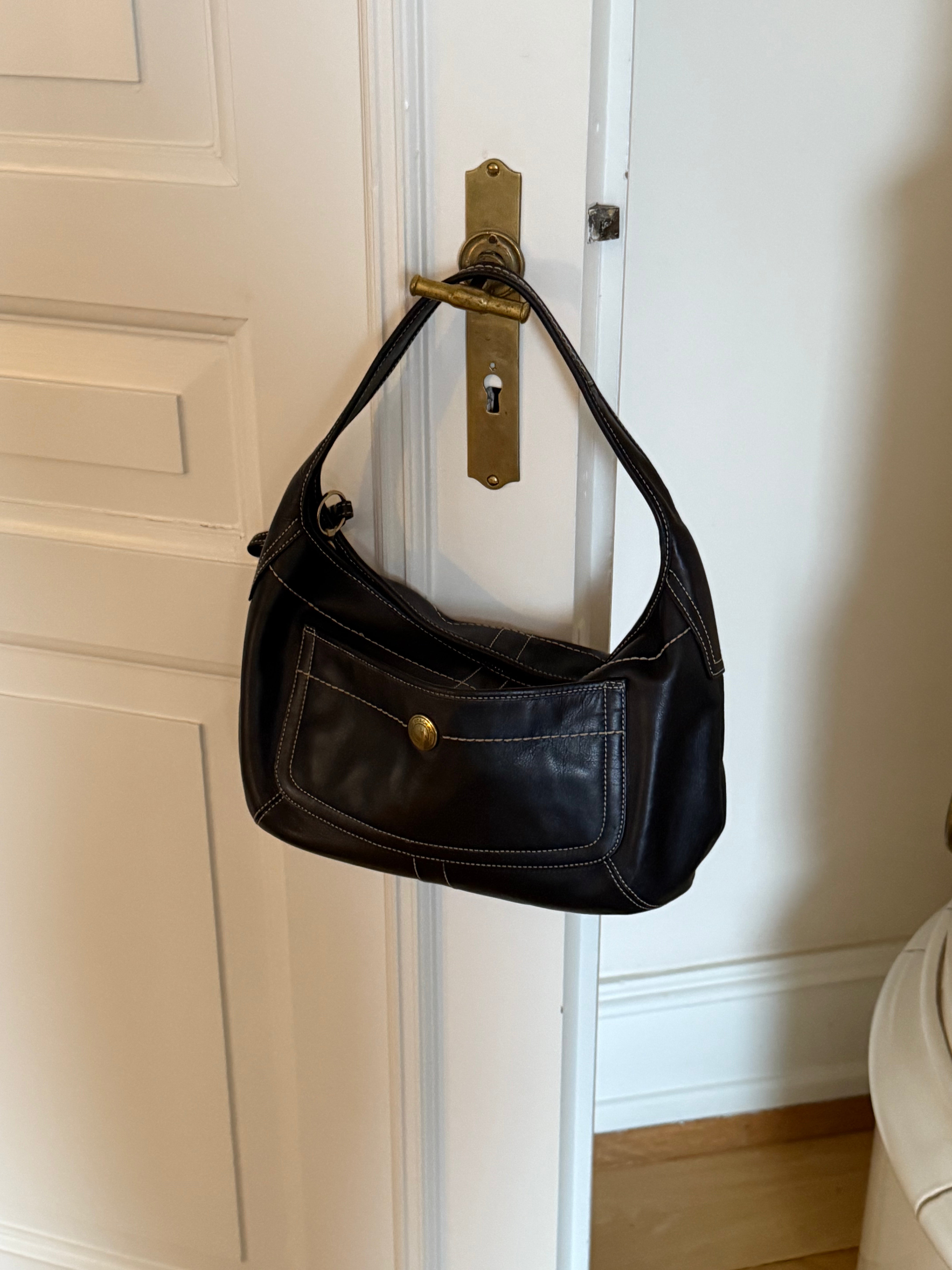 Vintage Coach shoulder bag in black leather with white stitching and gold-colored hardware.