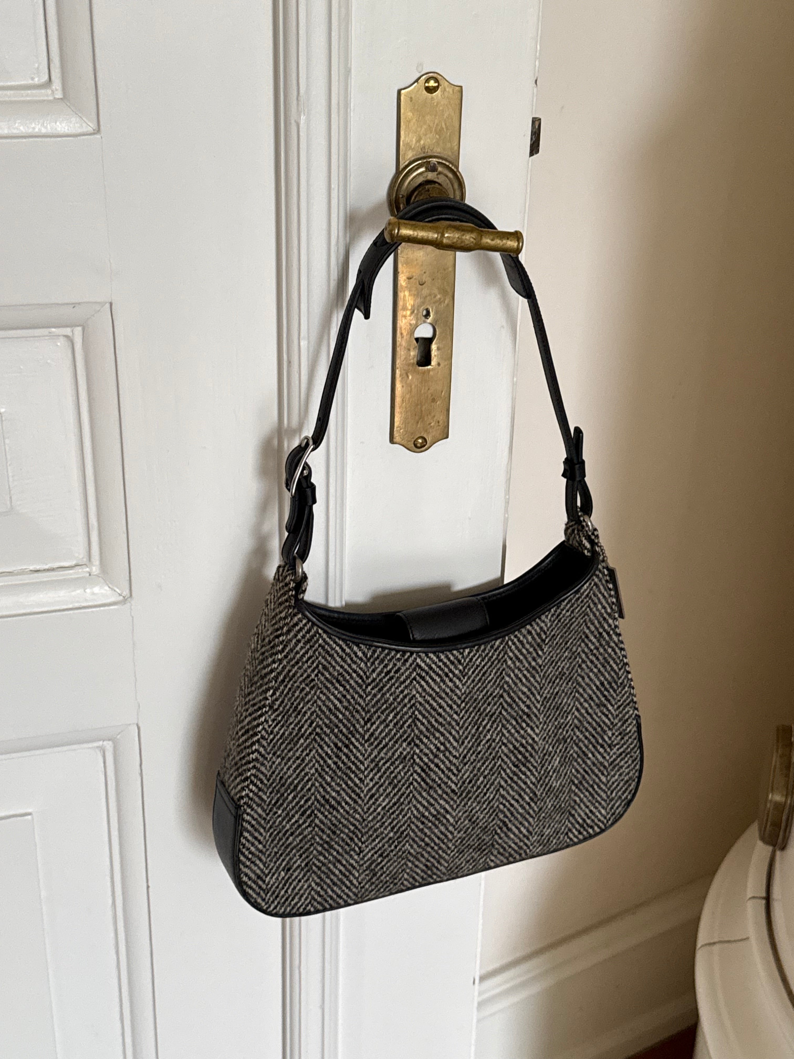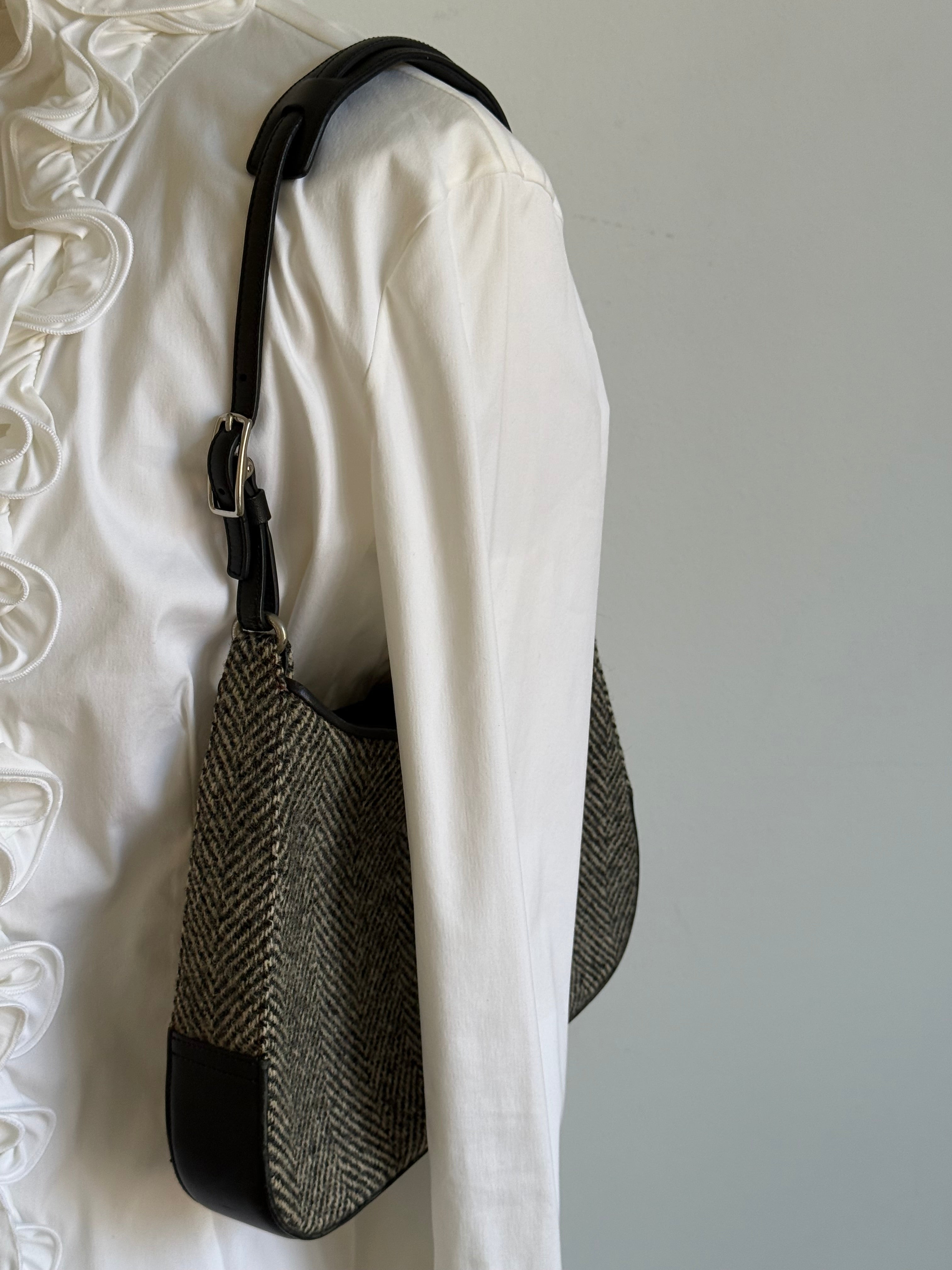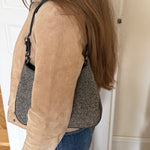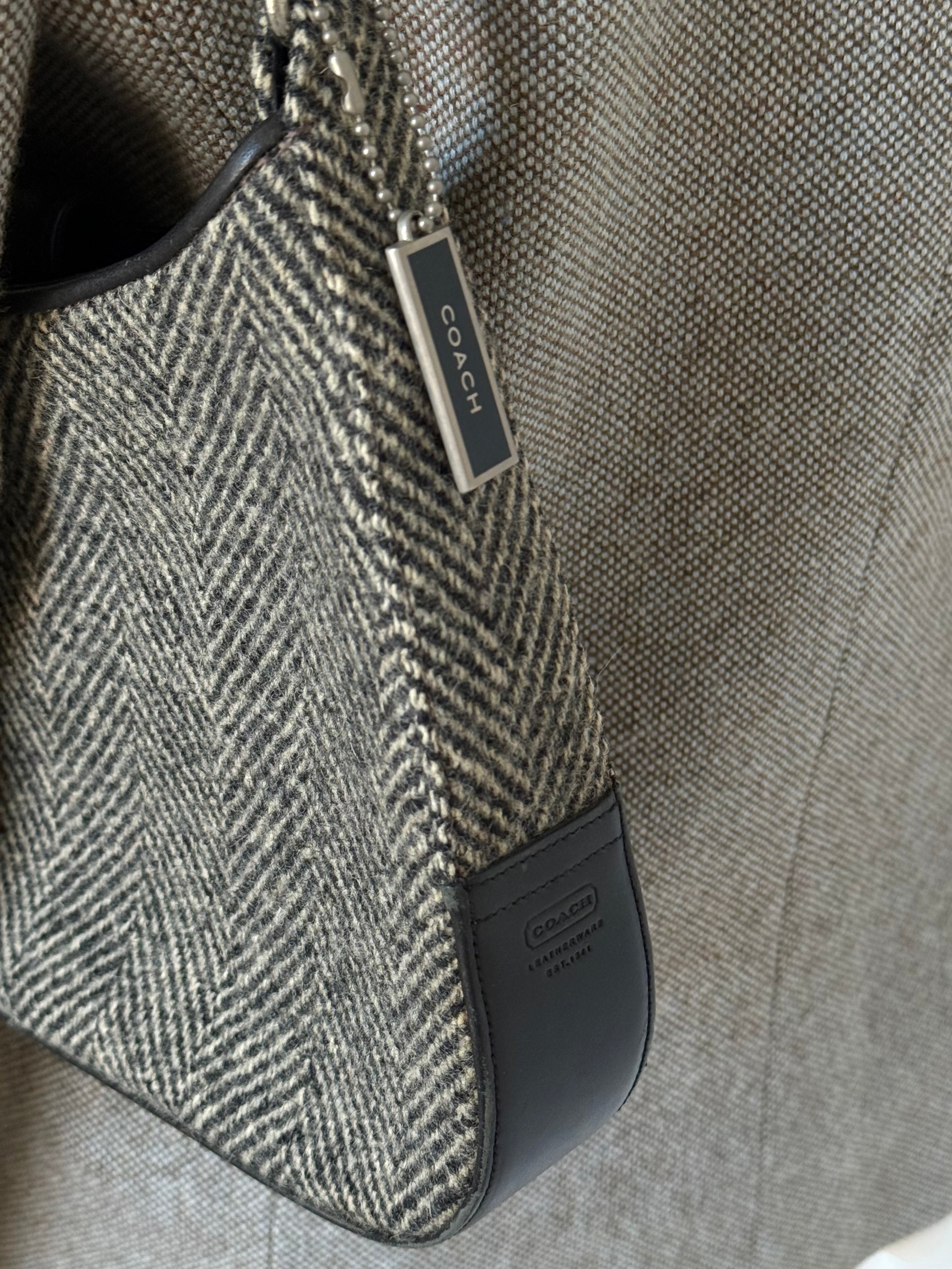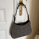 Vintage Coach hobo bag from the early 2000s in grey herringbone wool with black leather trim and silver-tone hardware.