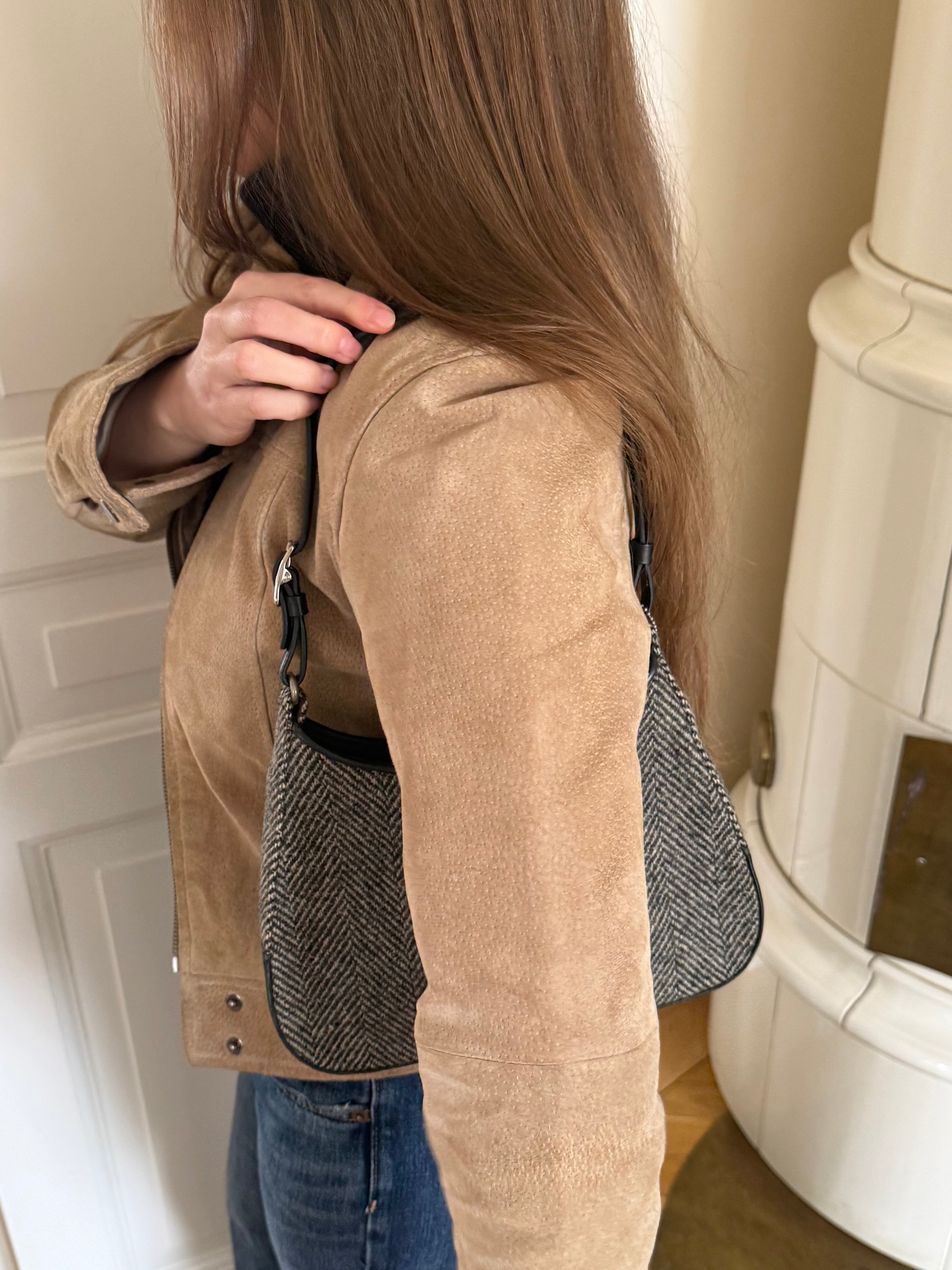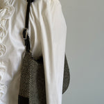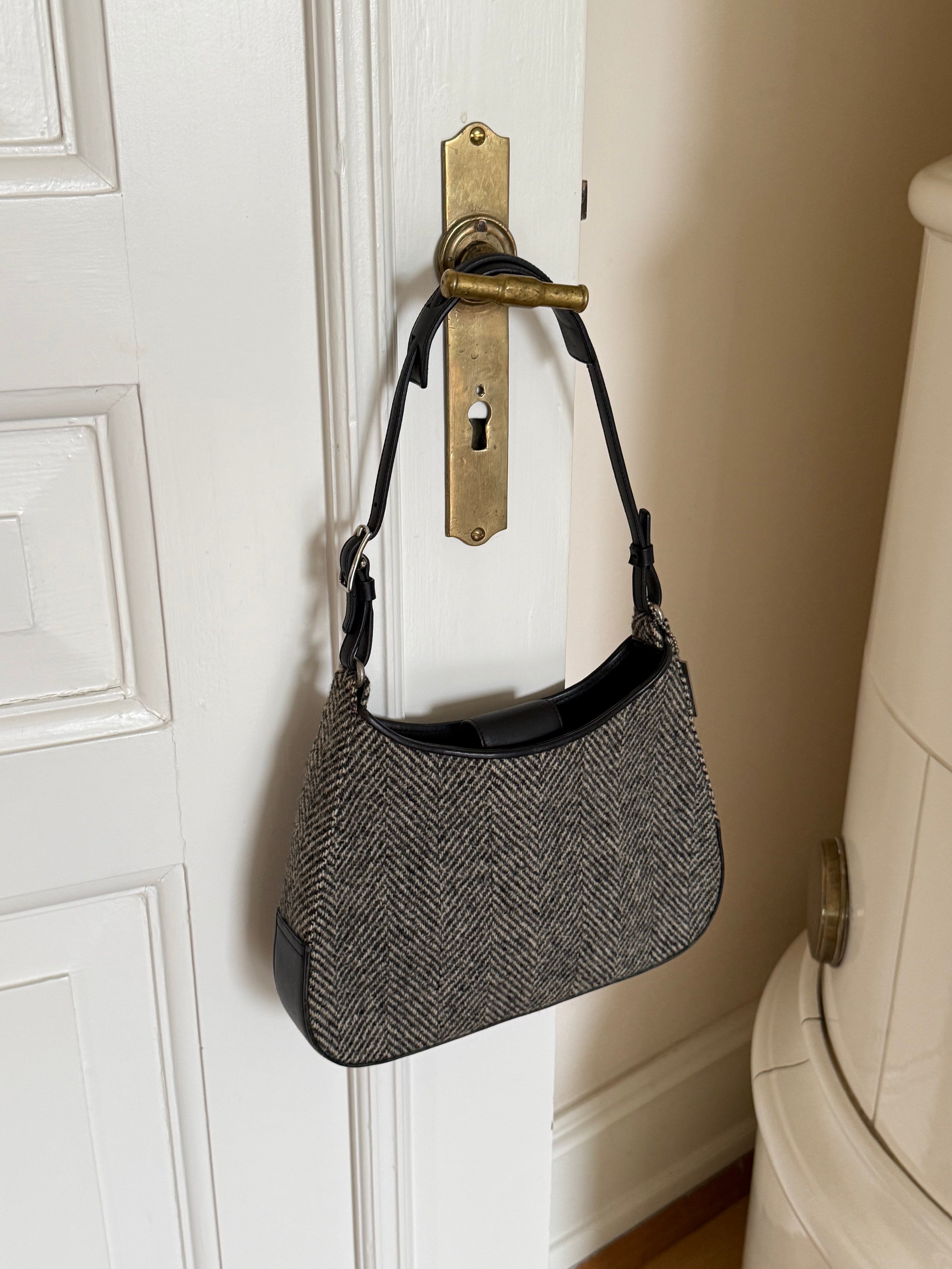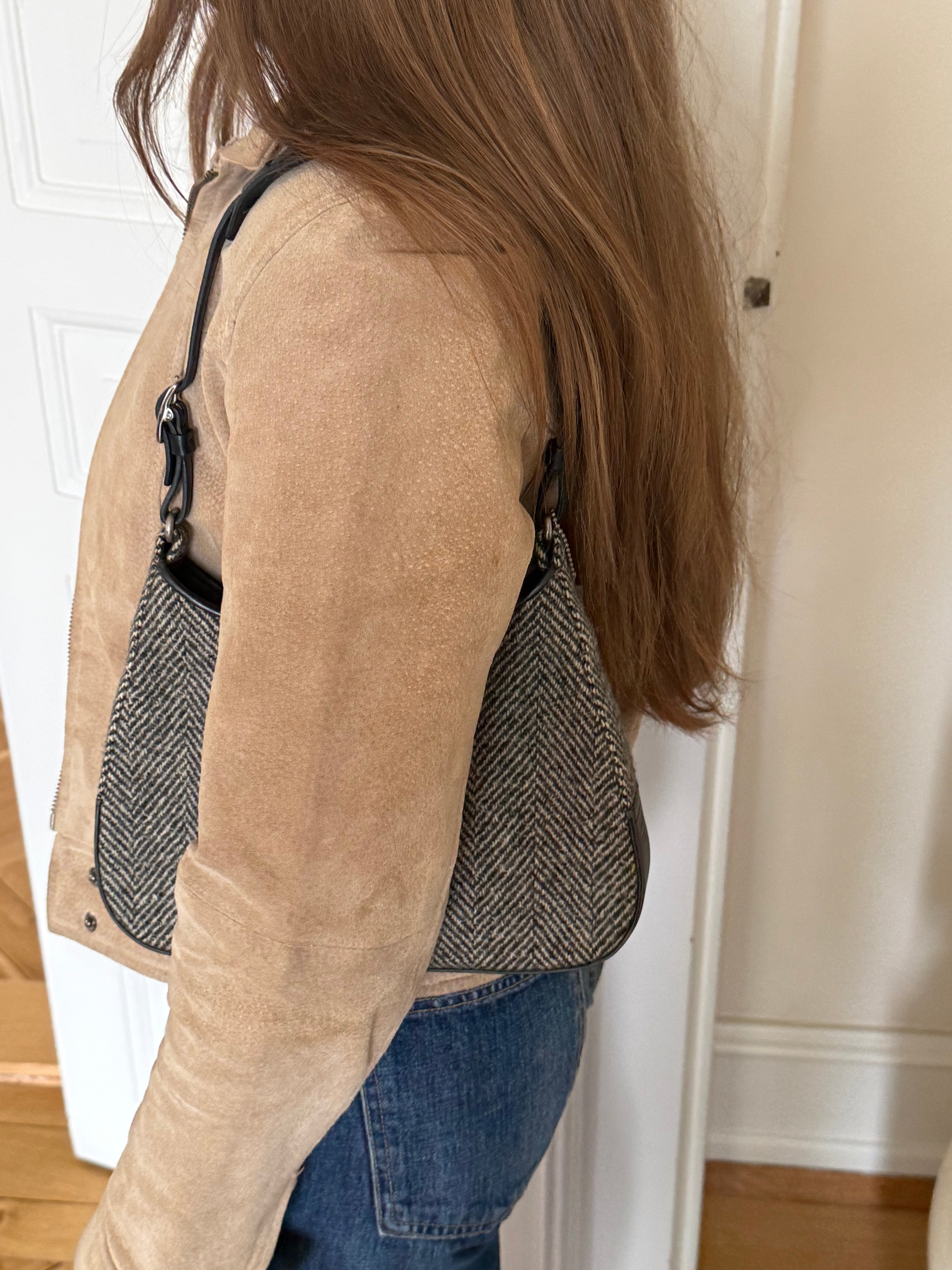 Vintage Coach hobo bag from the early 2000s in grey herringbone wool with black leather trim and silver-tone hardware.