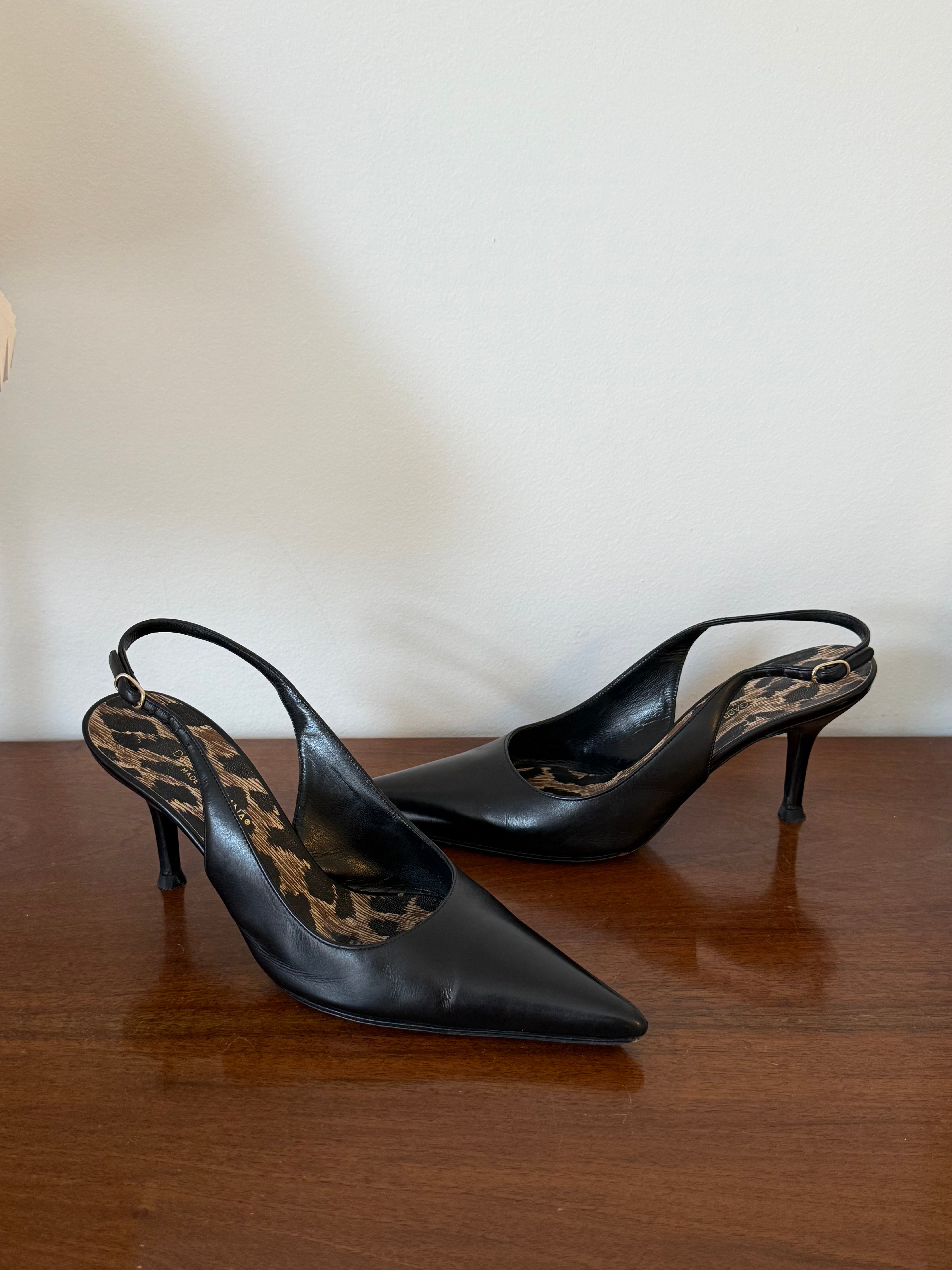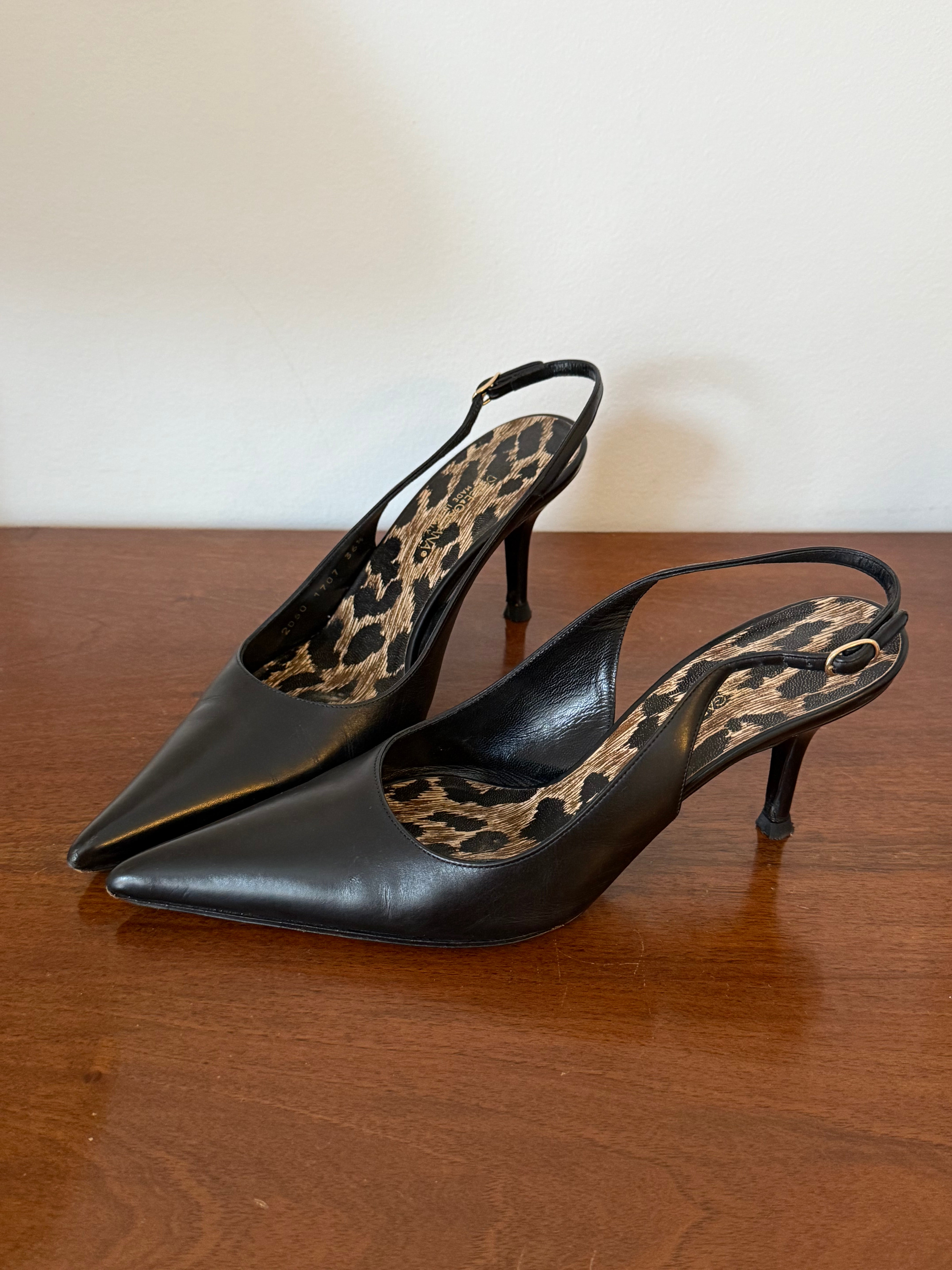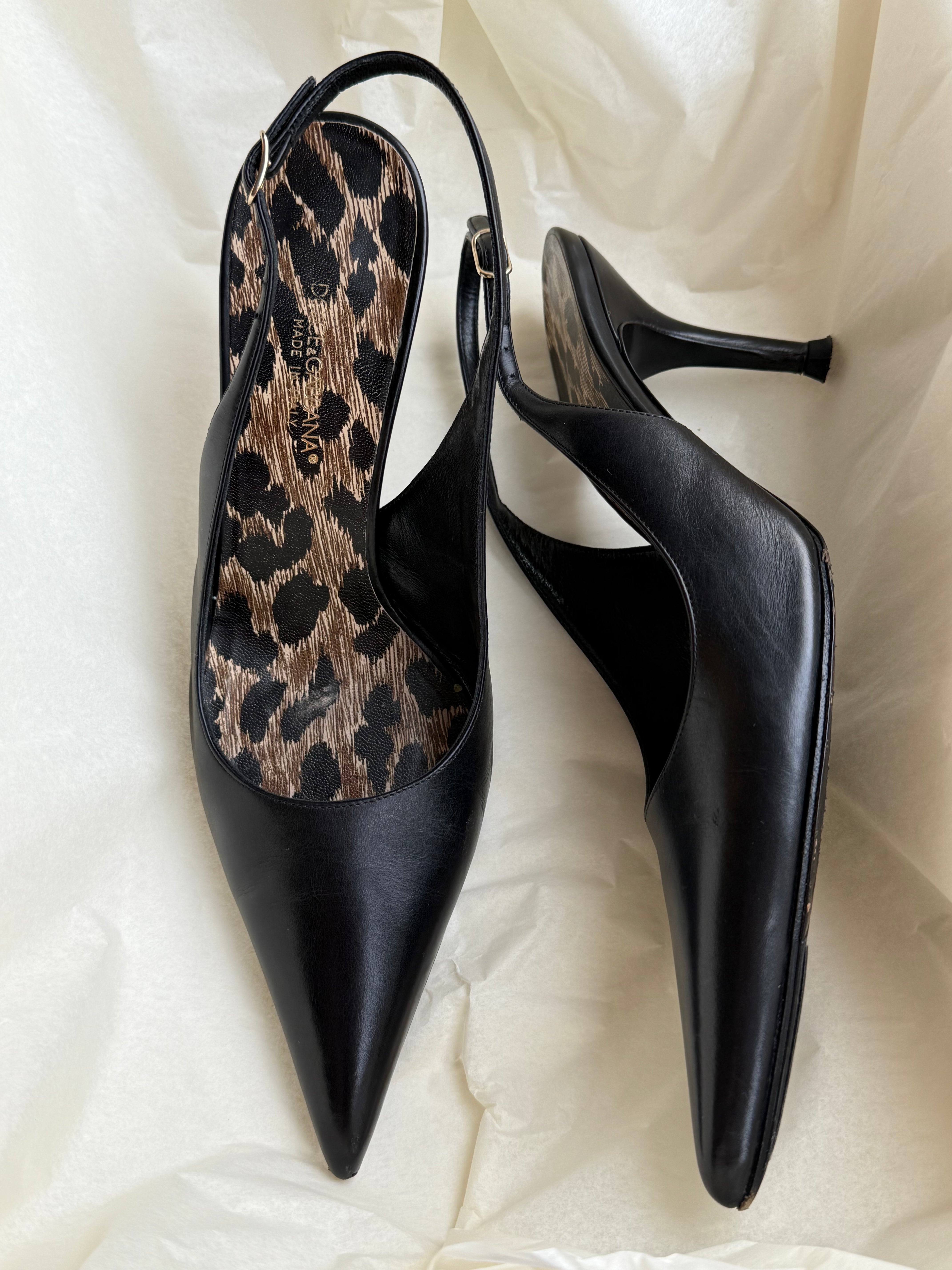 Vintage black leather slingback pumps from Dolce & Gabbana with a pointed toe and signature leopard-print insole. Features a slim heel and adjustable strap.
