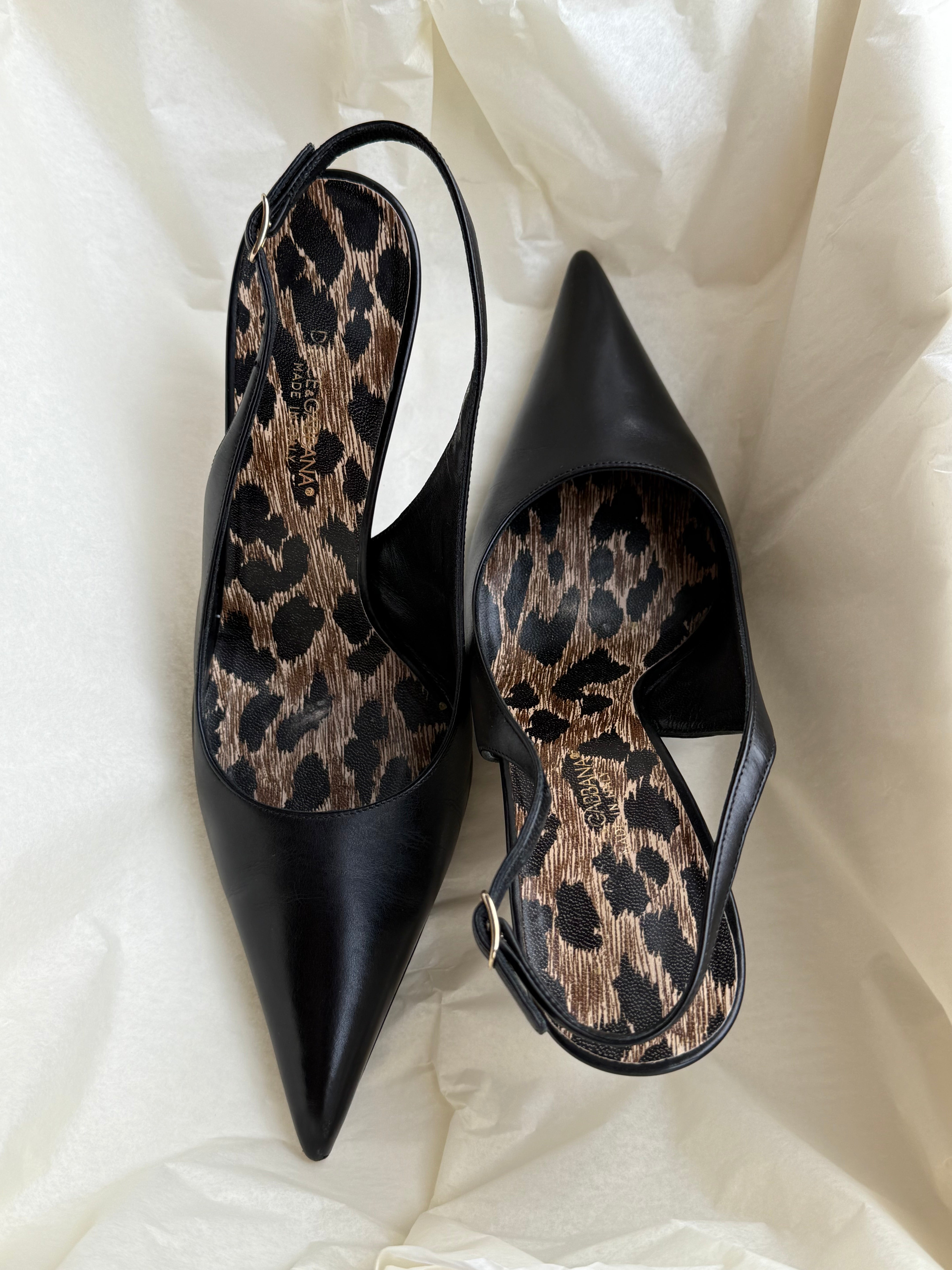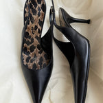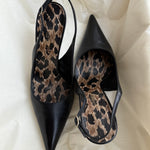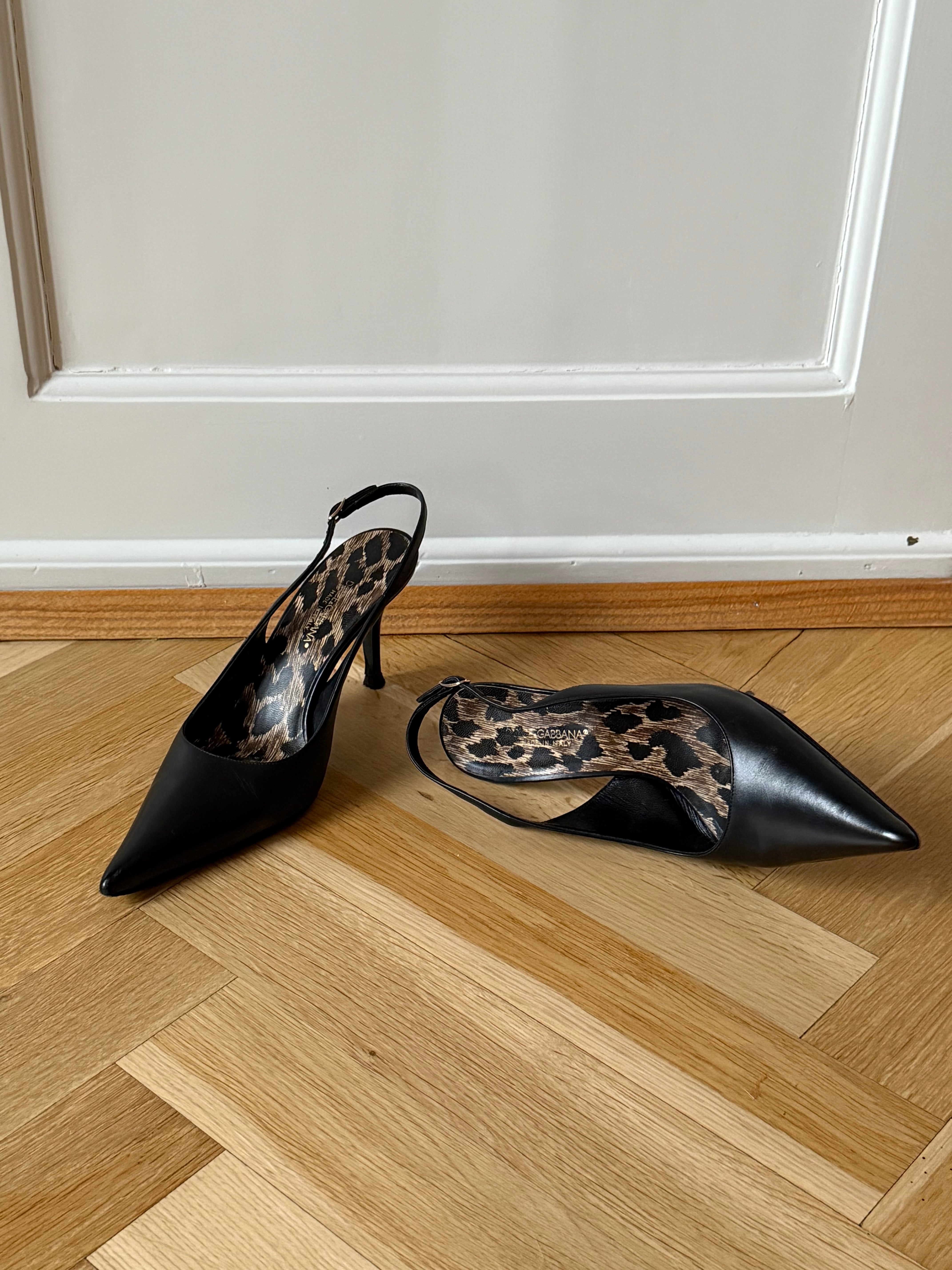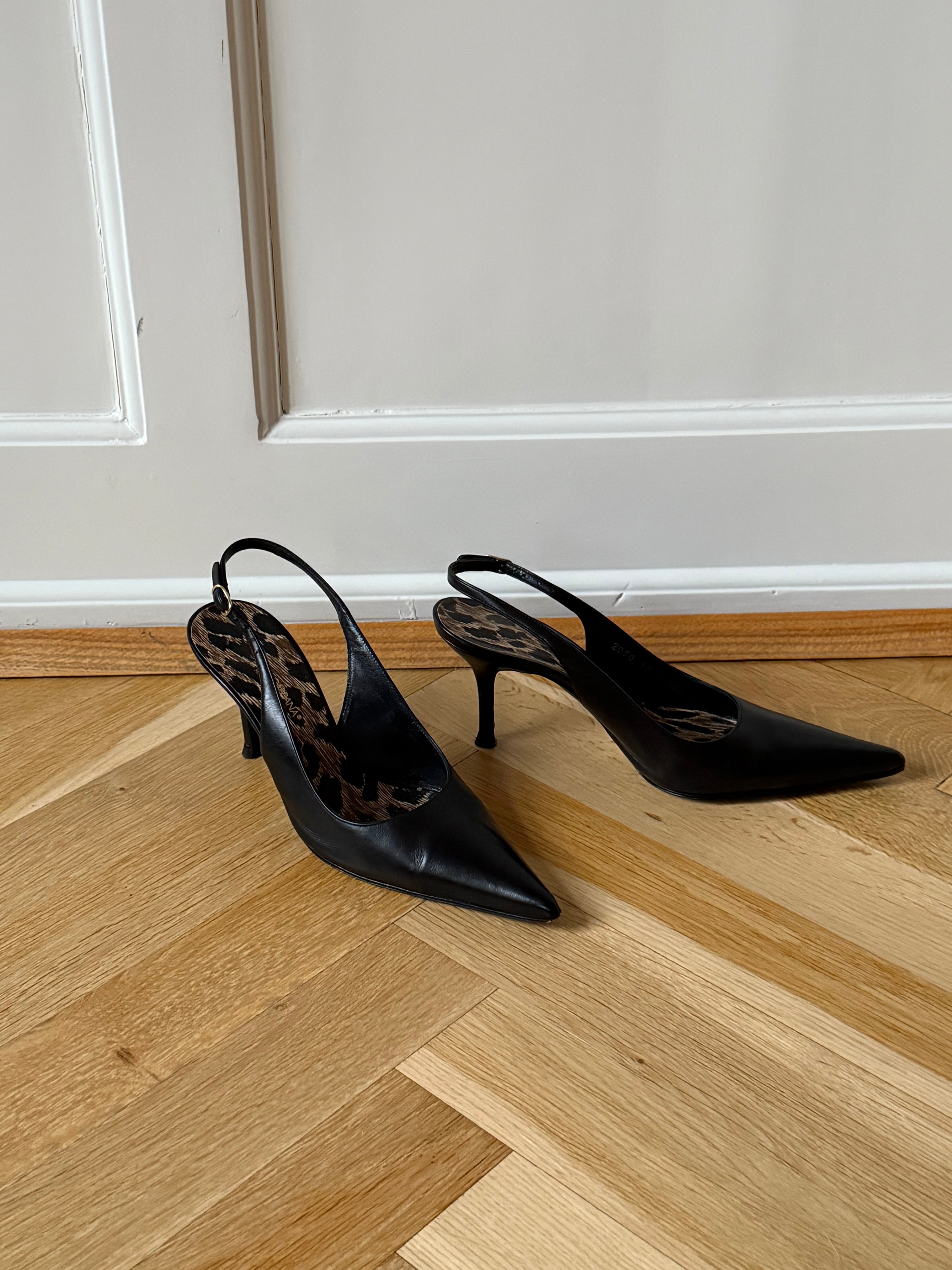 Vintage black leather slingback pumps from Dolce & Gabbana with a pointed toe and signature leopard-print insole. Features a slim heel and adjustable strap.