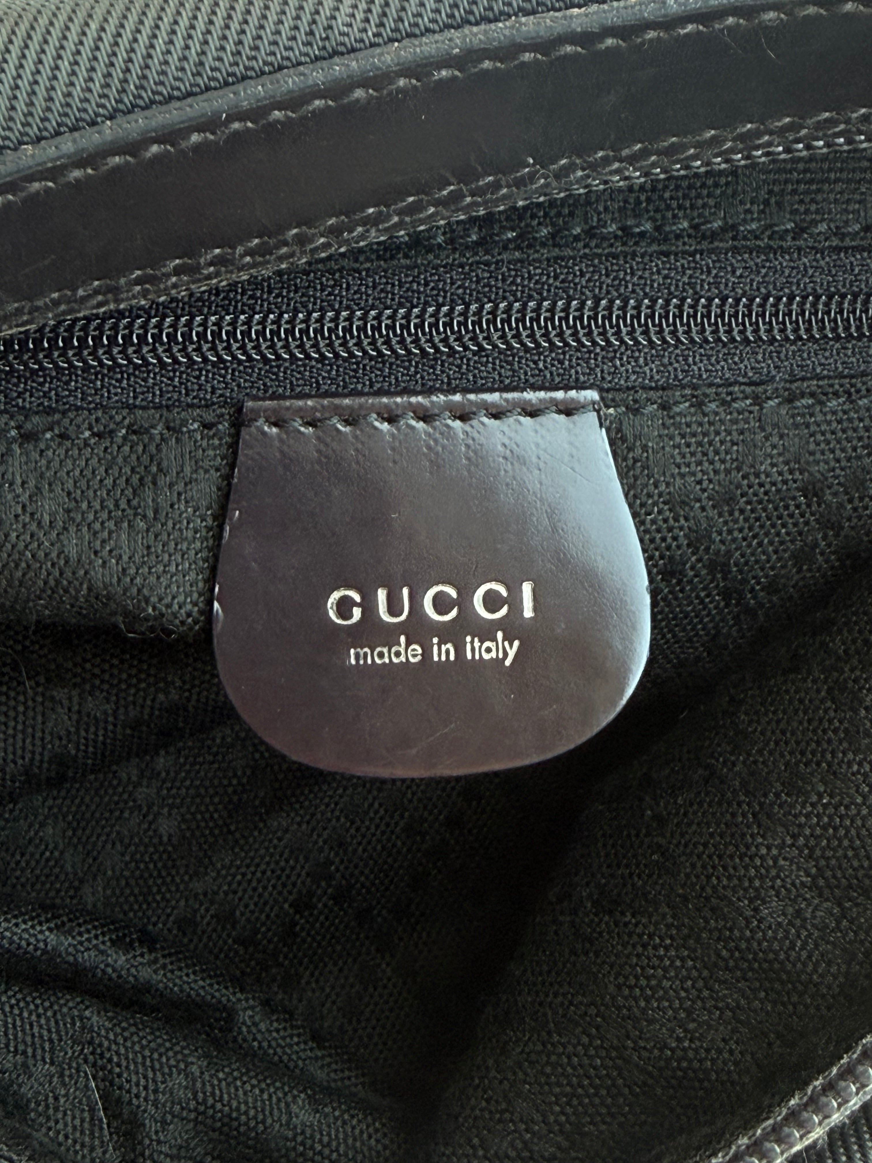 Vintage Gucci bamboo shoulder bag in nylon with silver-tone hardware and the iconic bamboo handle.