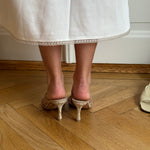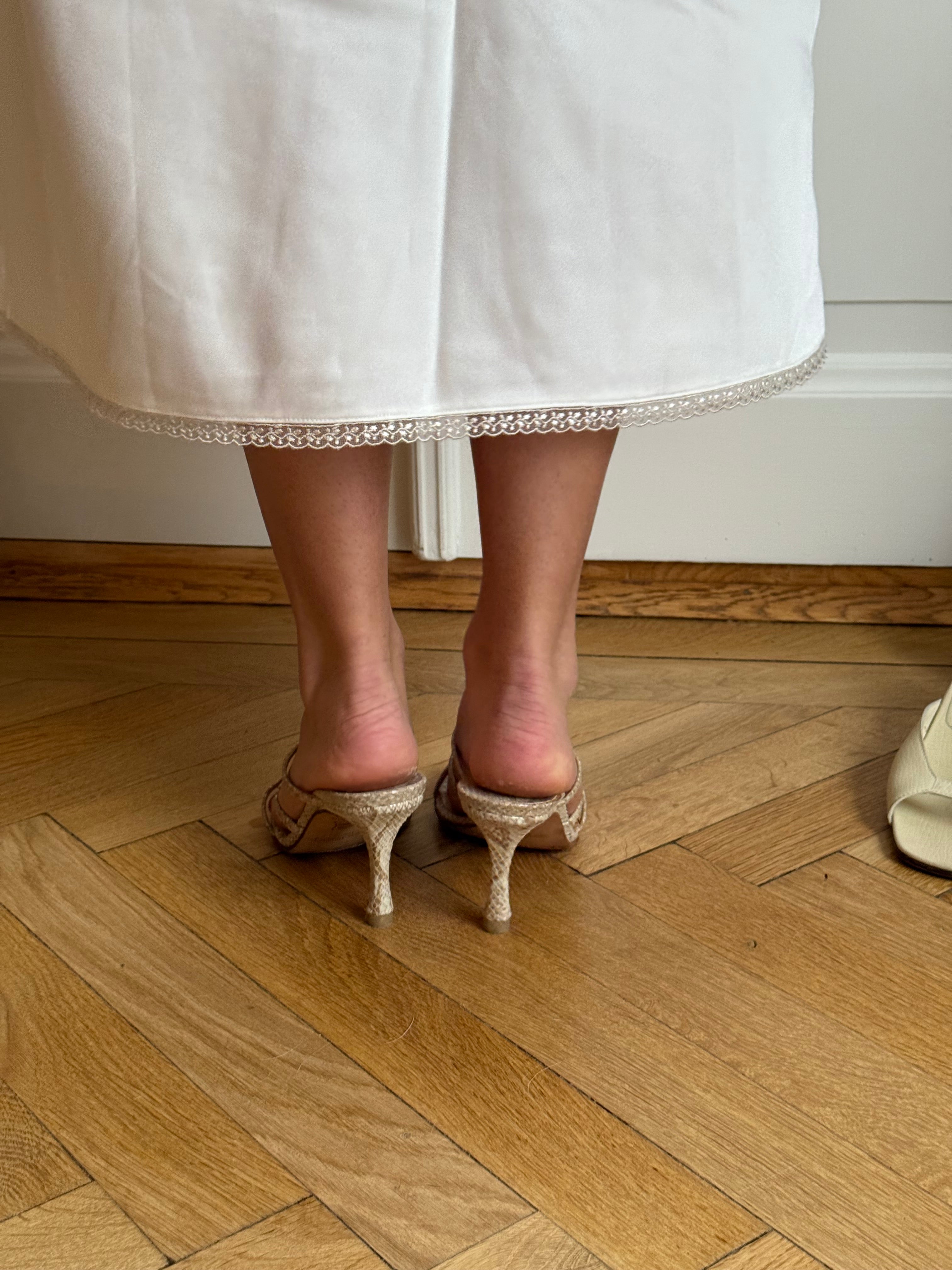 Beautiful Jimmy Choo heeled sandals in beige snakeskin leather with slim straps and an open silhouette.
