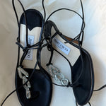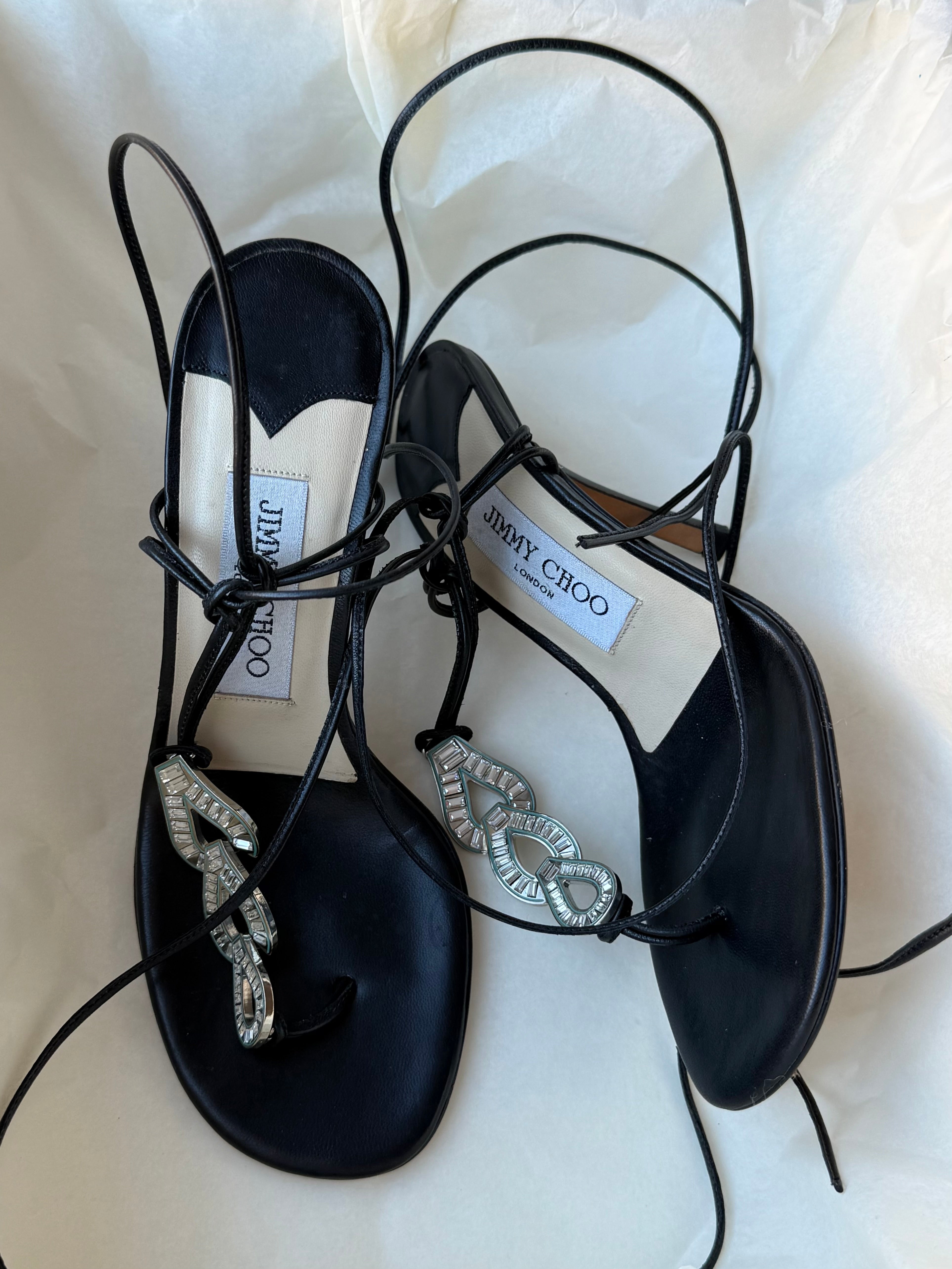 Sexy vintage Jimmy Choo black leather T-strap sandals with wrap-around ankle ties and interlocking crystal teardrop embellishments. From the early 2000s.
