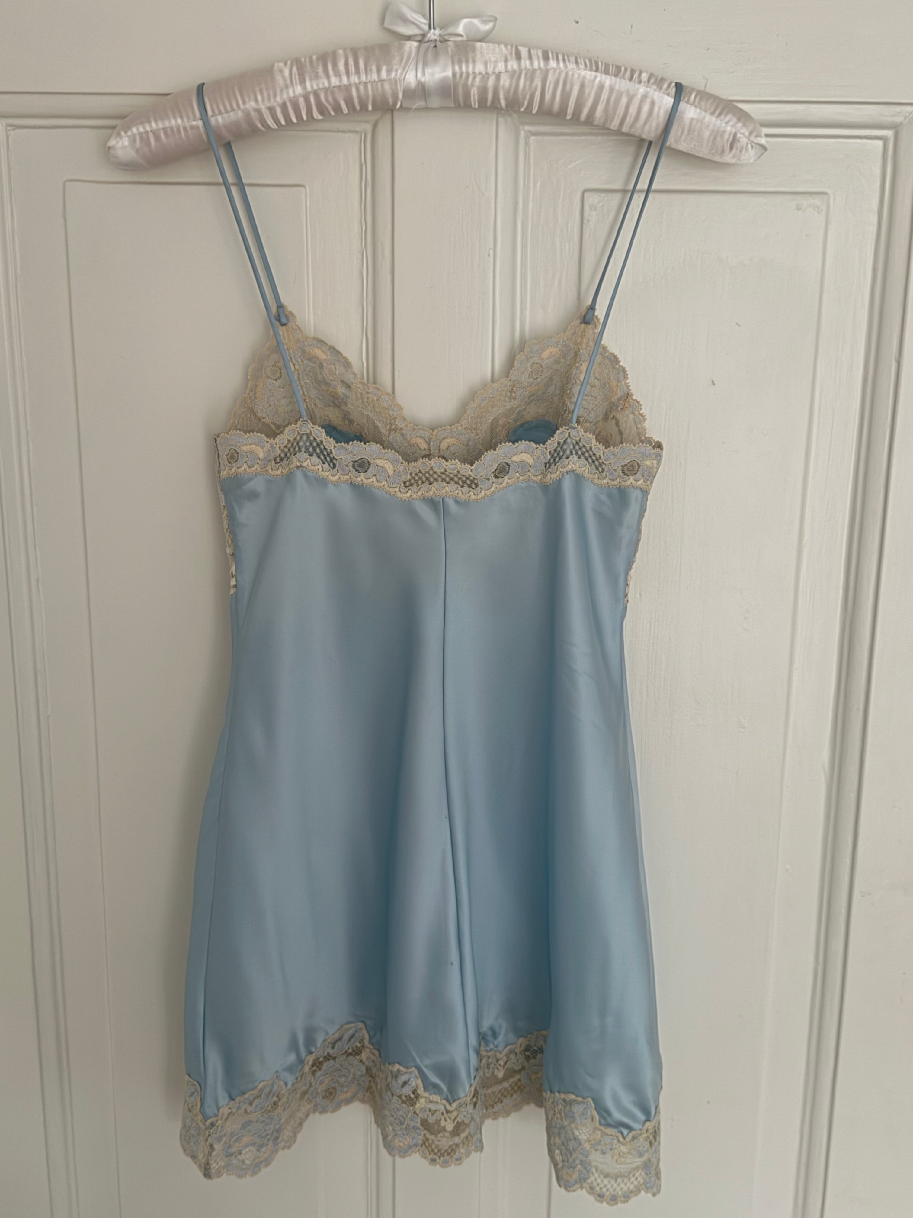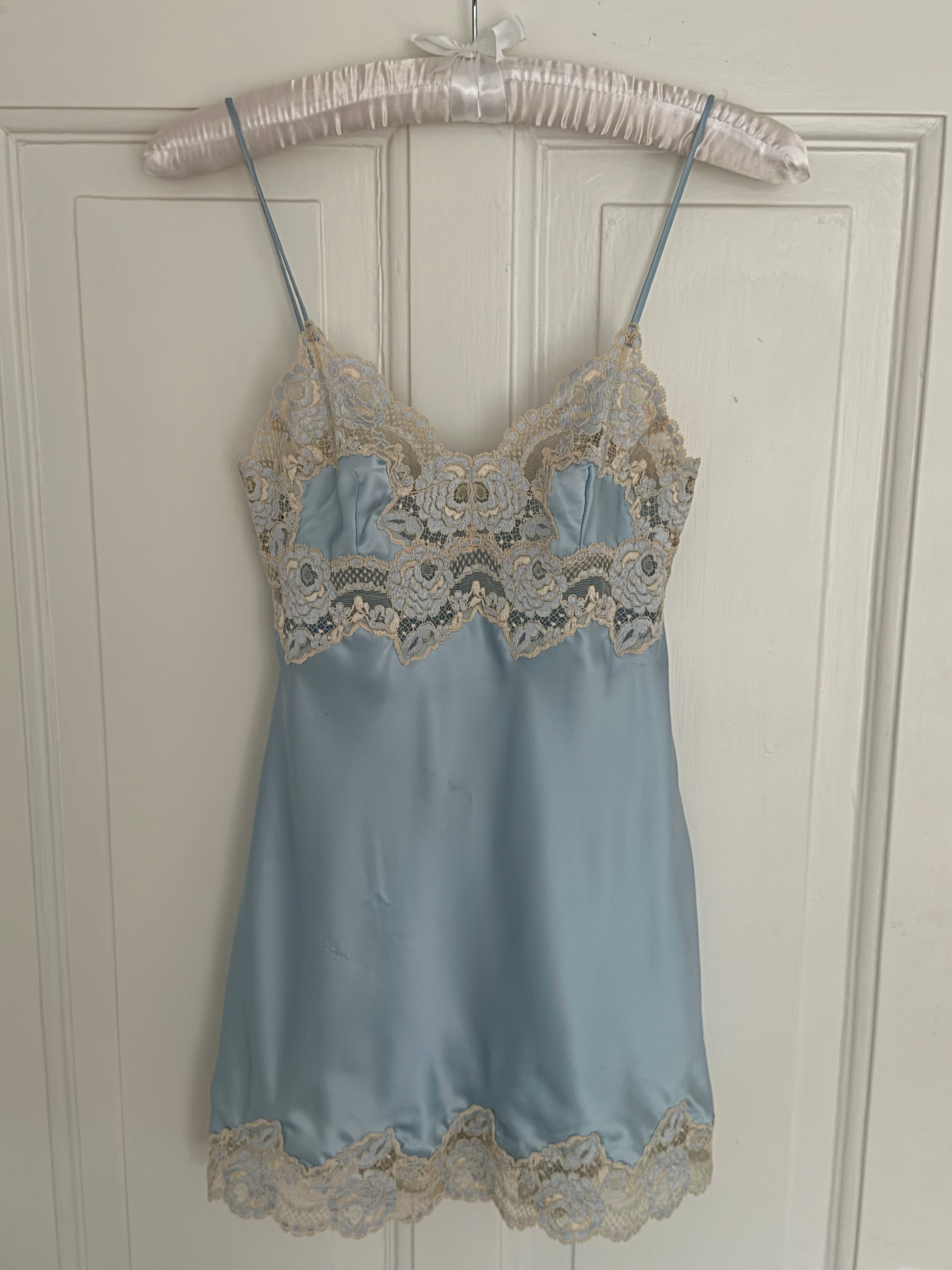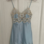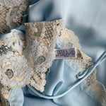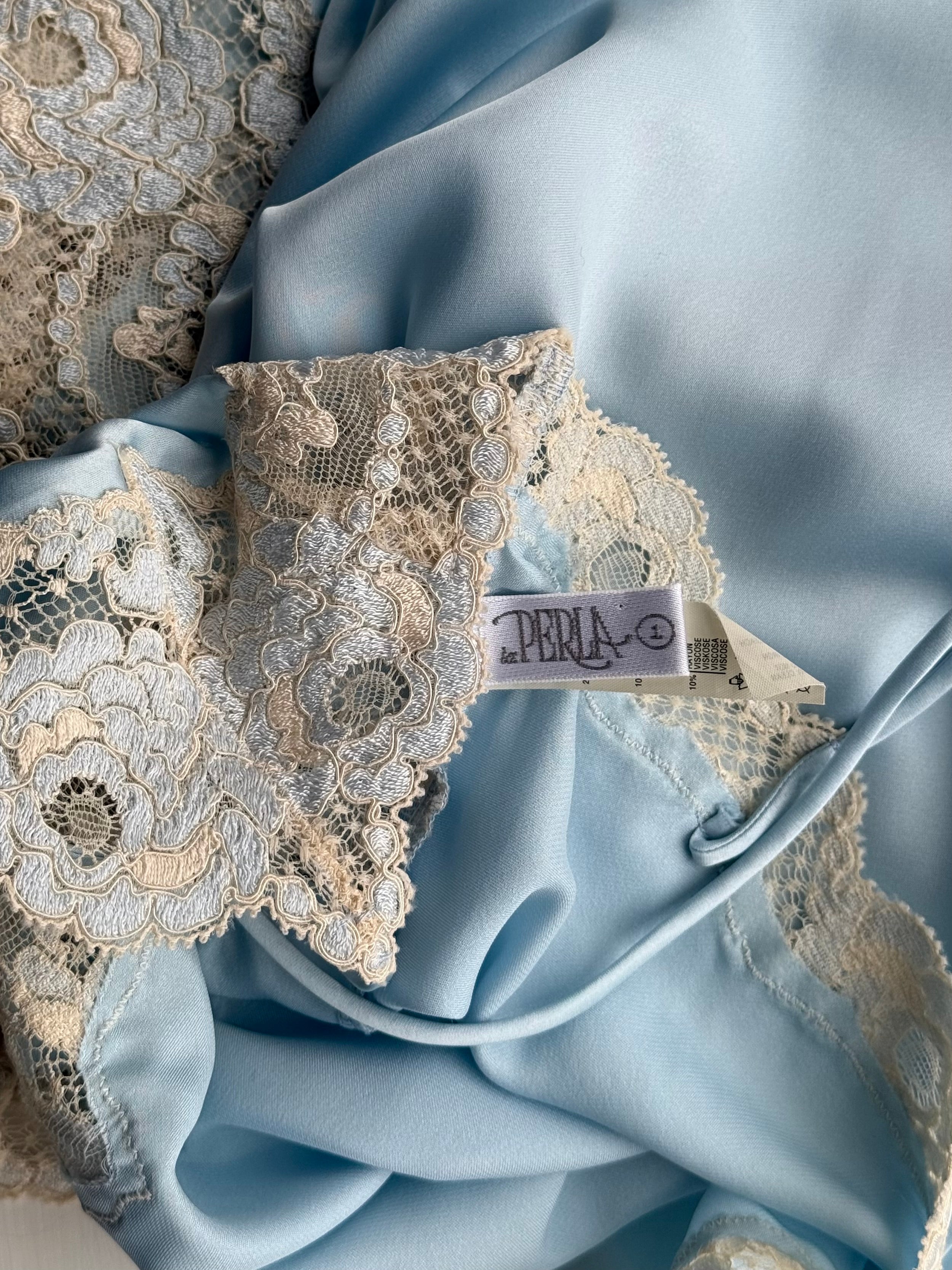 Beautiful vintage La Perla short slip dress in a soft light blue color with delicate floral lace detailing.