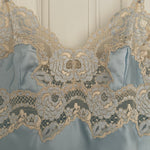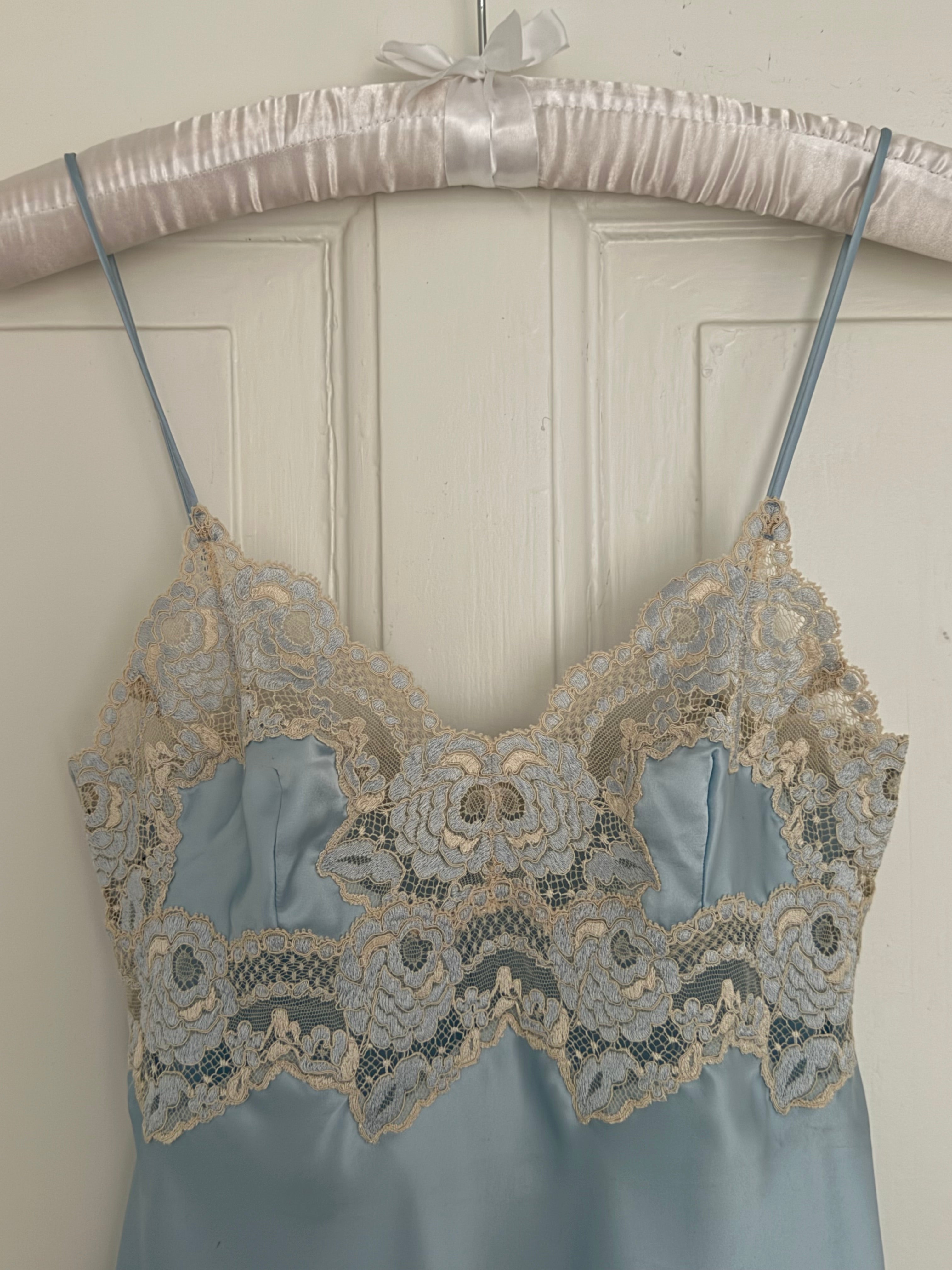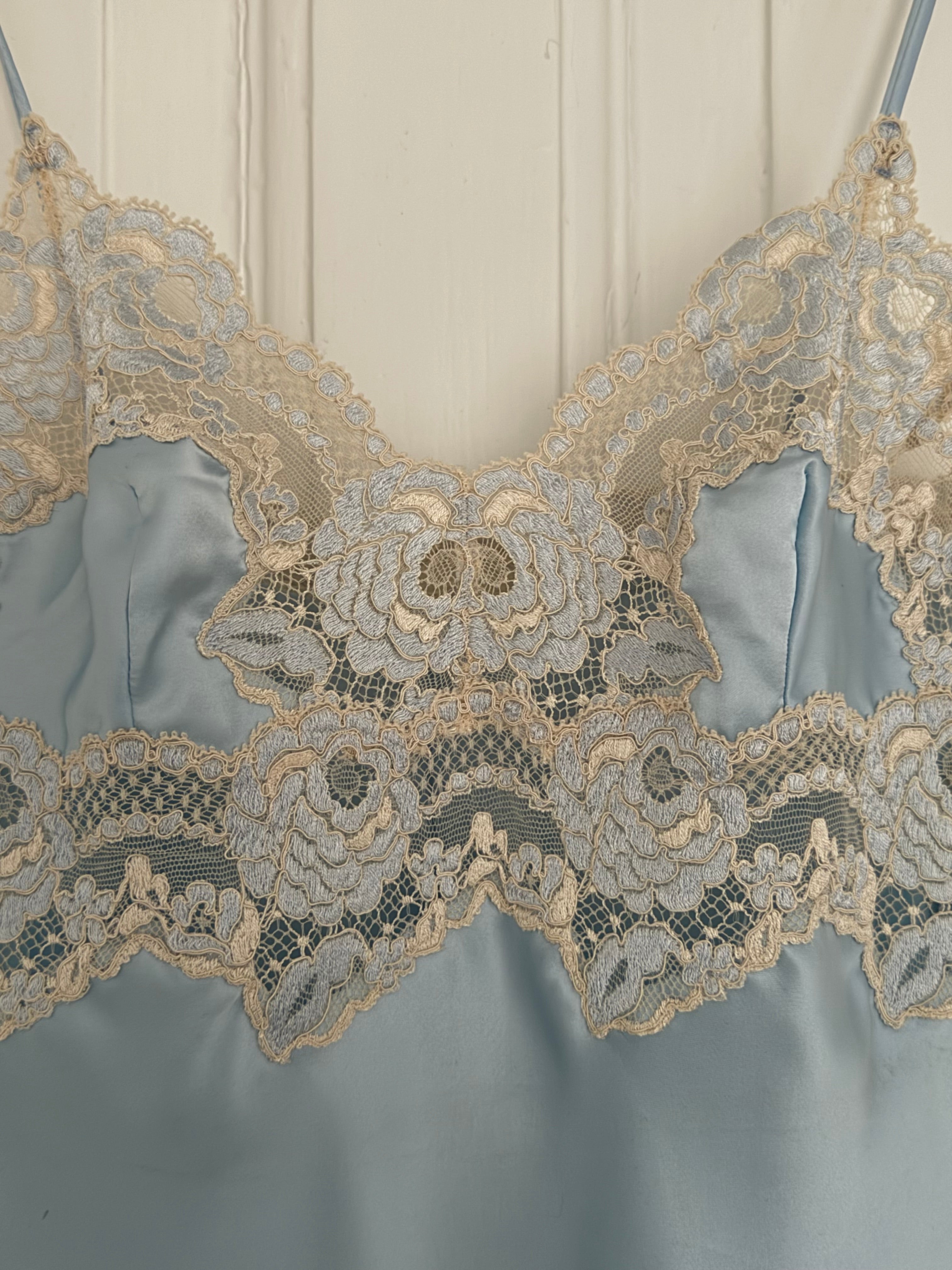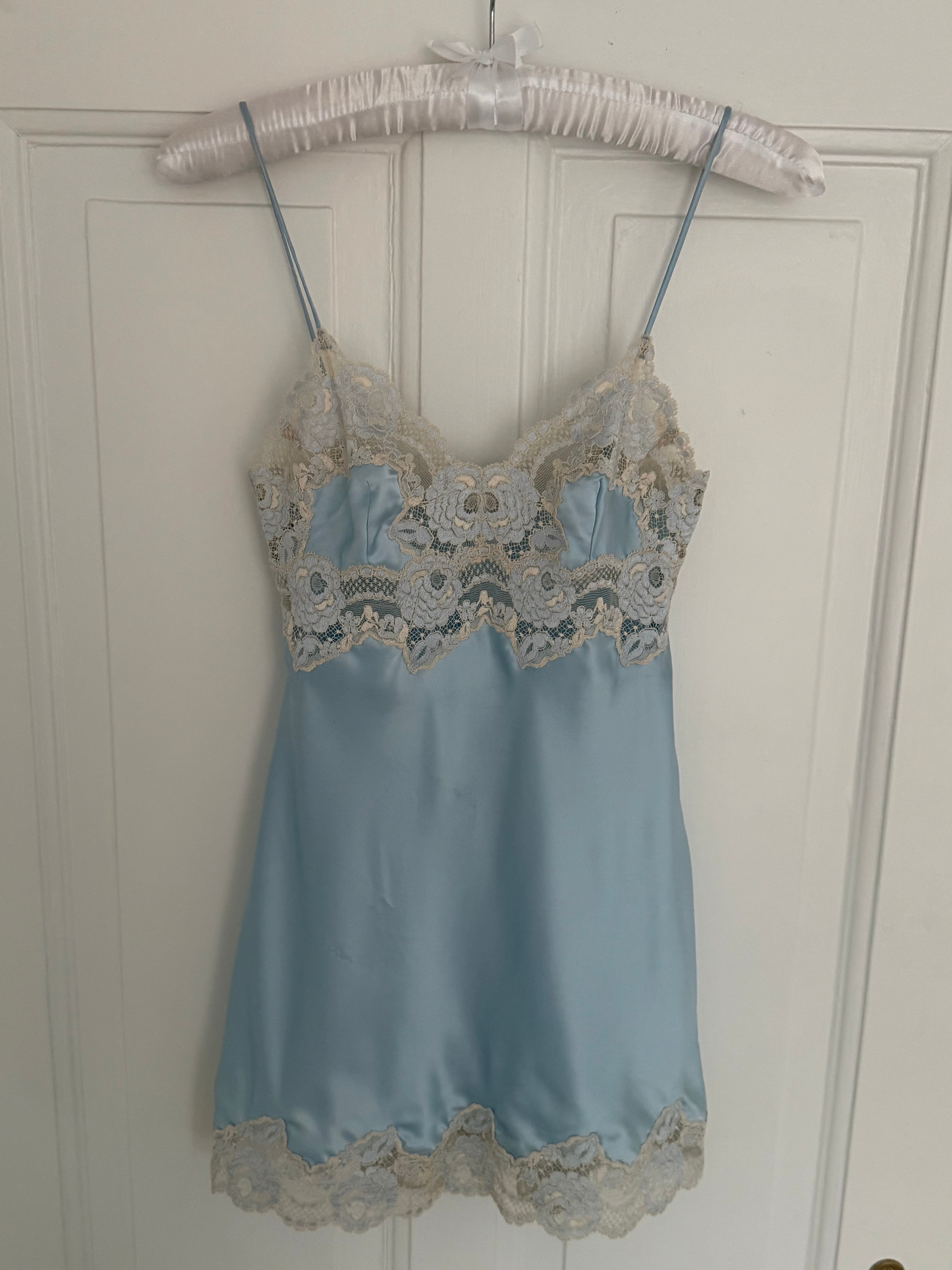 Beautiful vintage La Perla short slip dress in a soft light blue color with delicate floral lace detailing.