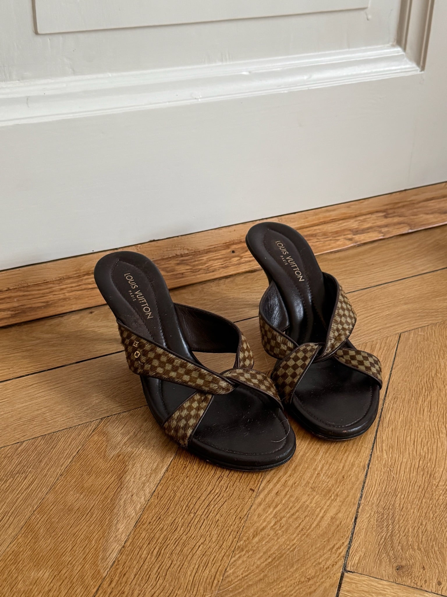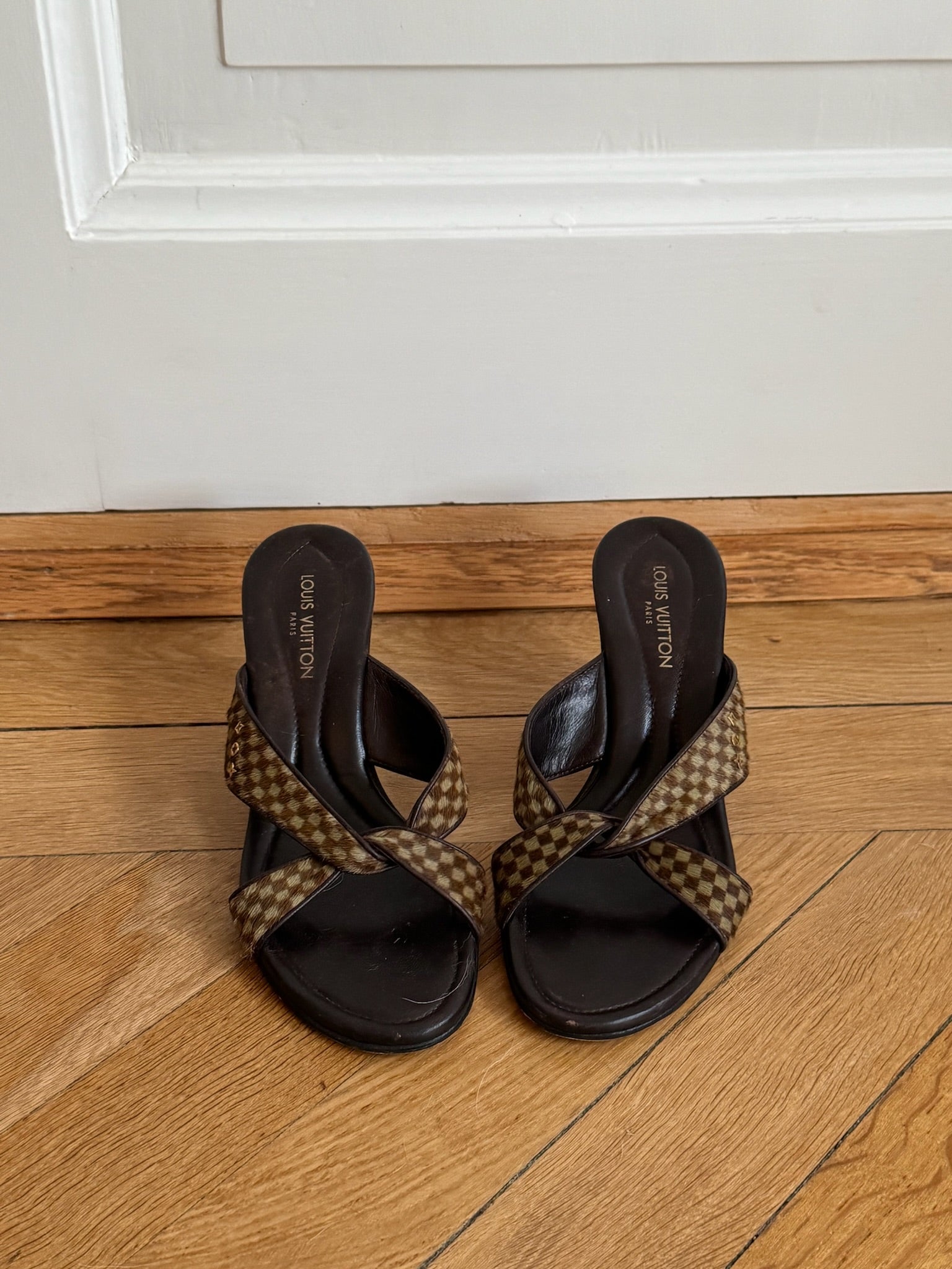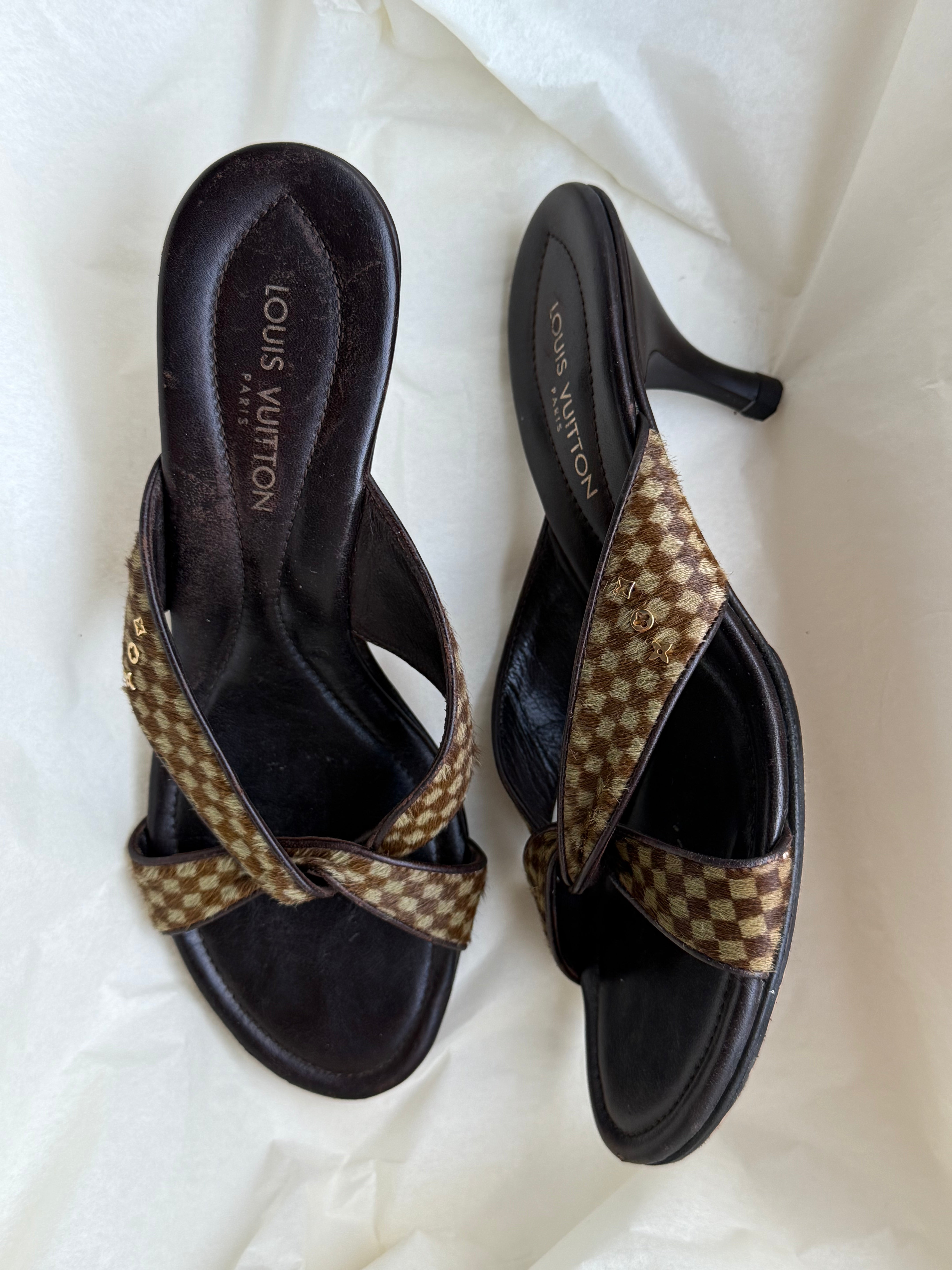 Beautiful vintage Louis Vuitton mules in pony hair checkered pattern.