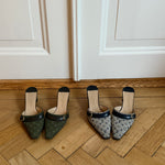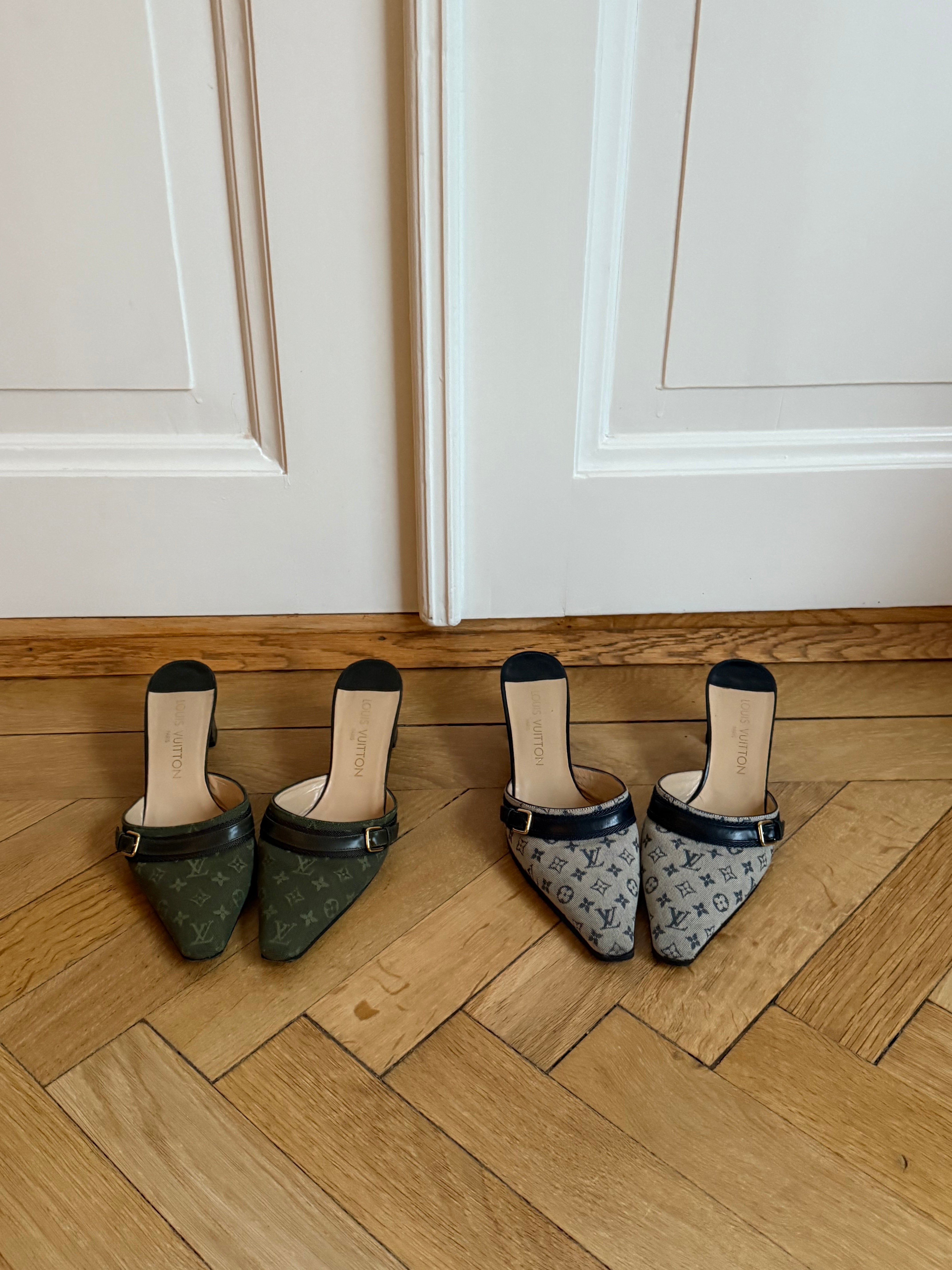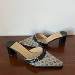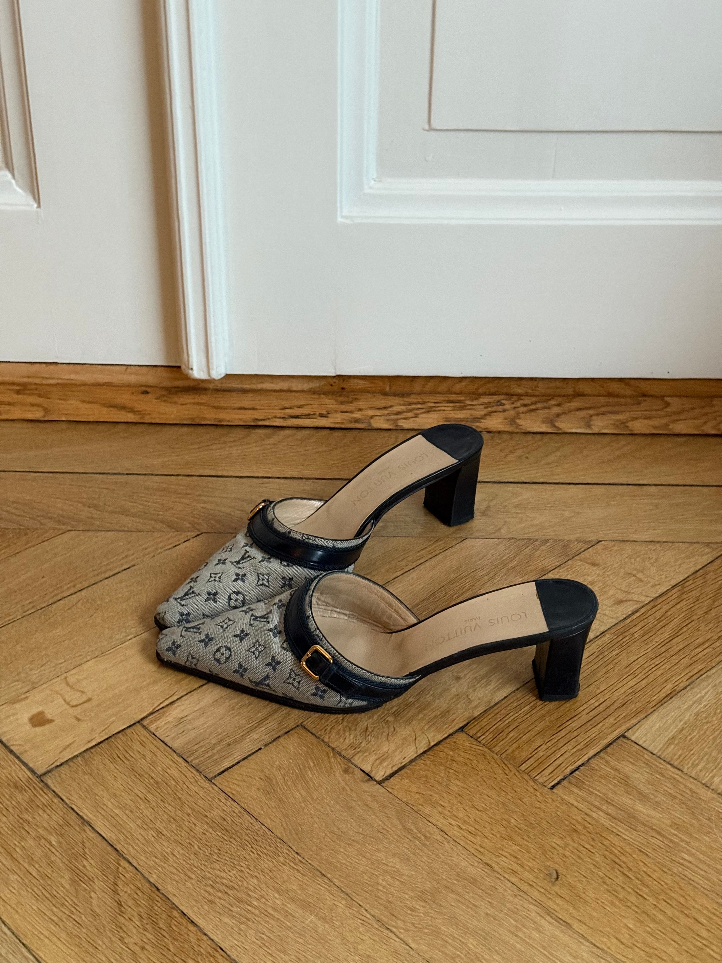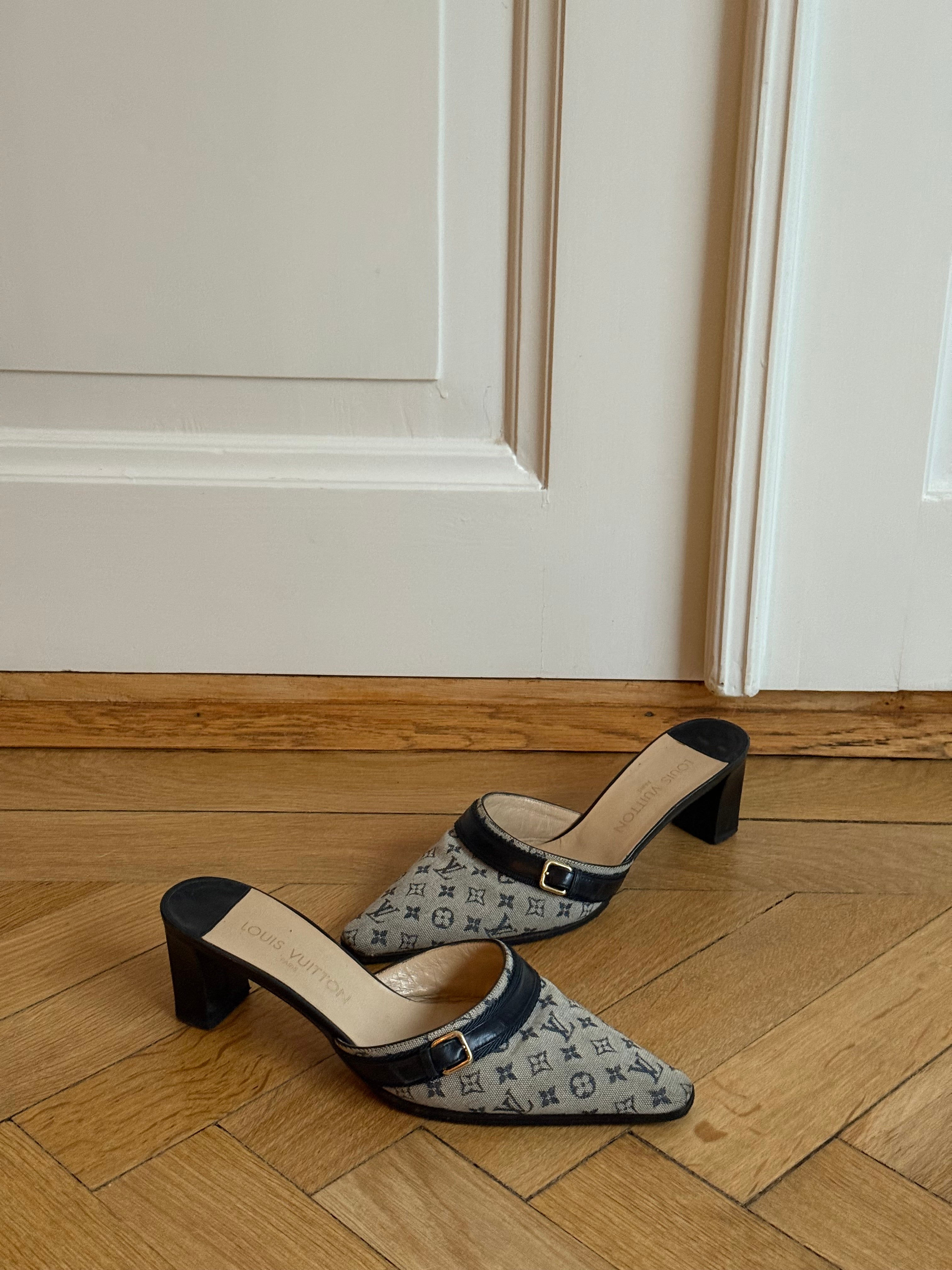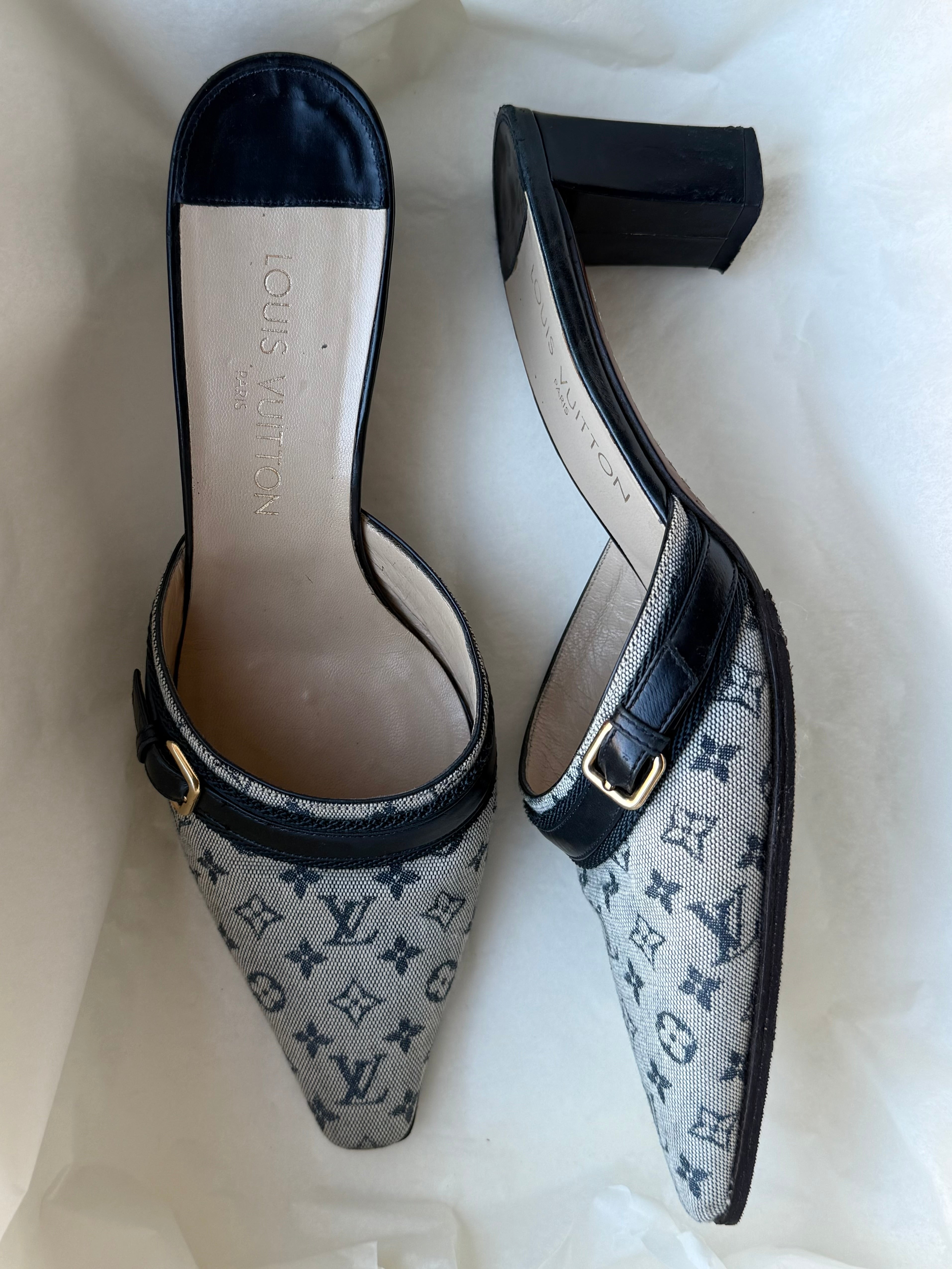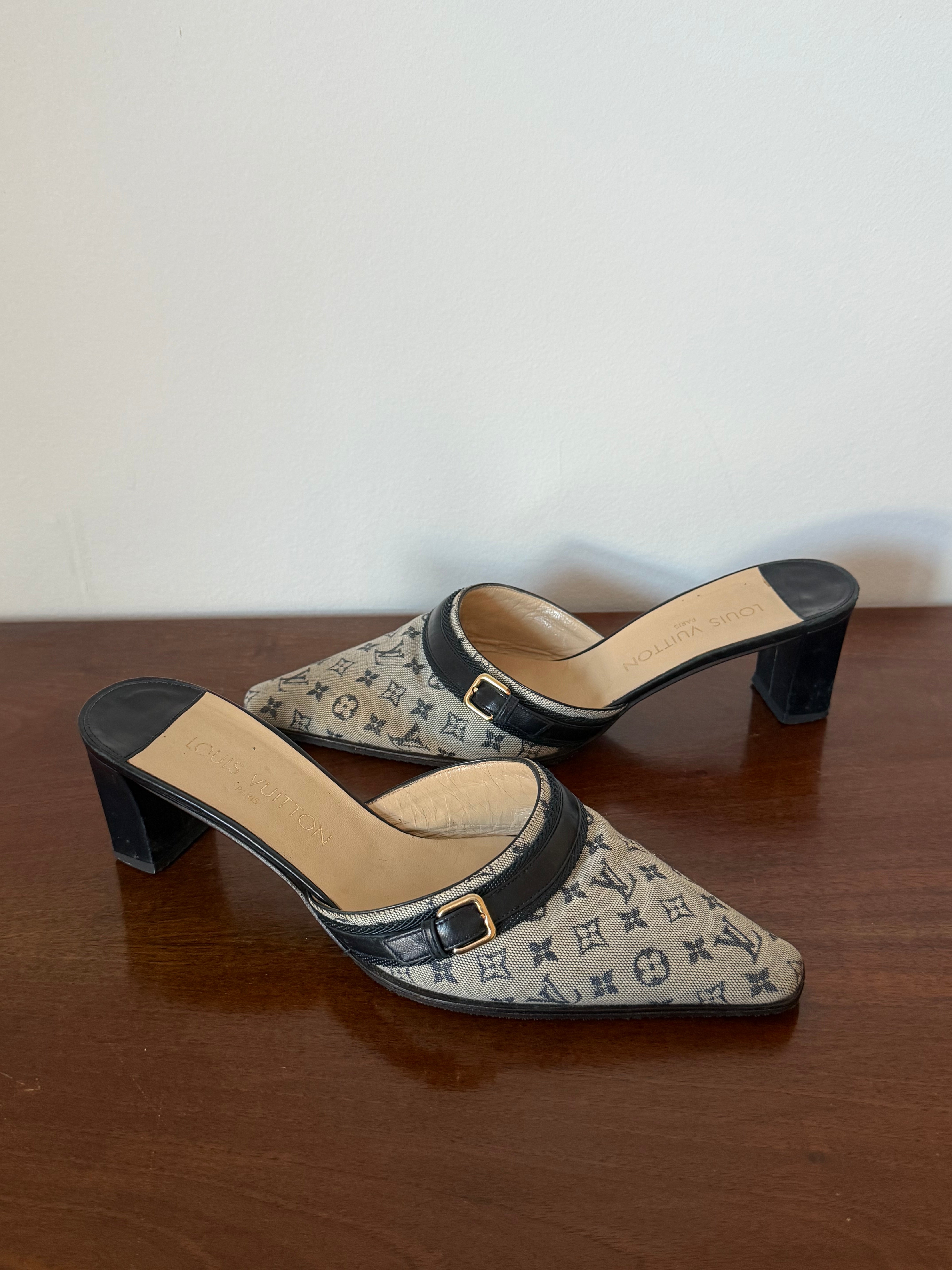 Rare Louis Vuitton mules with a pointed toe in signature monogram canvas, finished with black leather trim and a gold buckle detail.