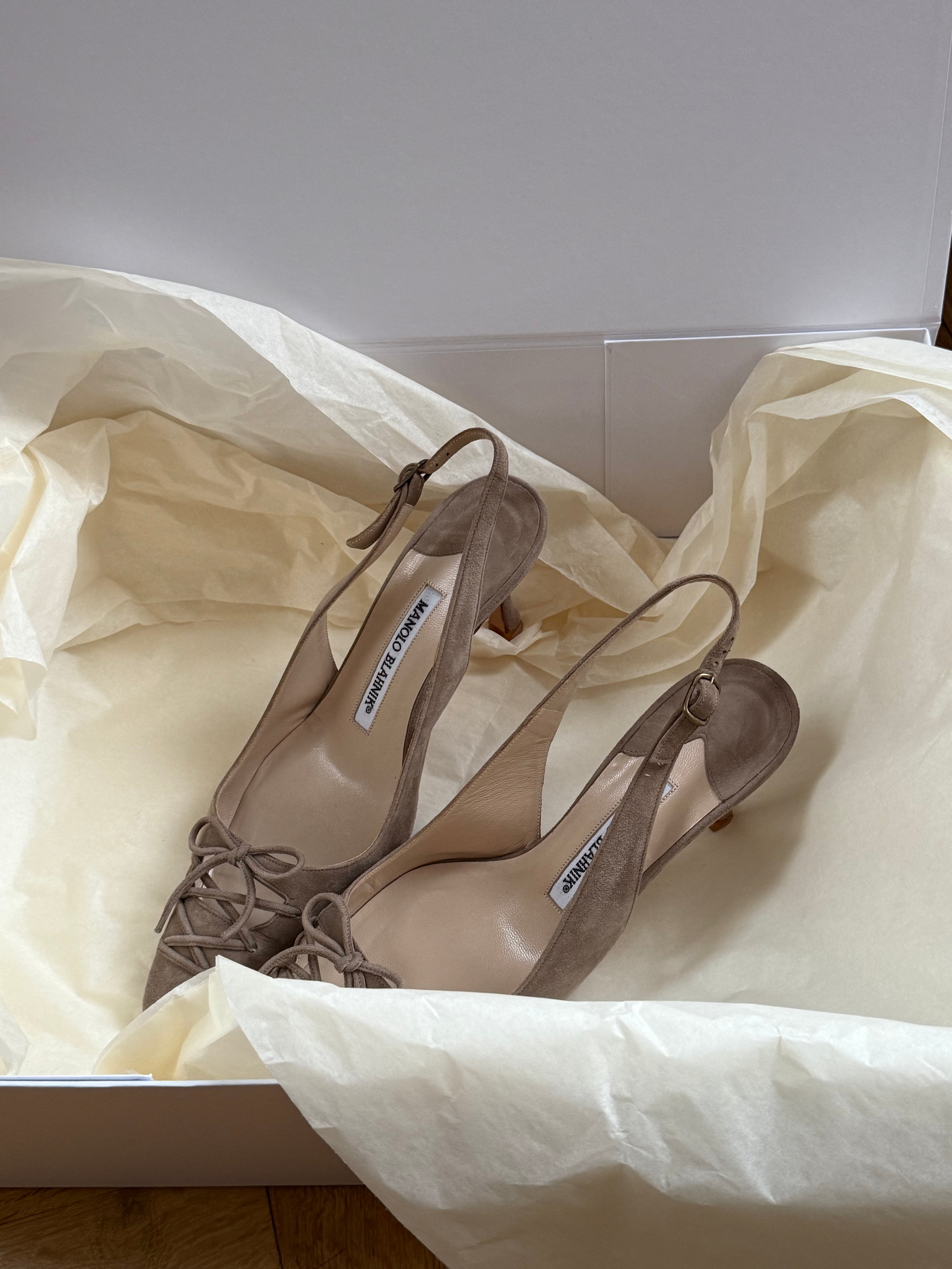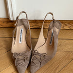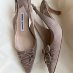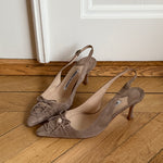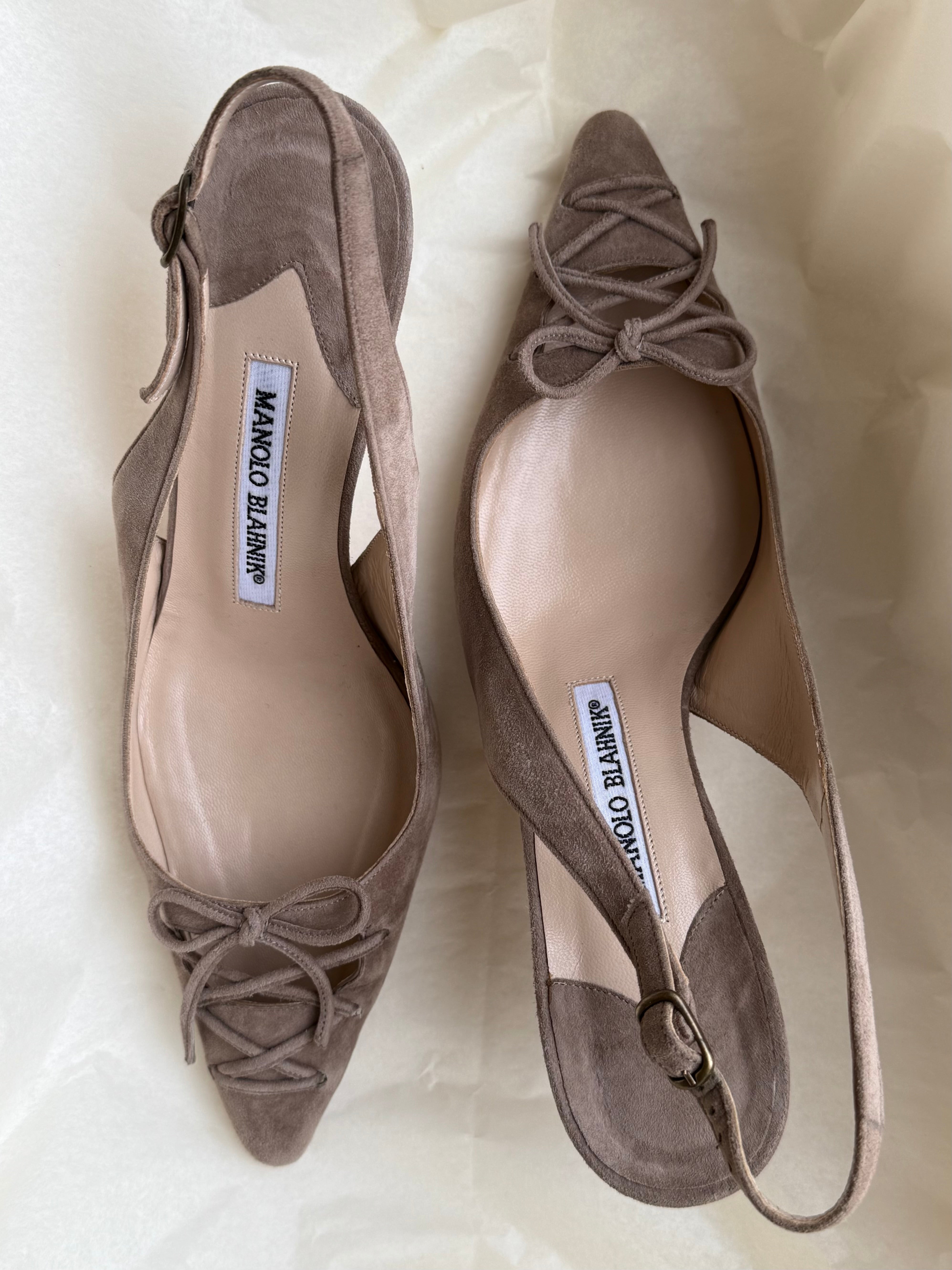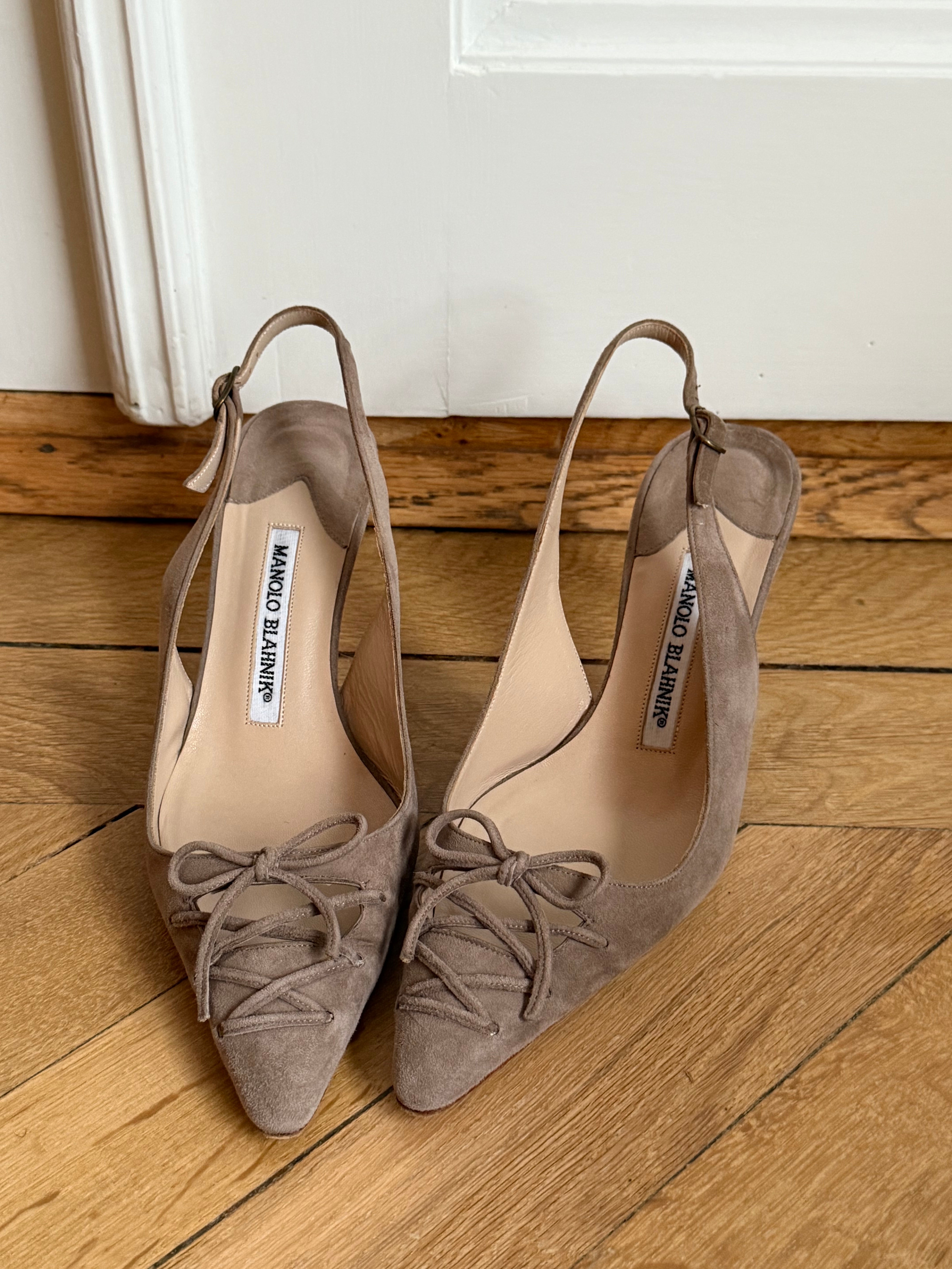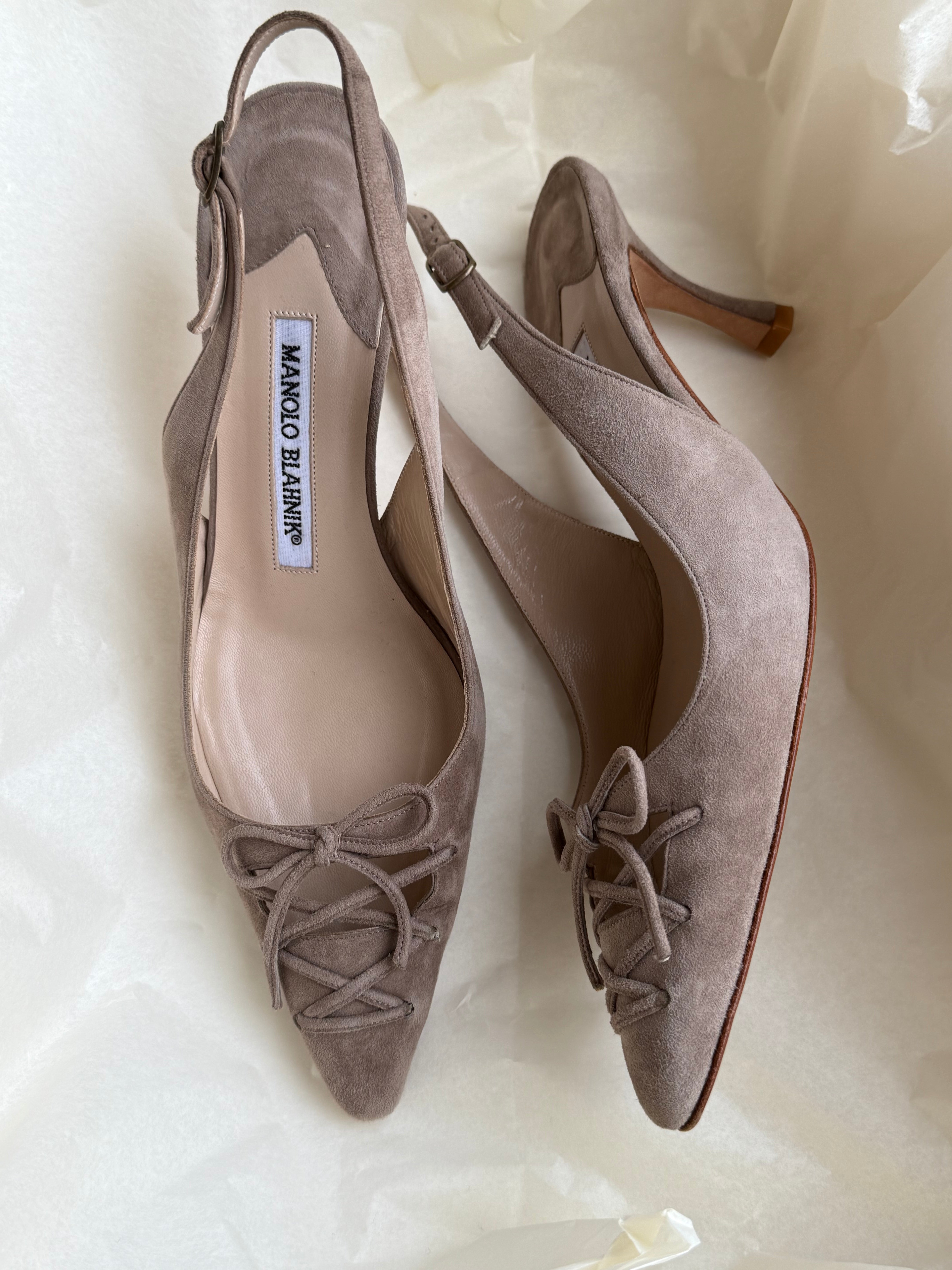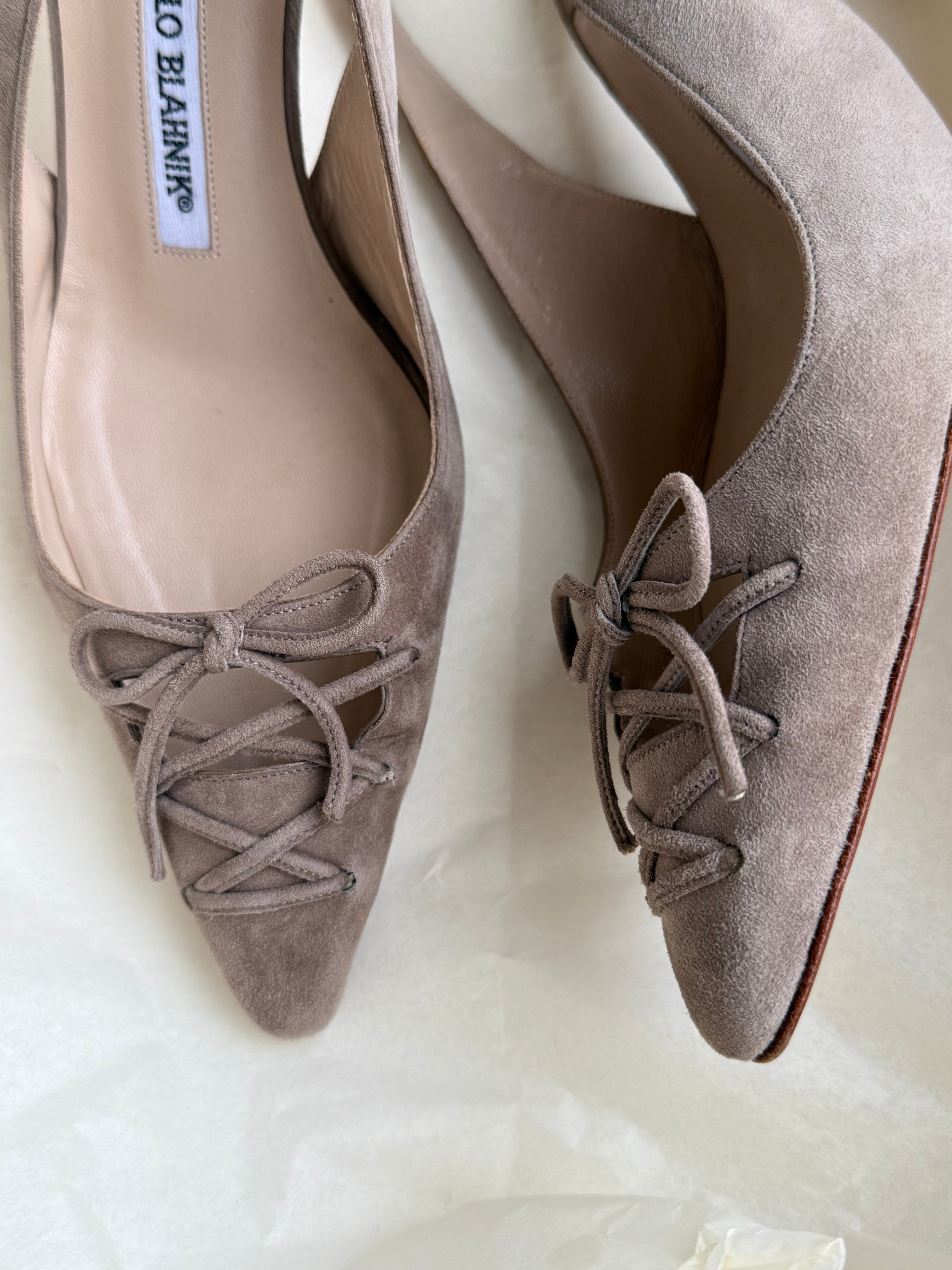 Vintage Manolo Blahnik ‘Roxie’ suede slingback pumps in a beautiful taupe color, featuring a pointed toe, front lace-up detail and an adjustable strap.