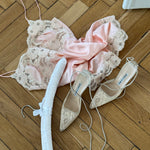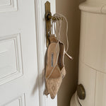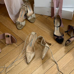 Beautiful vintage Manolo Blahnik lace heels with pointed toe and ankle tie detail.