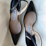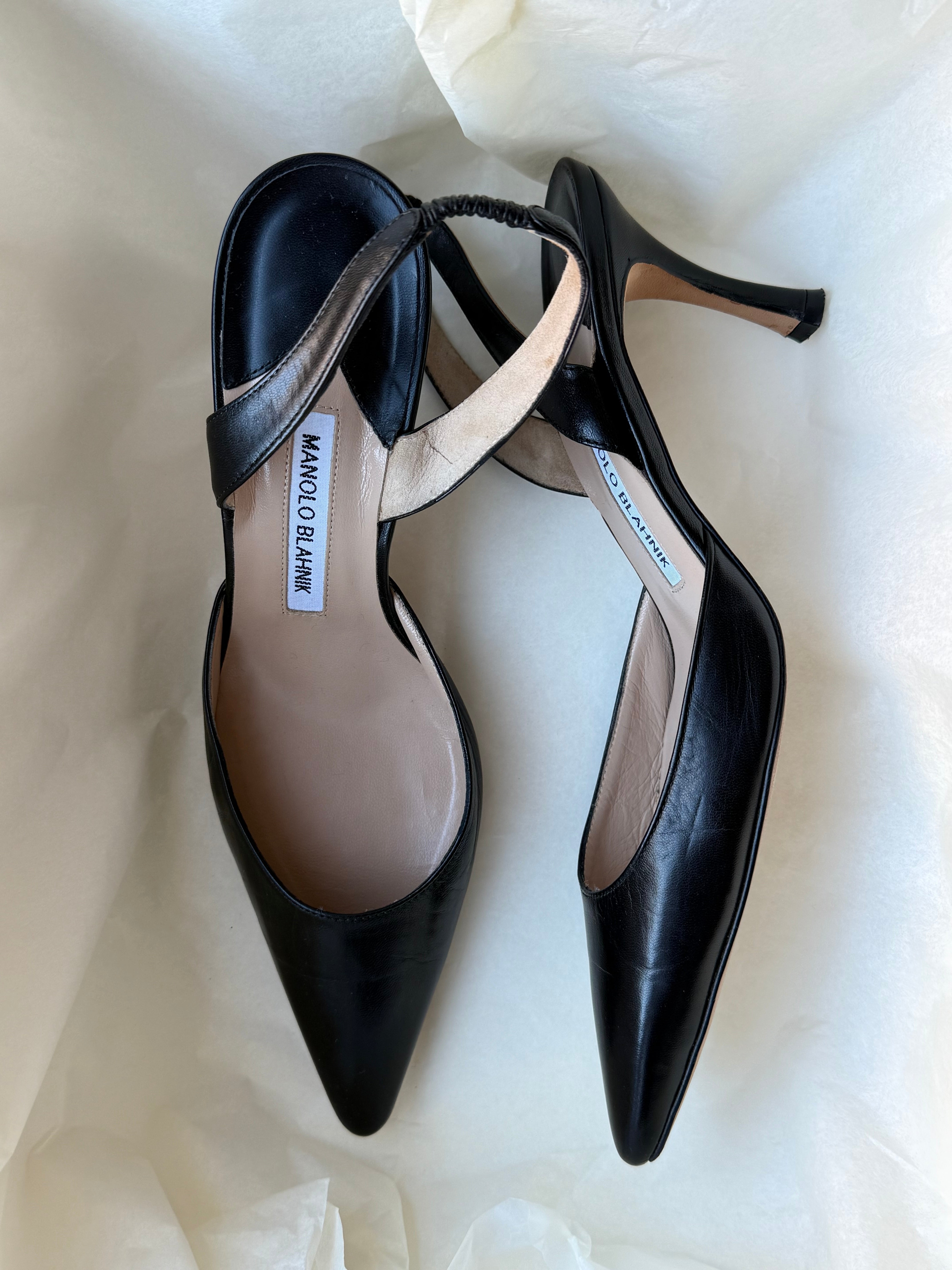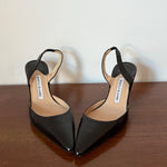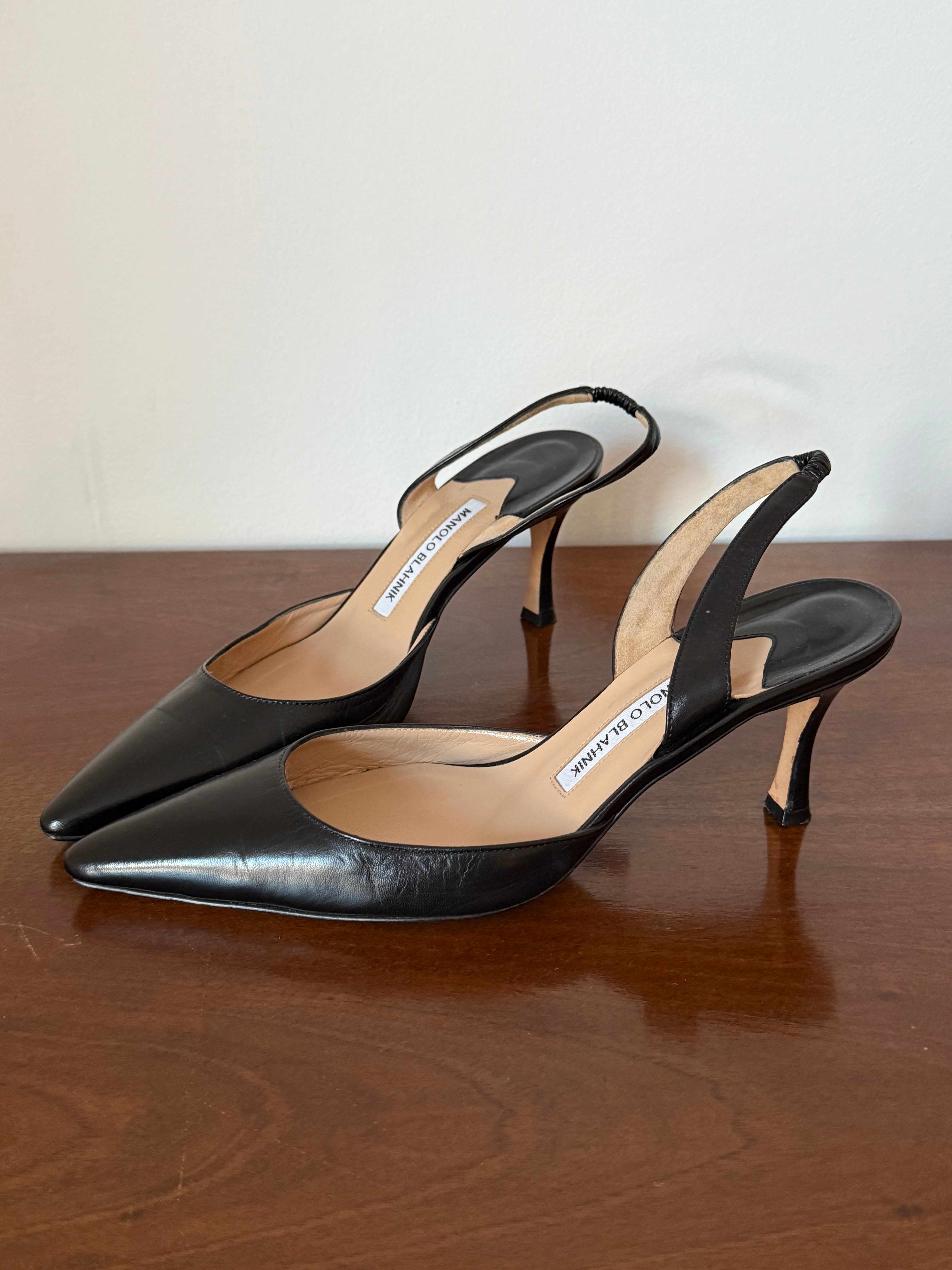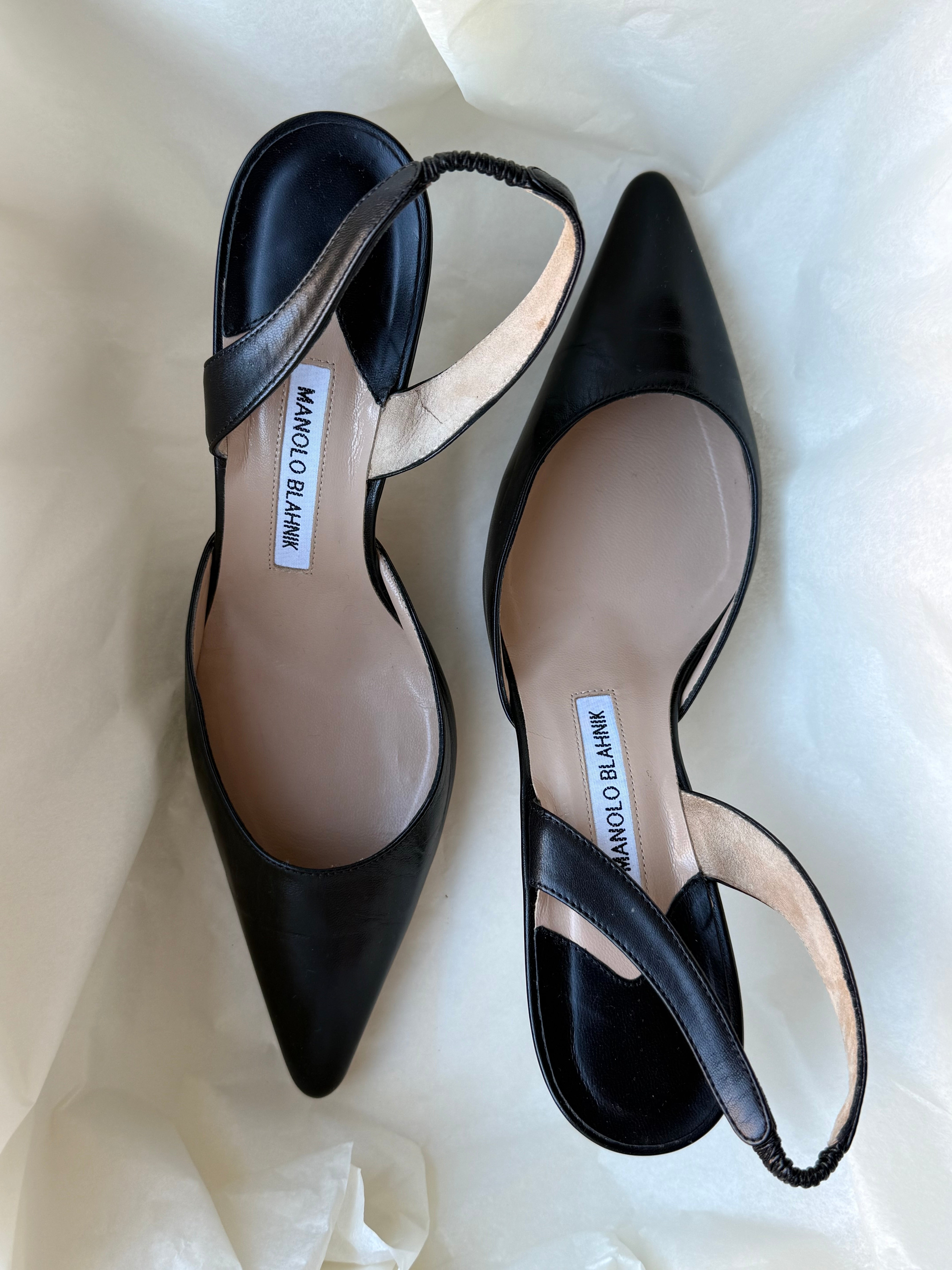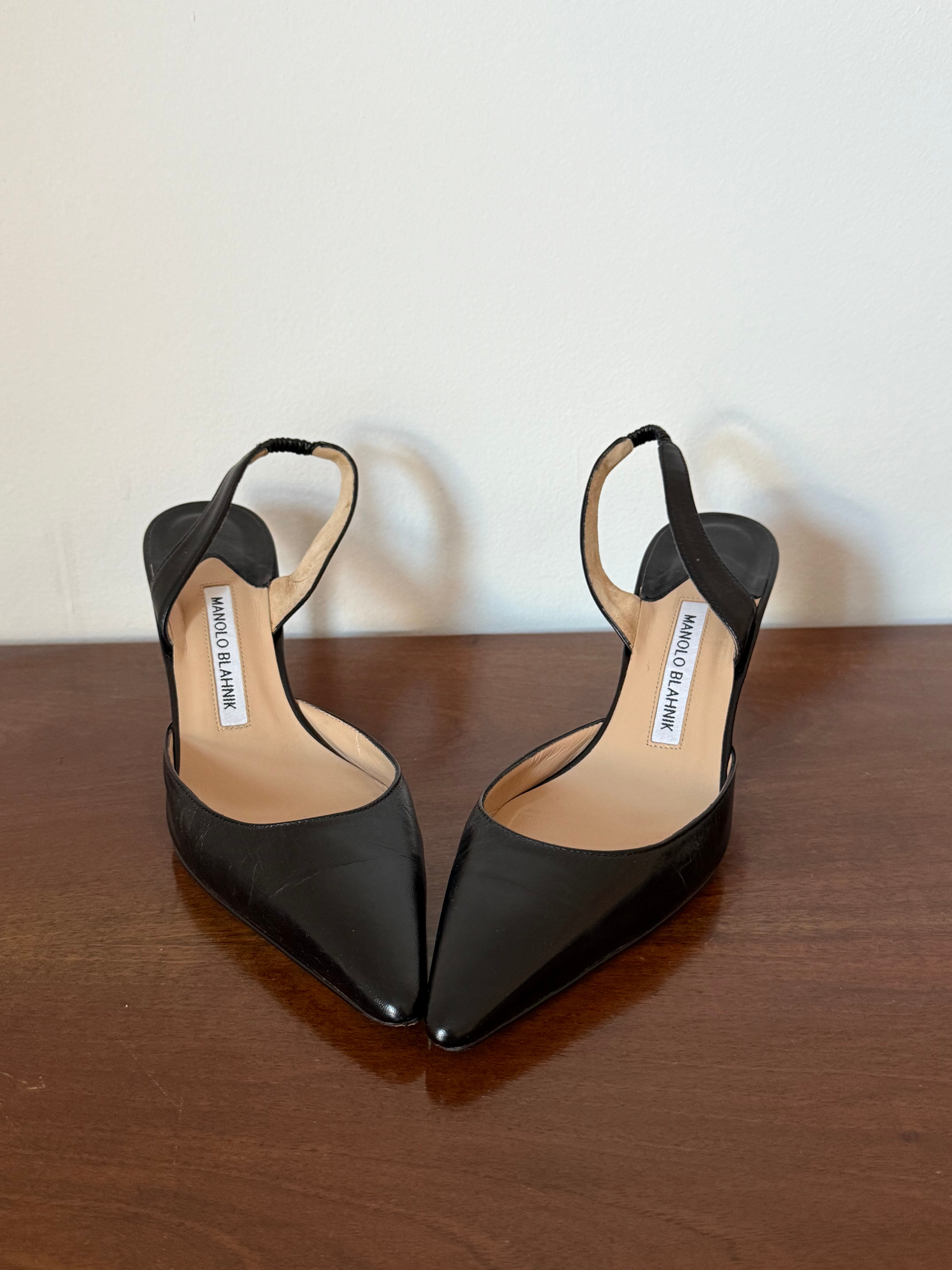 Iconic Manolo Blahnik ‘Carolyne’ pointed toe slingbacks in black leather.
