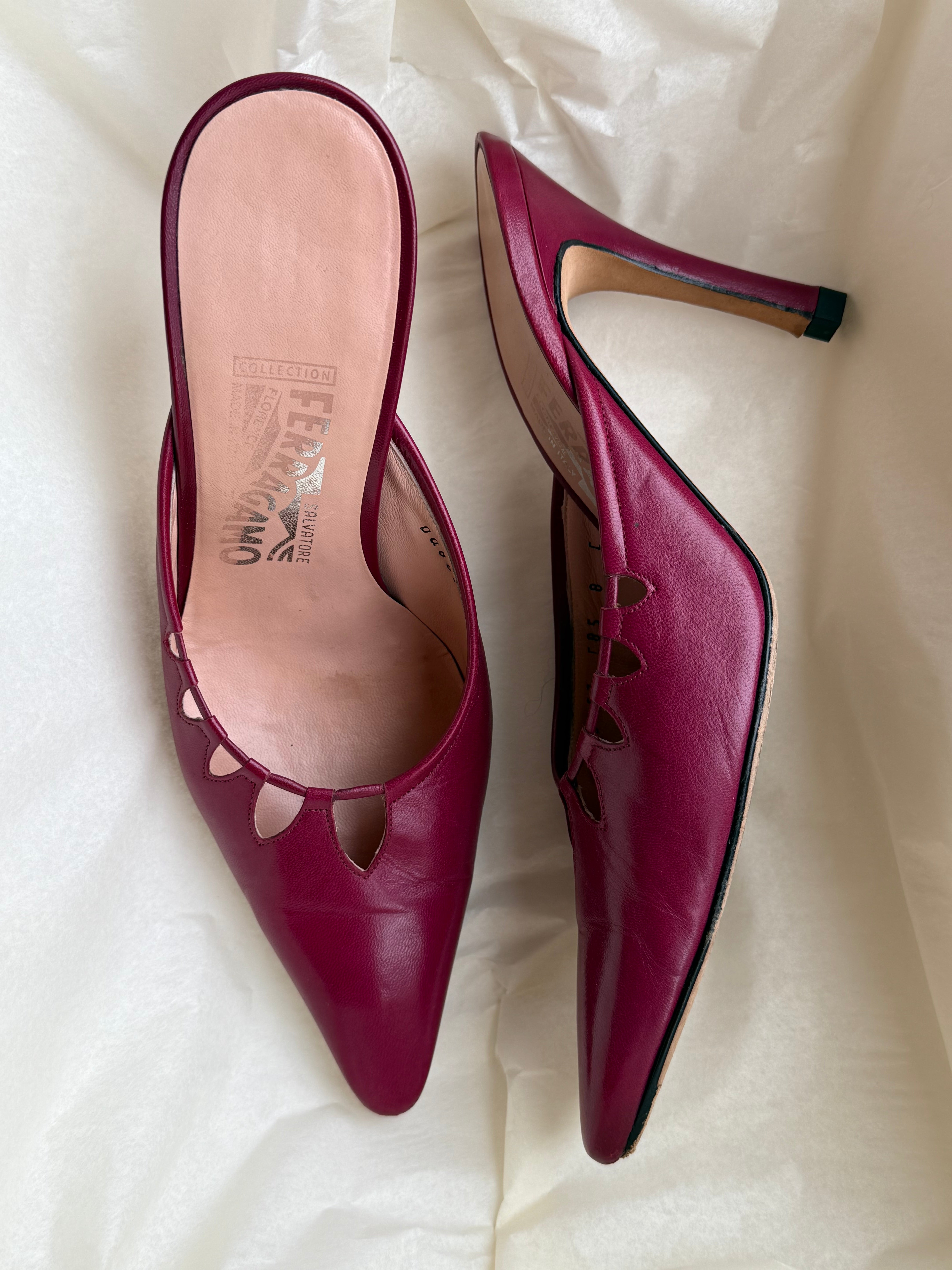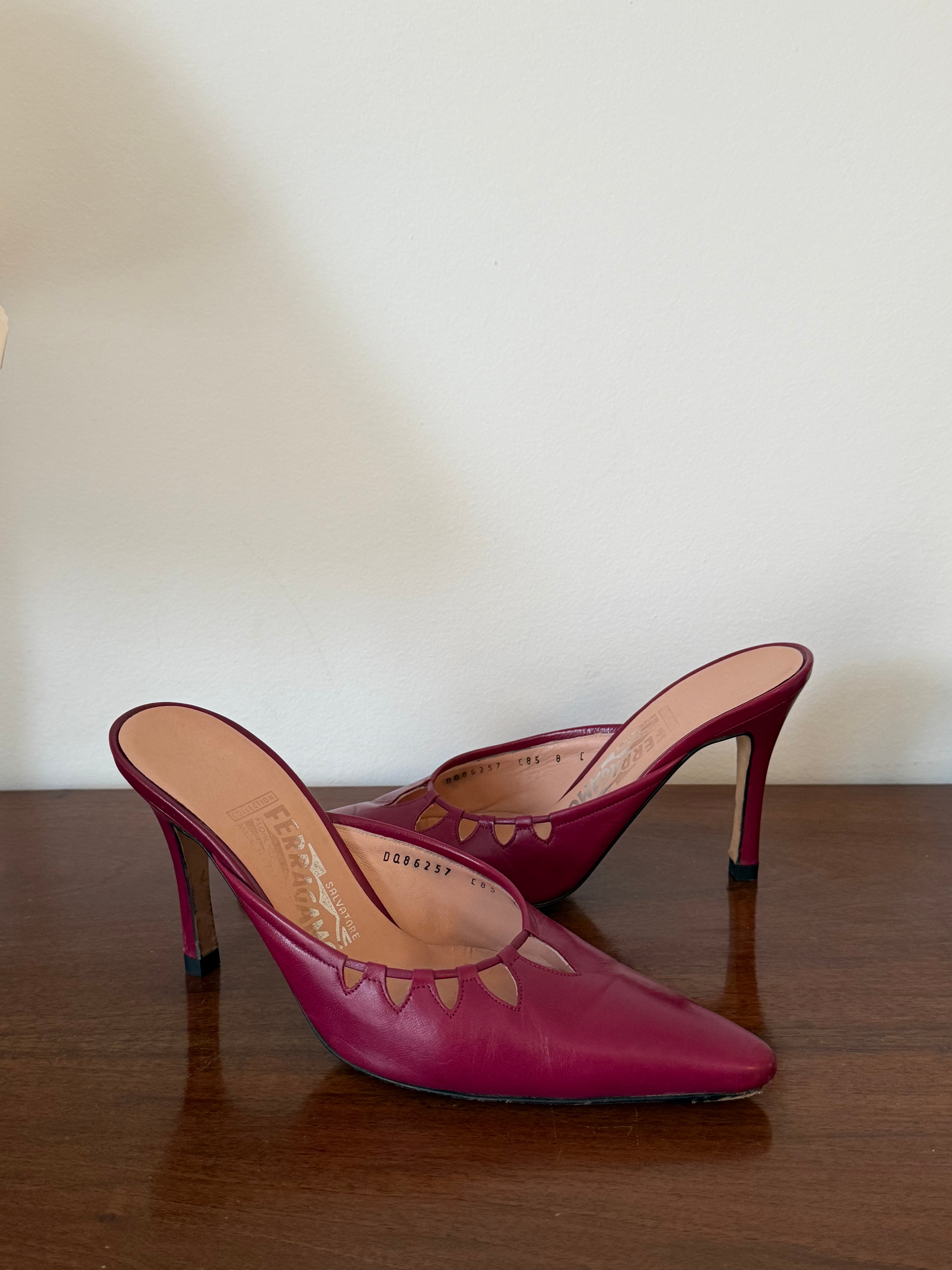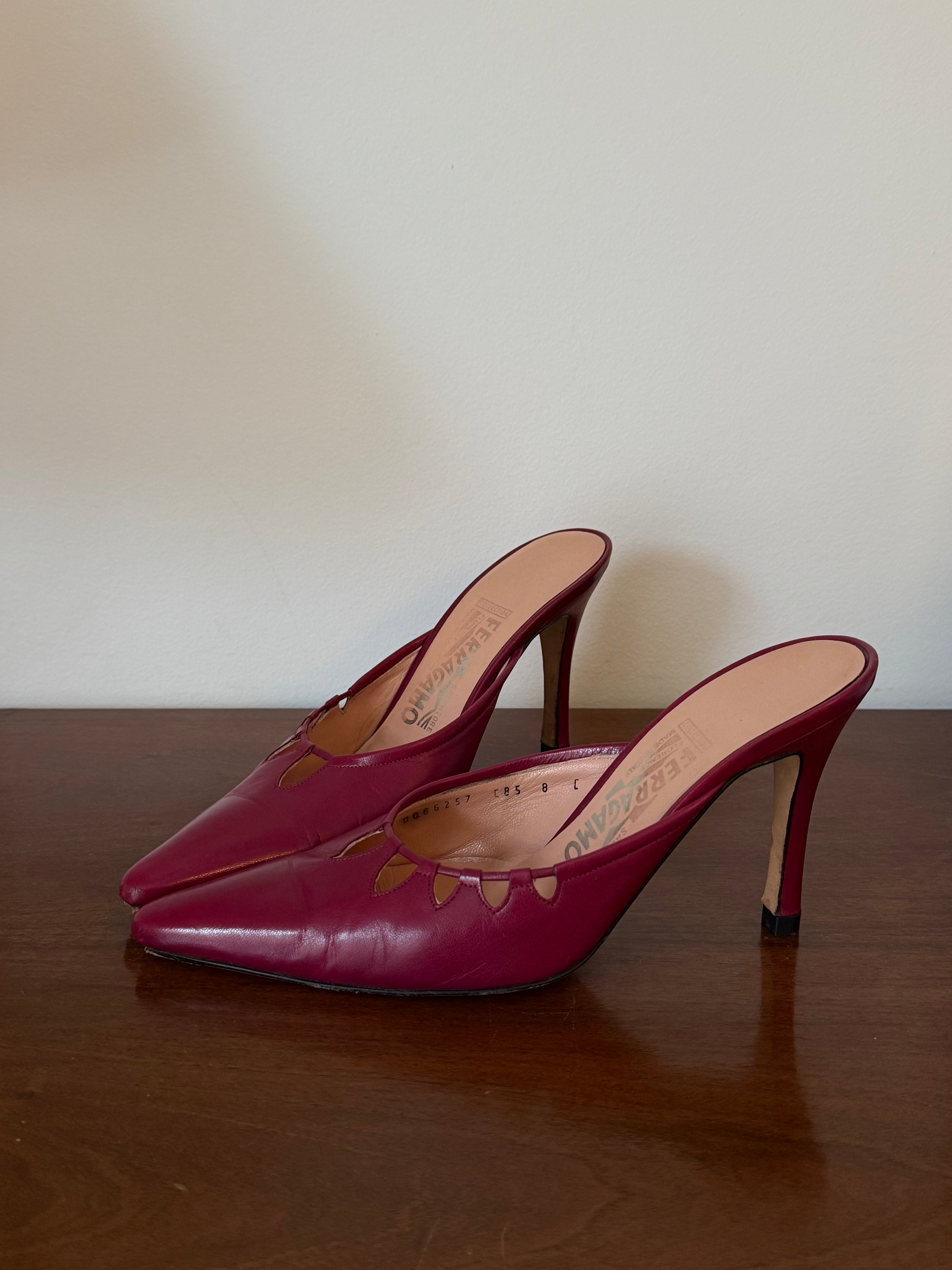 Vintage red leather Salvatore Ferragamo mules with a pointed toe and cut-out detailing.