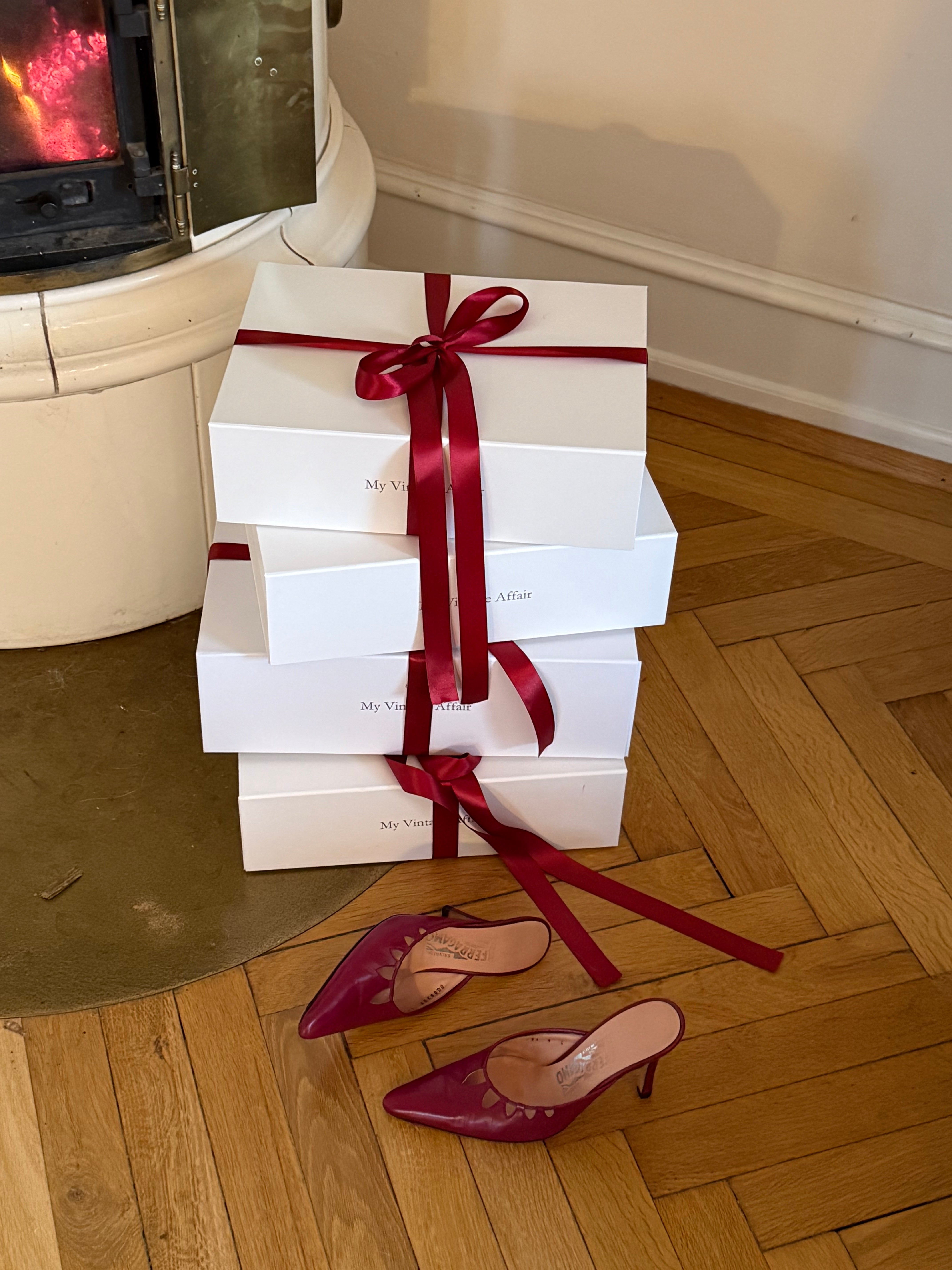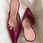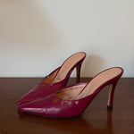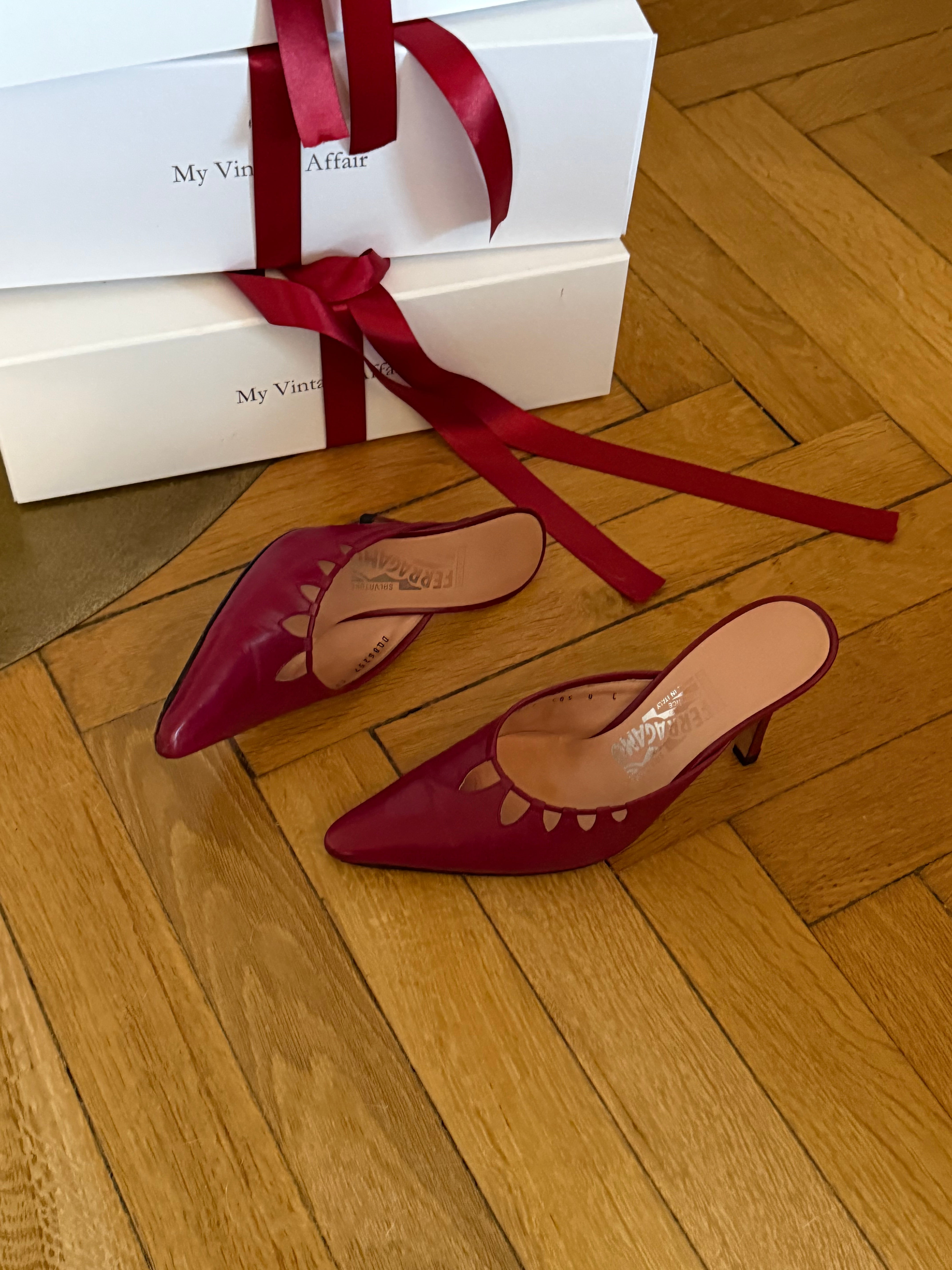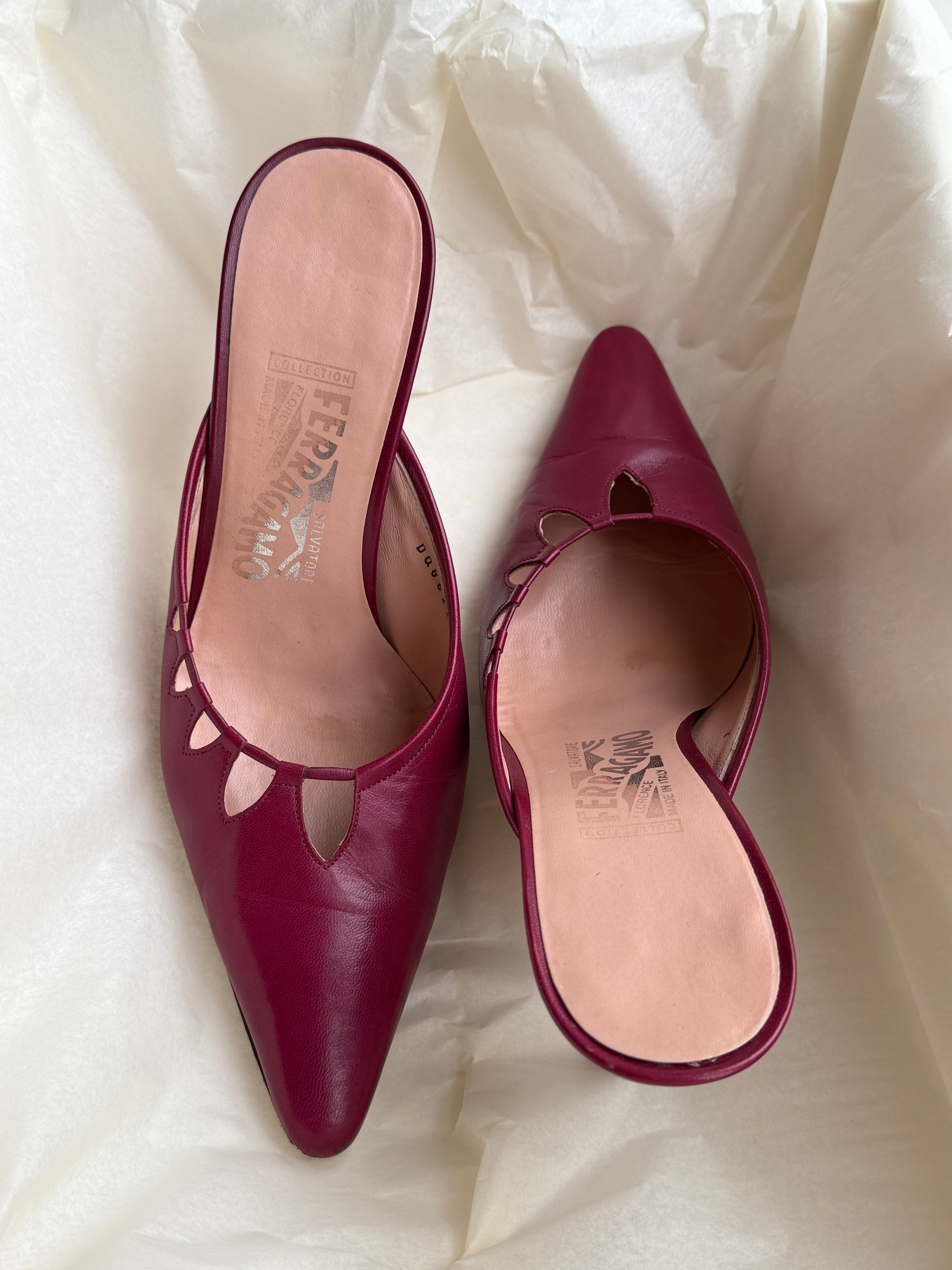 Vintage red leather Salvatore Ferragamo mules with a pointed toe and cut-out detailing.