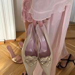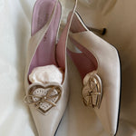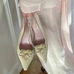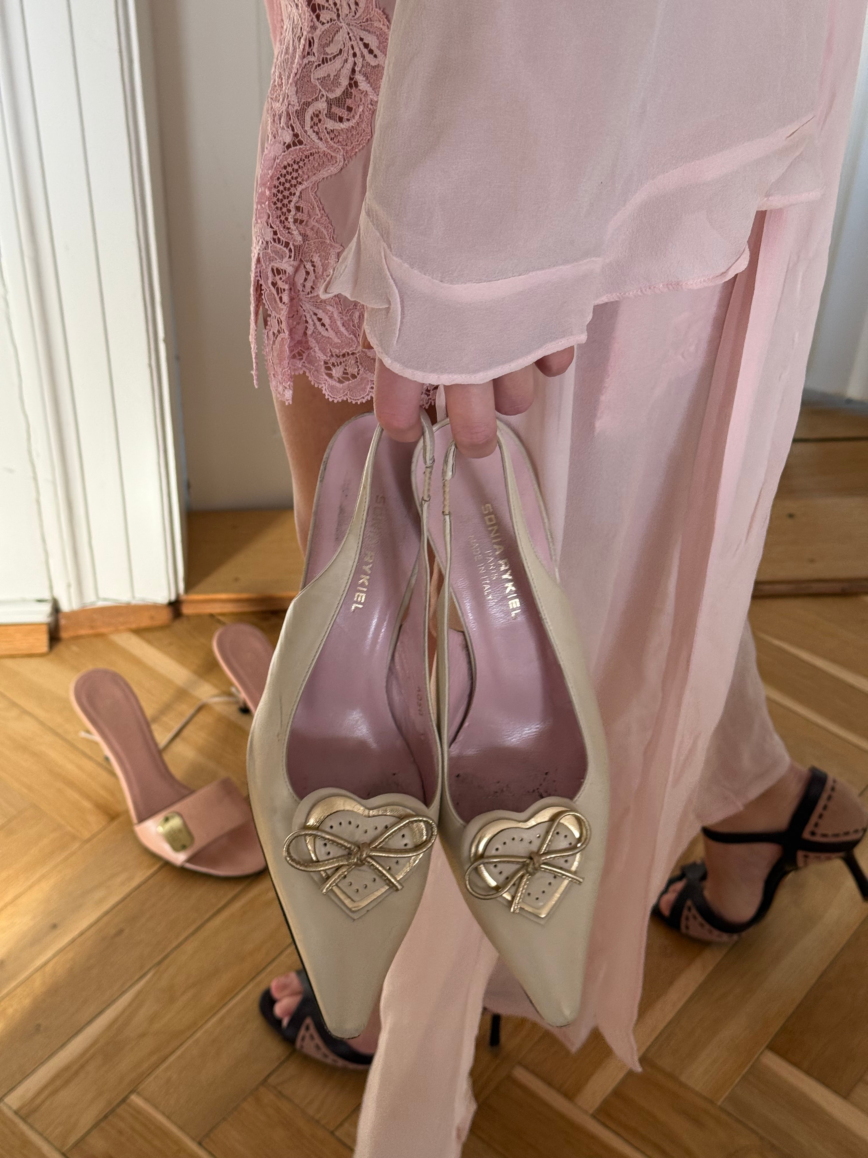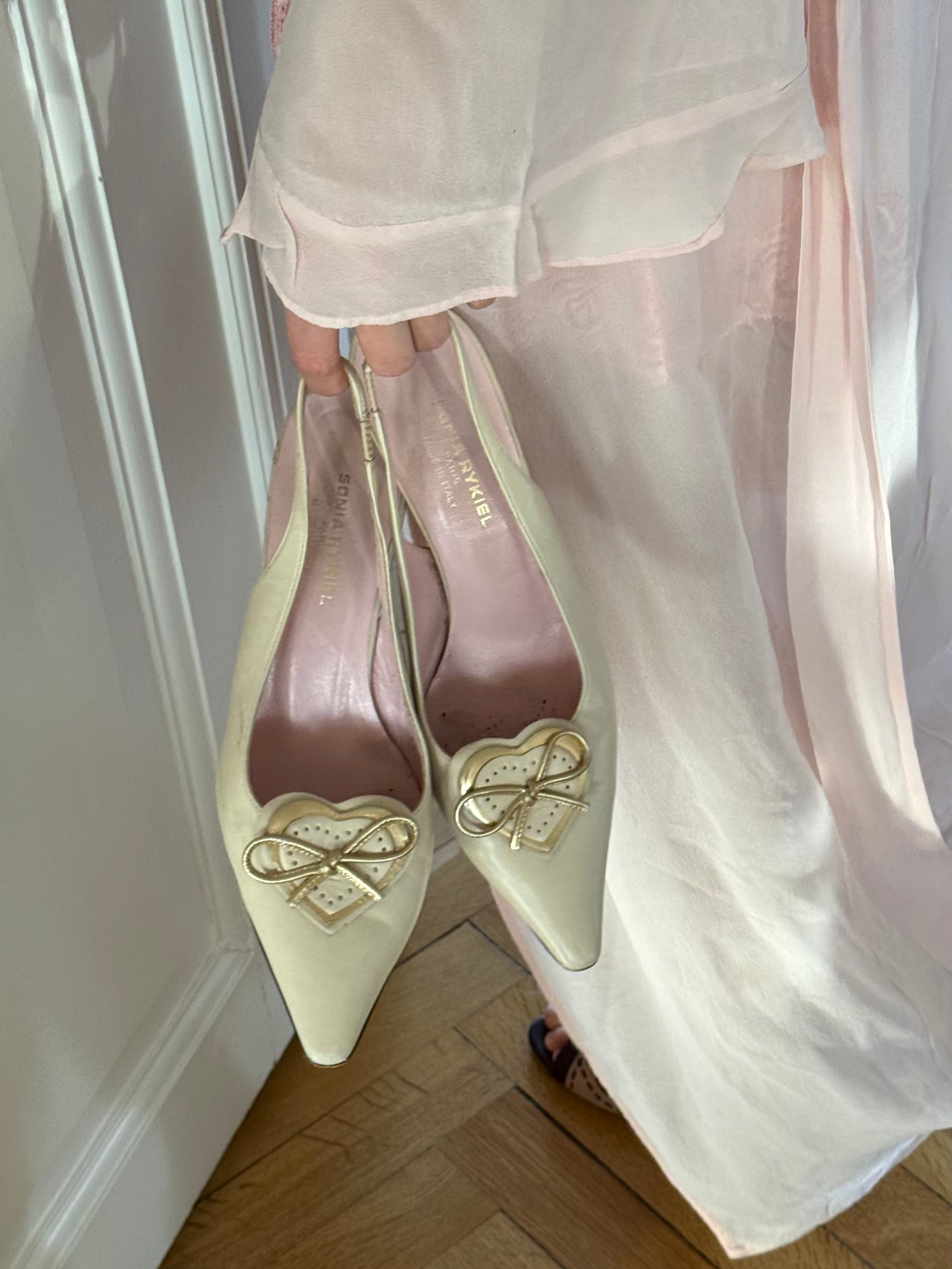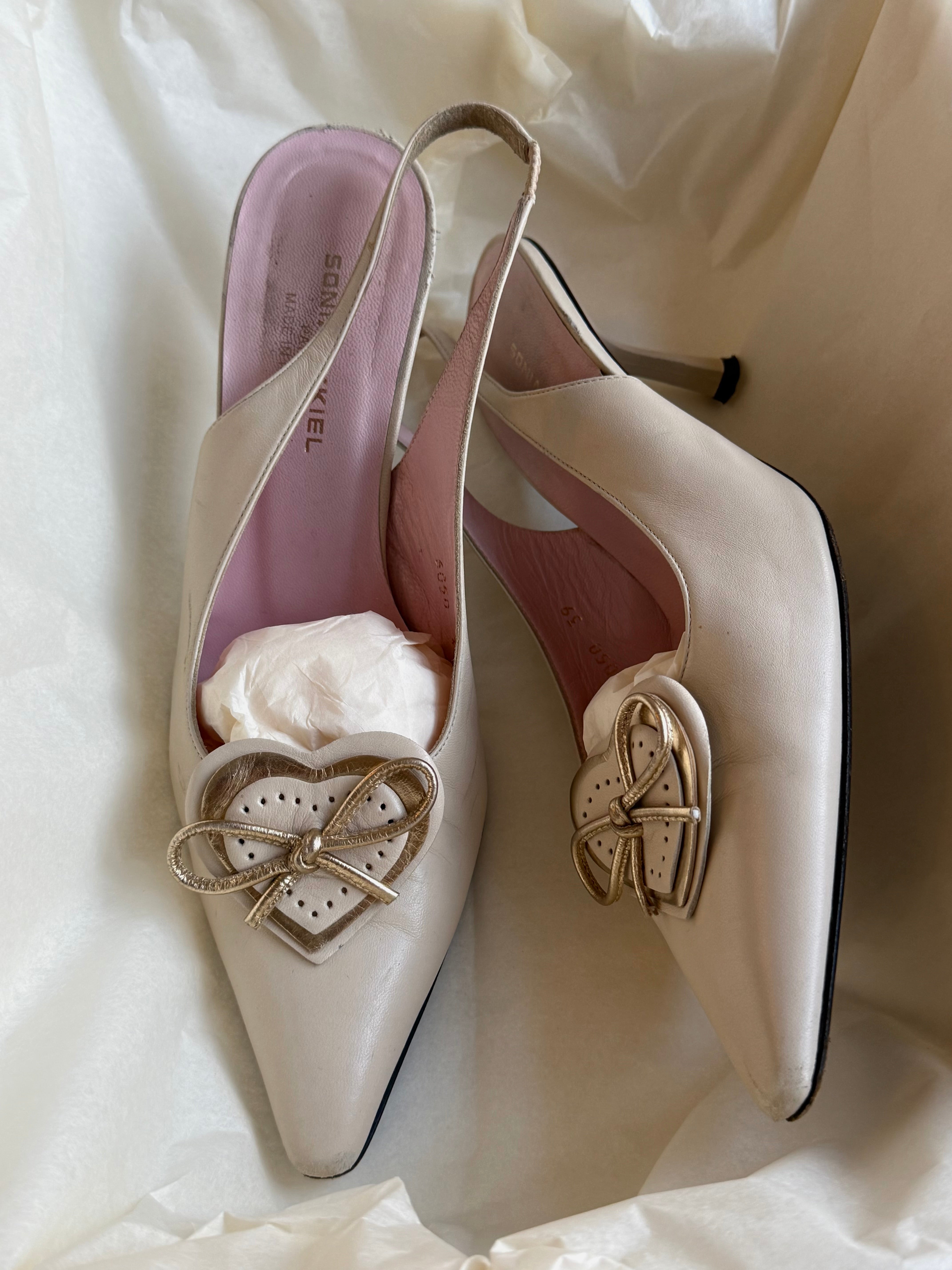 Vintage Sonia Rykiel slingback heels in cream leather with pointed toe and heart bow detail.