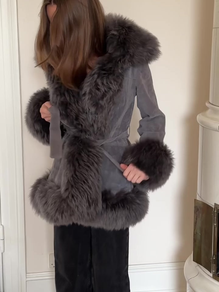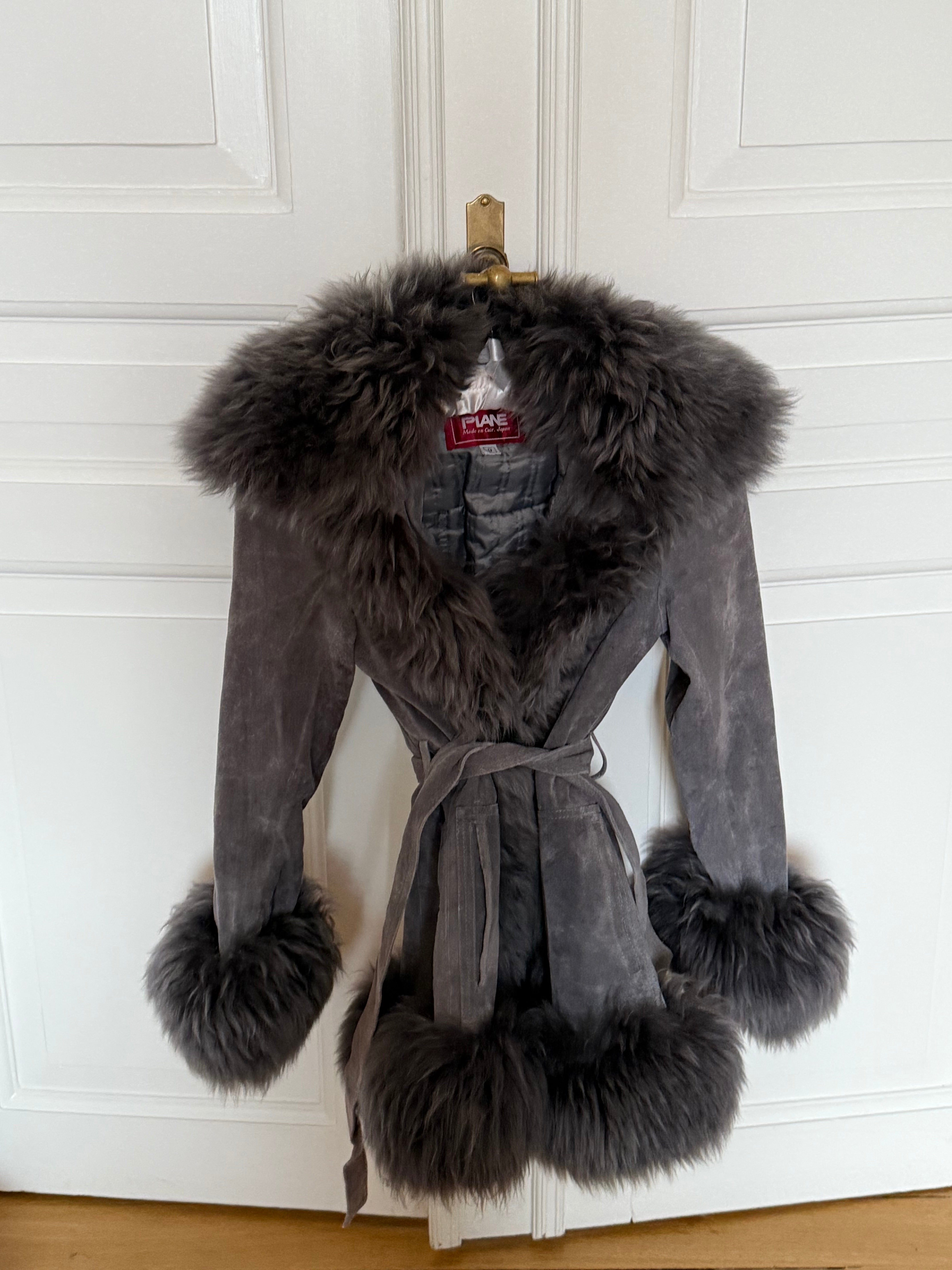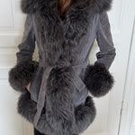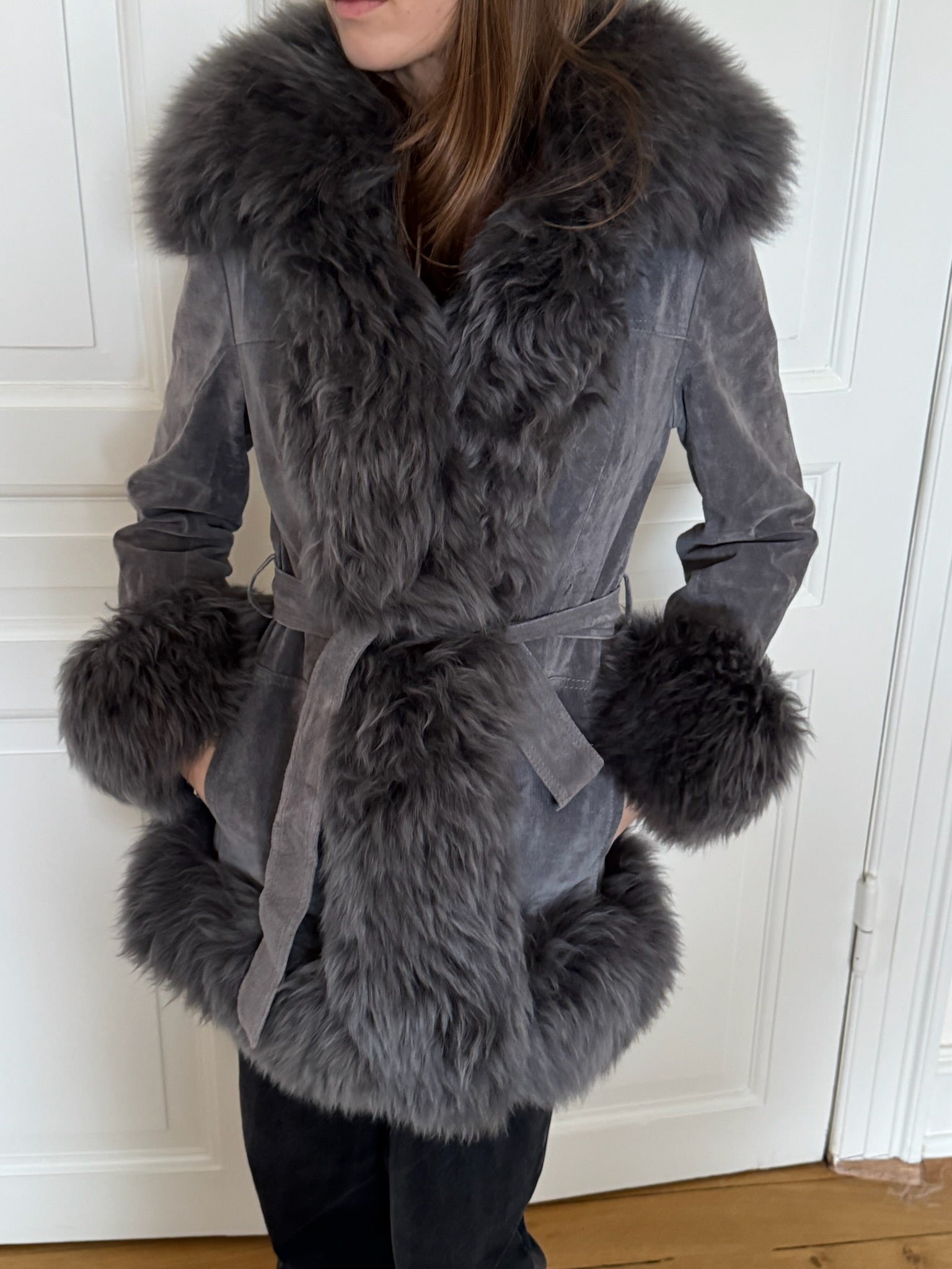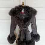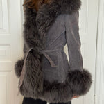 Beautiful warm suede jacket featuring fur trim and a matching tie belt that defines the waist. Designed with a soft quilted lining, wide fur cuffs, a dramatic fur collar, and side pockets.
