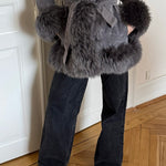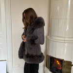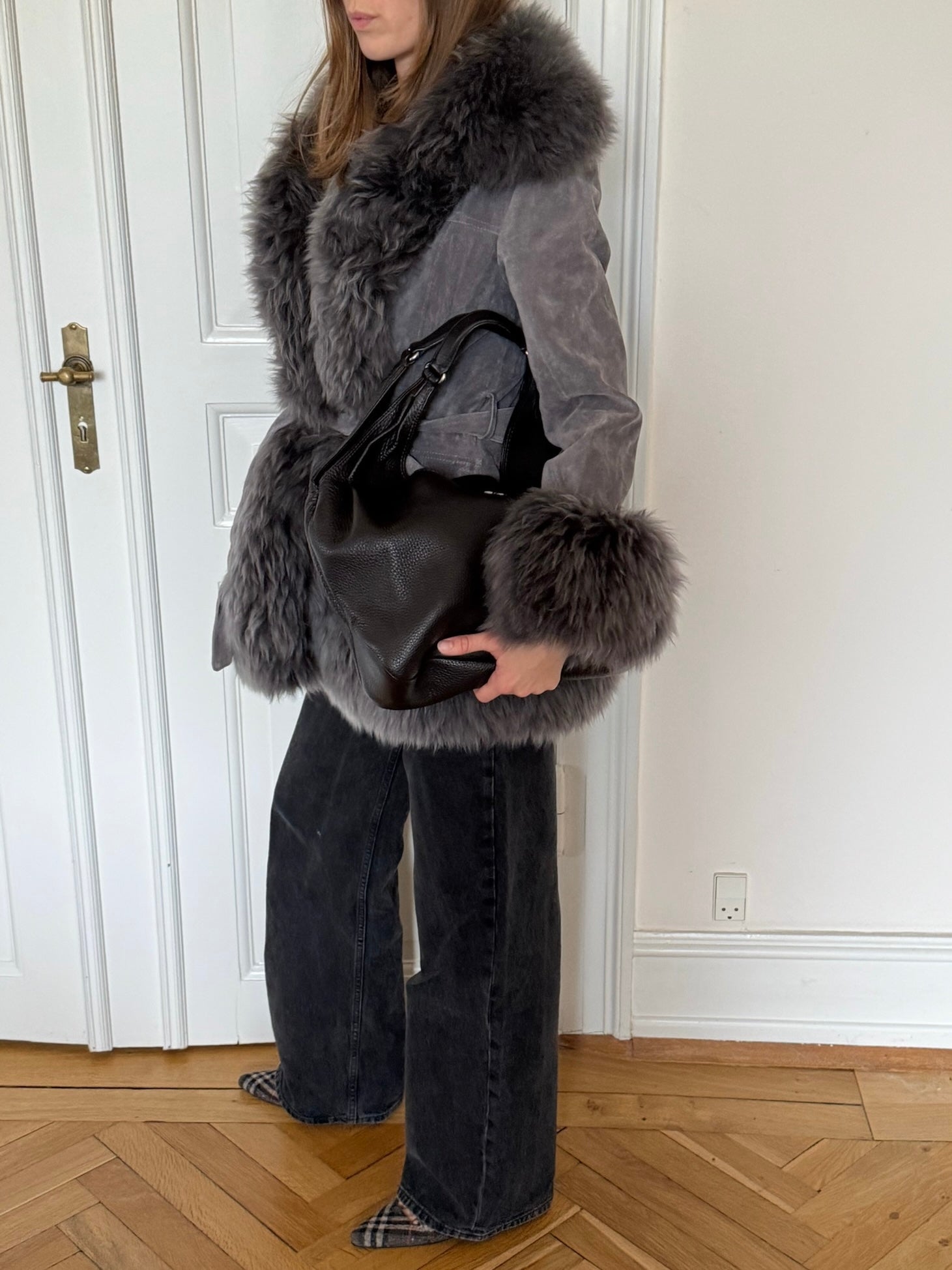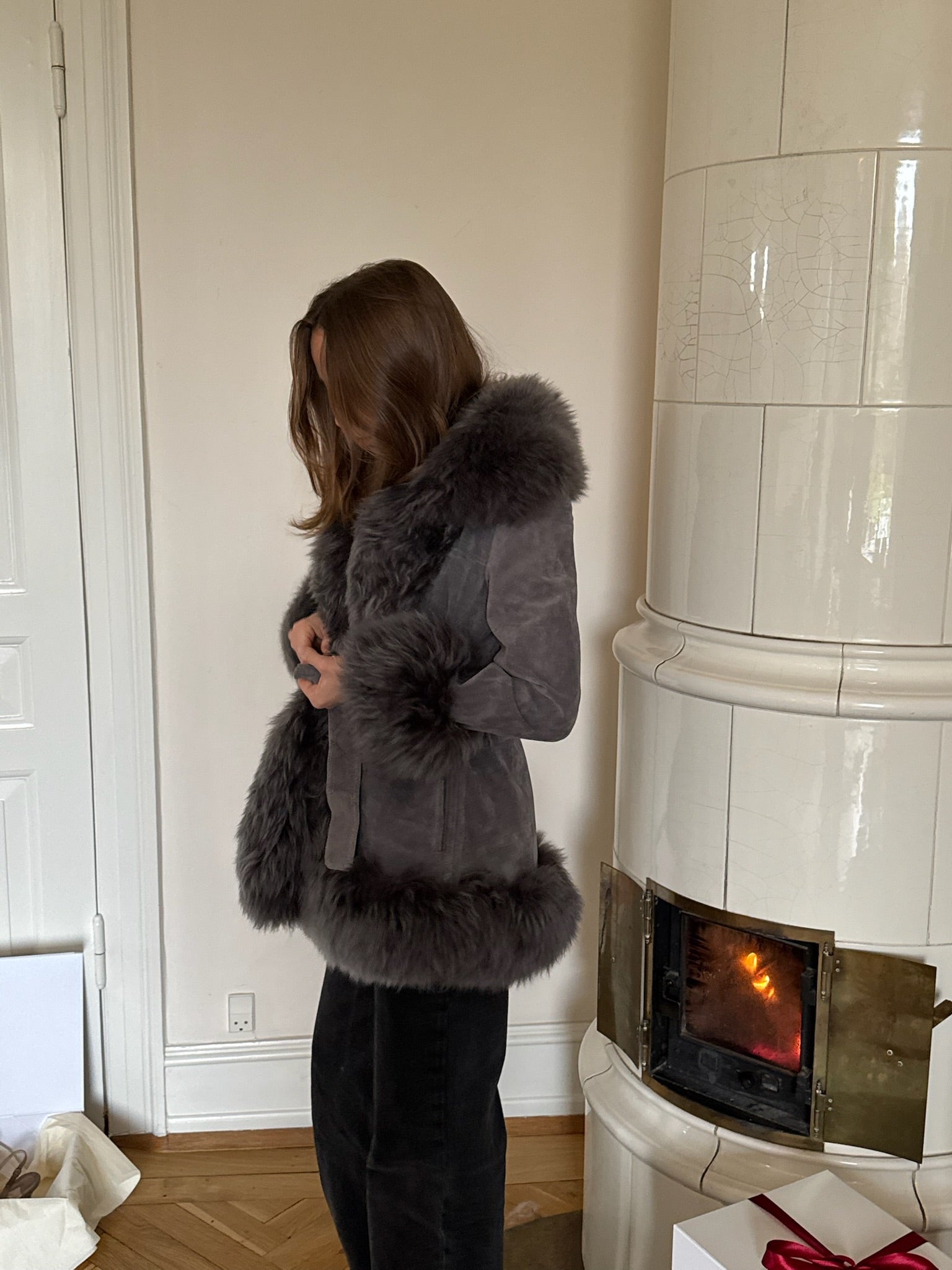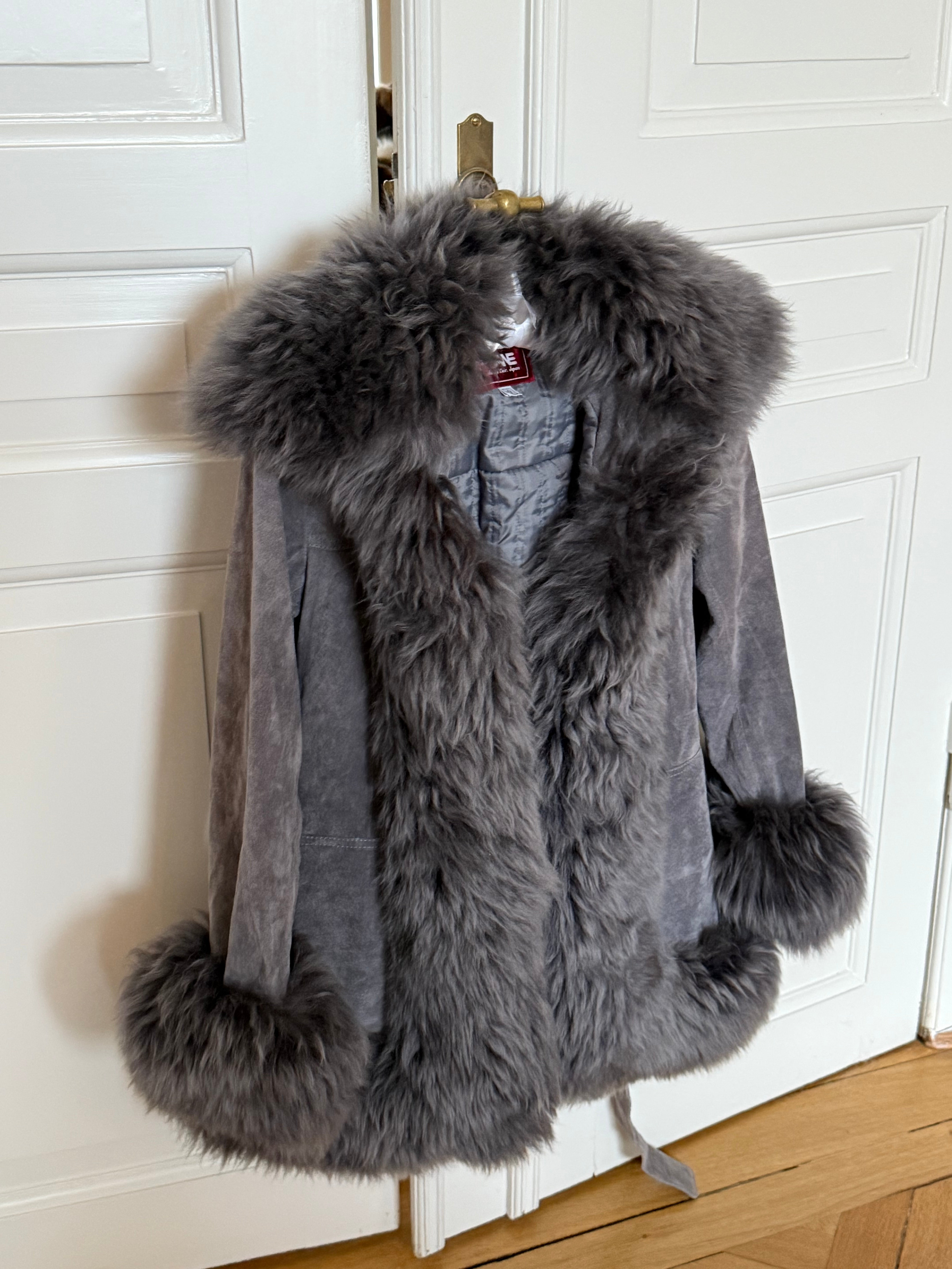 Beautiful warm suede jacket featuring fur trim and a matching tie belt that defines the waist. Designed with a soft quilted lining, wide fur cuffs, a dramatic fur collar, and side pockets.