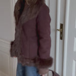 A luxurious vintage brown jacket featuring genuine fox fur along the collar and cuffs. The body of the jacket is crafted from a soft faux-suede exterior with a plush, velvety lining made from an acrylic–polyester blend.