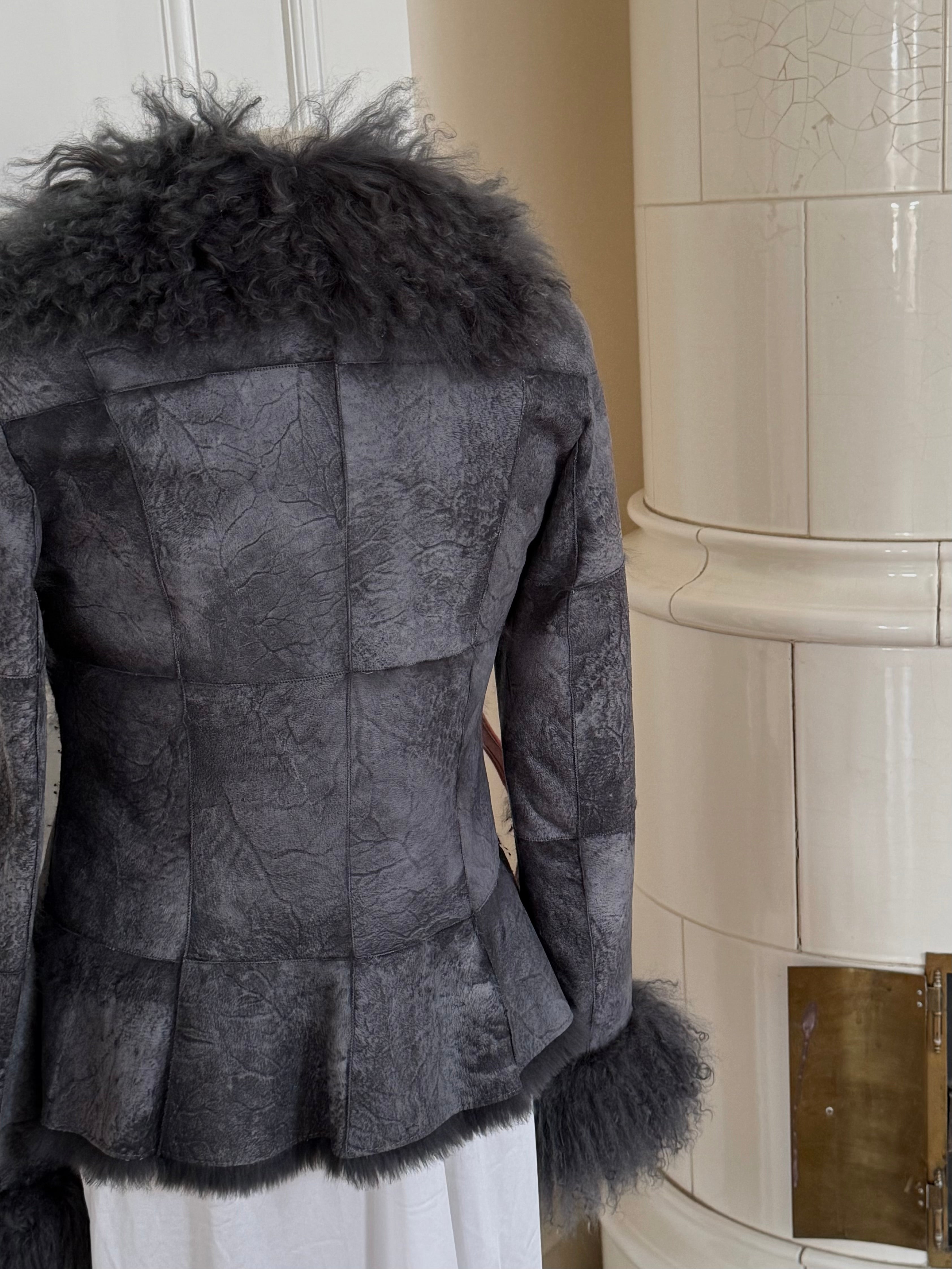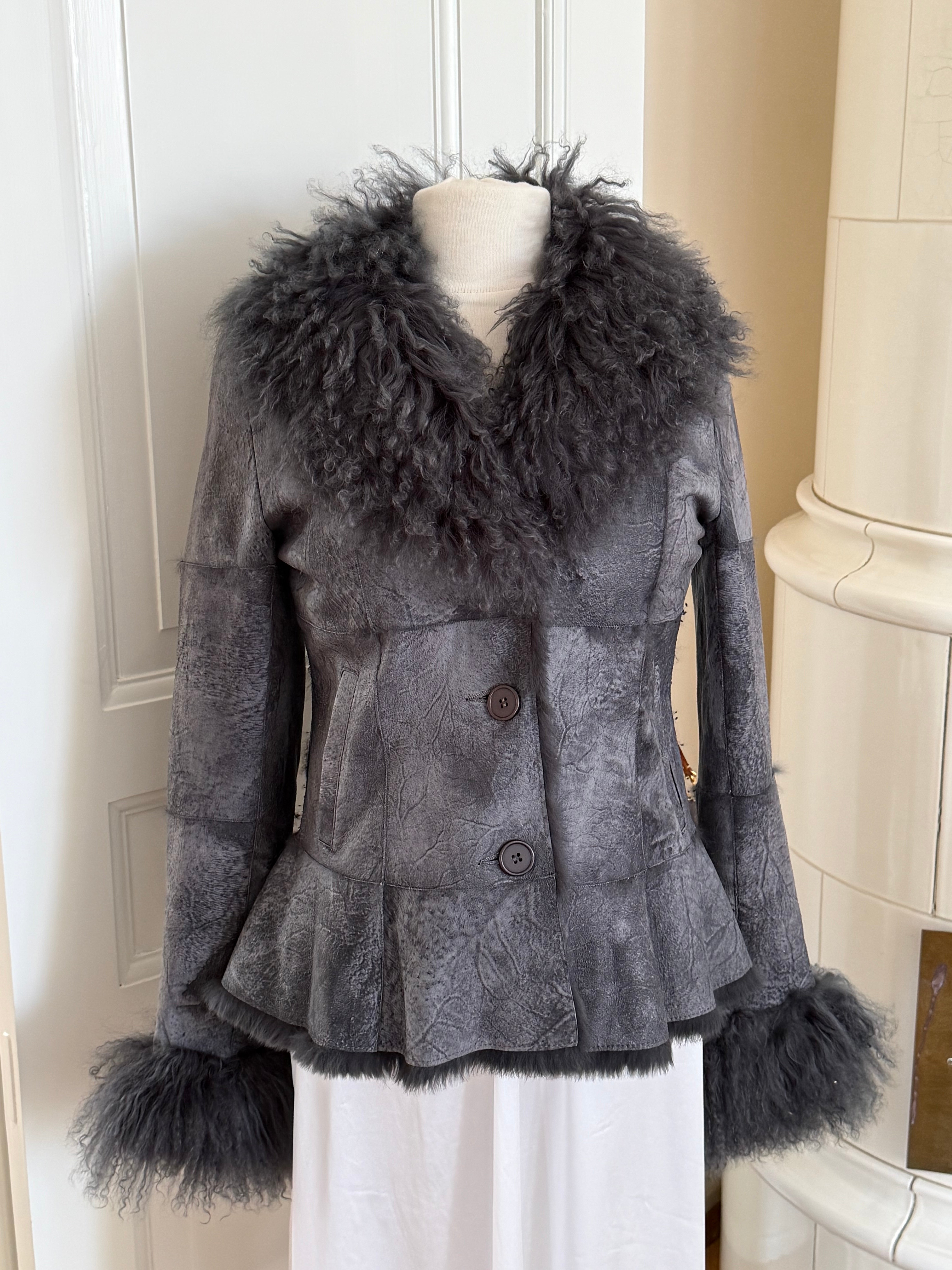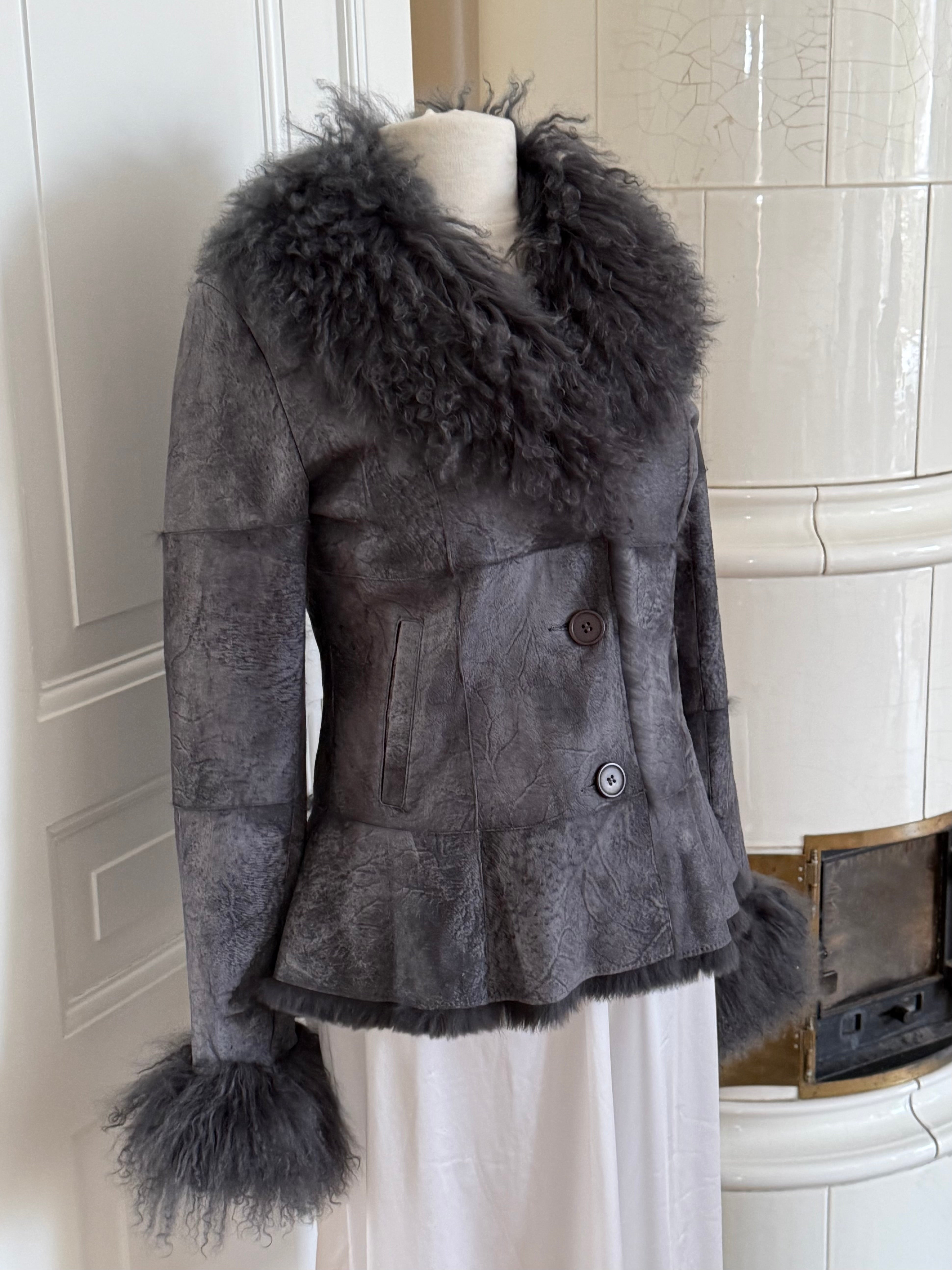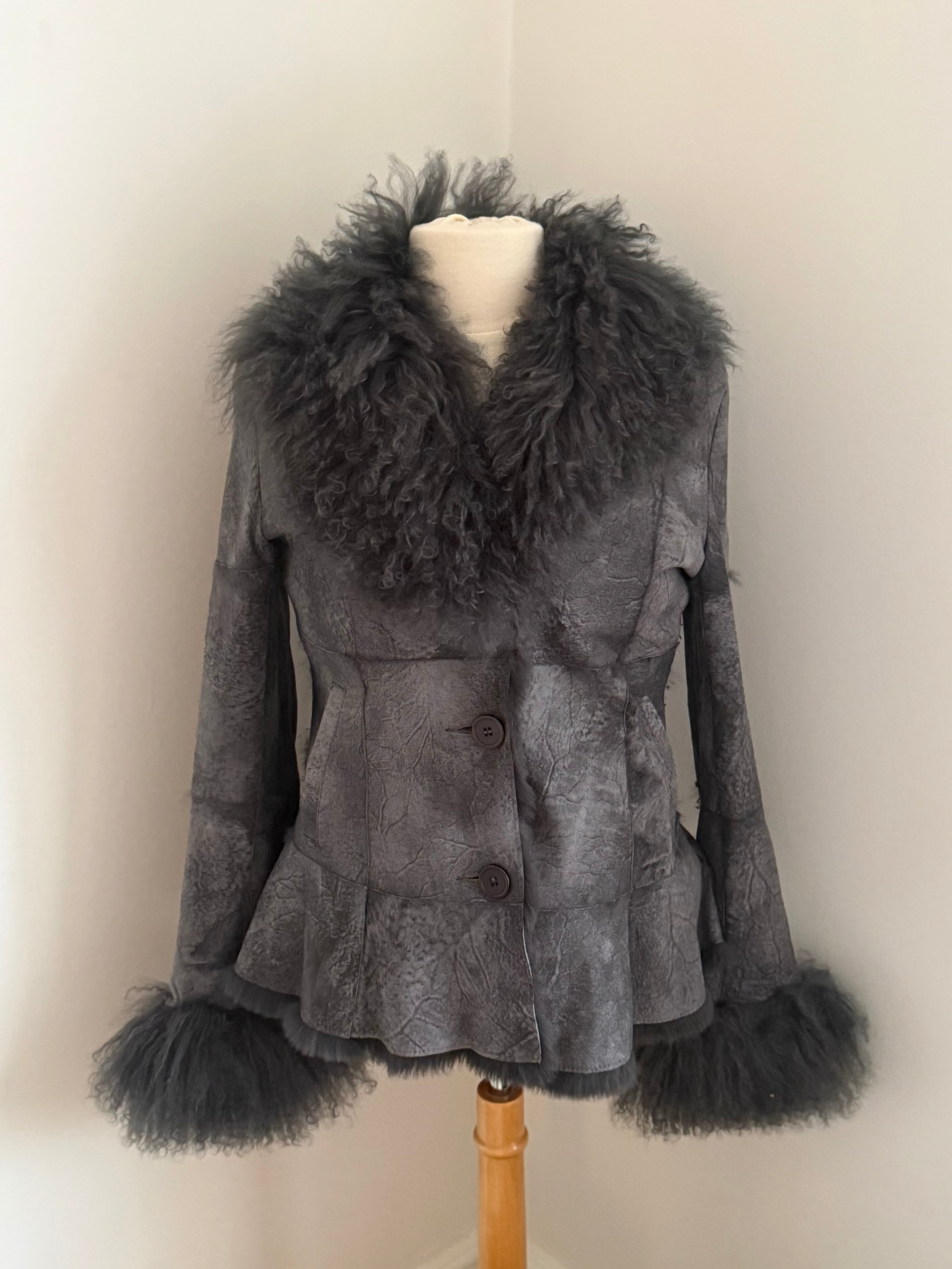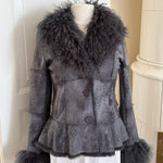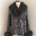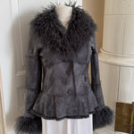 Soft grey jacket crafted from lamb wool with real rabbit fur trim at the collar and cuffs. Lightweight and supple with button closure and side pockets.